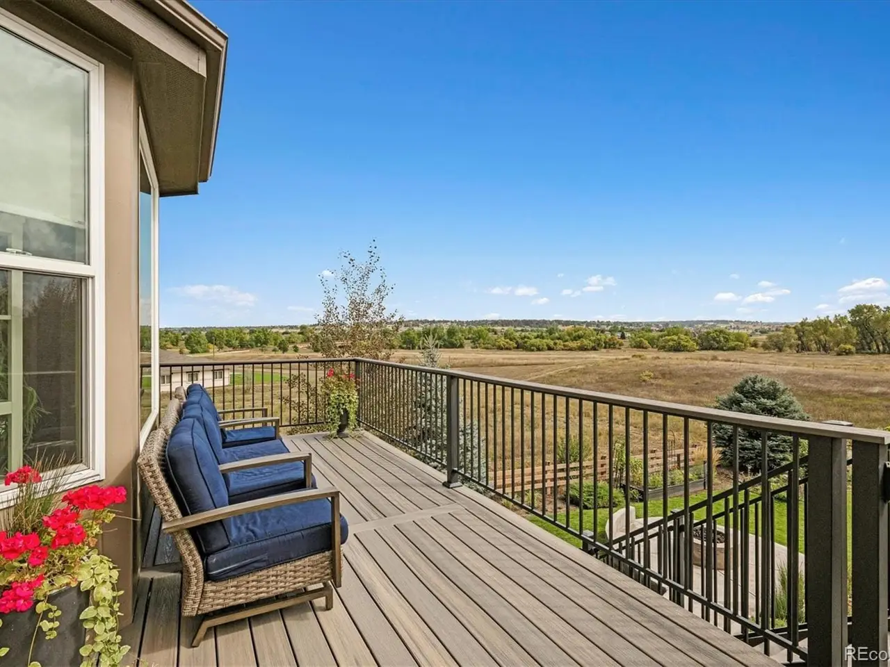 Gorgeous views extend behind your backyard and from the elevated deck in this beautifully updated home—move-in ready and meticulously maintained by the original owners, showcasing true pride of ownership! This rare five-bedroom, four-bathroom home includes two additional quarter bathrooms, a main-level den/bedroom, an oversized three-car garage, and an unfinished walkout basement on a .407-acre fenced lot. The main floor features a formal living room, dining room, and a gourmet kitchen with granite countertops, stainless steel appliances, gas range, and incredible open space views. The family room—also with views—offers a cozy gas fireplace. A powder bath and large laundry/mudroom with cabinetry and sink complete the main level. Upstairs, the elegant curved staircase with iron balusters leads to the spacious primary suite, a second bedroom with ensuite bath, and two additional bedrooms connected by a Jack and Jill bathroom, each with its own private vanity area. Numerous updates throughout include a backyard retreat with an expanded patio, built-in firepit, hot tub (included), evening lighting, and mature landscaping—all designed for relaxing and entertaining while enjoying breathtaking Colorado scenery. Backing to McMurdo Gulch and the Cherry Creek Trail, this home offers Colorado living at its finest! Located just a few blocks from Pradera Golf Club—drive your personal golf cart to the clubhouse and enjoy everything this exclusive community has to offer. Neutral décor, extensive interior updates, walkout access, fenced yard, and impeccable maintenance make this home truly move-in ready. A full list of upgrades is available upon request.
