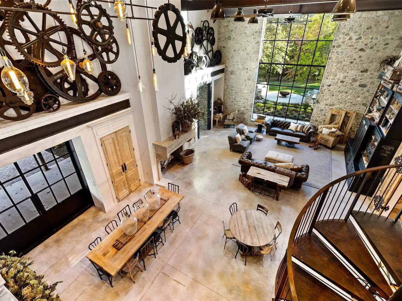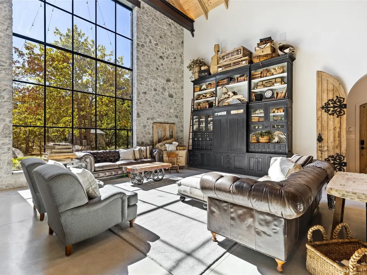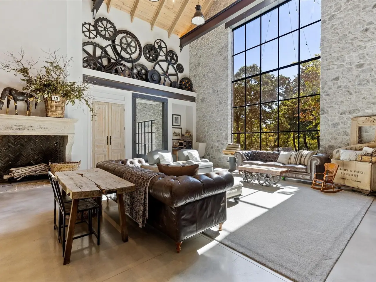 Masterfully designed Belgian Chateau gated and purposefully situated on three-acre estate lot enveloped by beautiful mature trees. This home gives a nod to a soft industrial feel with large steel framed windows and doors that blur the lines between indoor and out. Four bed, 3.5 bath open floorplan, you'll see imported European tile, stained concrete floors, ornate bluestone features and custom antique doors and shutters. Glass breezeway leads to primary suite overlooking a private, picturesque garden oasis also has steam shower and fireplace. Ample storage, 4 garage stalls and an impressive 800-plus square foot studio loft apartment. This home won HGTV's Ultimate House Hunt 2023 Kitchen Category! Custom Thermador vent-a-hood, range, Sub-Zero refrigerator, leathered granite countertops, distinctive custom cabinetry perfects a fusion of beauty and functionality. Host elegant evening events by opening the steel doors to the courtyard lit by unique antique fixtures and splash pad creating the perfect ambiance.