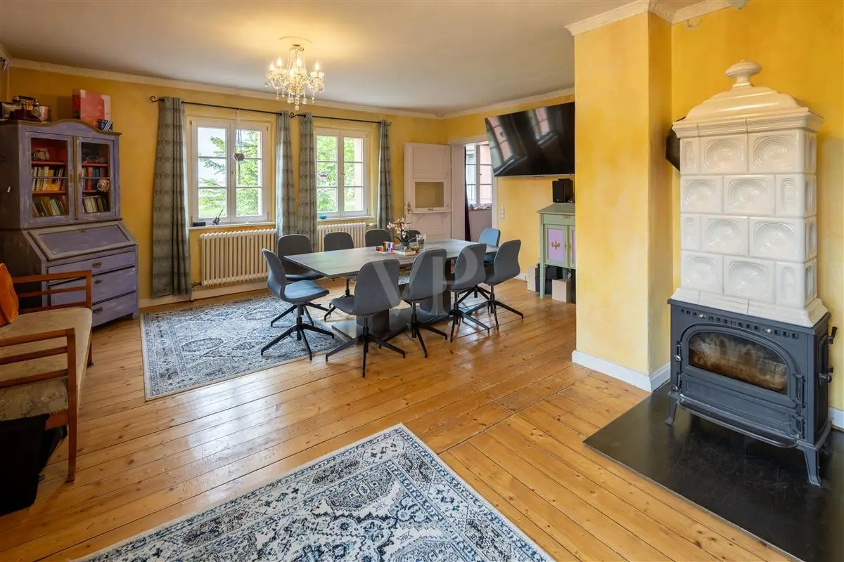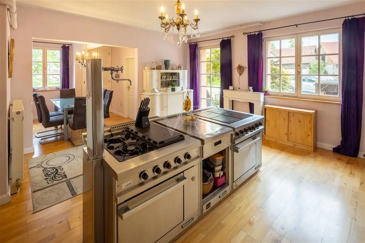 A unique property from 1924, which has been extensively modernized until 2023, awaits you. With a total living space of approx. 431 m², the house offers a successful fusion of historical charm and contemporary comfort. The solid brickwork and the cleverly thought-out room layout invite you to explore. The property has been extensively renovated and offers a wide range of features: Extensive refurbishment measures were carried out back in 2004 - including the partial draining of the basement (except for the side of the driveway next to the house and the area by the entrance to the laundry room and basement apartment), the fundamental renewal of the house electrics and the modernization of the bathrooms. The wooden windows, which were renewed and partially enlarged at the same time, have double glazing and are characterized by masterful craftsmanship. The full thermal insulation installed in 2010/2011 perfectly complements the solar water heating system installed in 2010 and significantly increases energy efficiency. In 2020, the property received a new distribution box in the basement. As part of this, the electrics were also improved and renewed in parts. A modern fitted kitchen was installed on the second floor in 2021. This is equipped with high-quality Siemens and Bosch appliances - including an extractor fan, a ceramic hob, an oven, a dishwasher and a fridge-freezer. In addition, a photovoltaic system with a capacity of 13.5 kWp was installed in 2023, which, in combination with the newly installed wall box, enables a sustainable energy supply. The central heating supply is provided by an oil heating system and is supplemented by a total of six wood-burning stoves in the house, including several Swedish stoves. One solid fuel burner is present and in working order, but no longer has current approval. The wooden floorboards laid throughout give the rooms a warm, authentic atmosphere. A professional kitchen on the first floor is waiting to support your culinary ambitions. Equipped with two gastro ovens, electric and gas hobs as well as other Bosch appliances, it offers ideal conditions for extensive cooking pleasure. The second floor can be used as an independent living unit and offers the opportunity to enjoy an unobstructed view of the Ried as well as Bad Wurzach, Dietmanns and Ellwangen from the spacious terrace - an exceptional highlight of this property. On the second floor, there are four bedrooms, a bathroom and two unfinished rooms. One of the unfinished rooms already has partially prepared water connections and can be converted into a further bathroom. The top floor offers additional development potential - it currently houses a small hobby room. The spacious outdoor facilities are another highlight of this property. A lovingly designed garden paradise extends over approx. 3,744 m² with several terraces, a balcony, a pavilion, a garden shed and a decorative fountain. The stylish garden design invites you to linger and enjoy. Parking is available and rounds off the offer. Overall, this is a stately property that impresses with its successful combination of historical flair and modern living comfort. Ideal for people who are looking for and appreciate a stylish retreat with a variety of uses. A viewing offers the best opportunity to discover the full potential of this property.