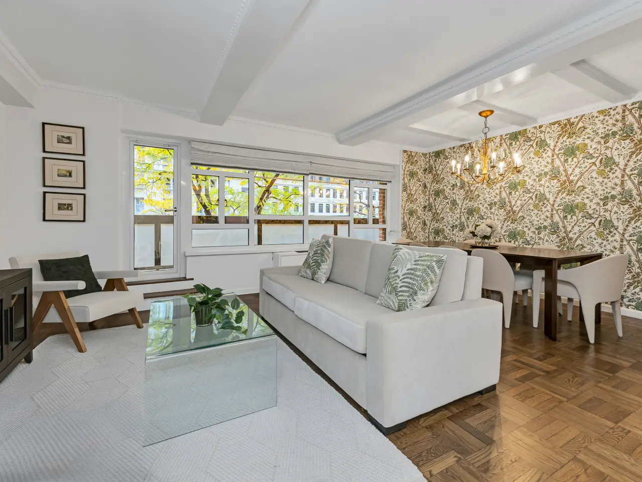 Welcome to Apartment 3B at 750 Park Avenue, a stunning and sophisticated one-bedroom, one-bathroom residence that exemplifies refined Park Avenue living. Renovated and move-in ready, this elegant home blends timeless design with thoughtful modern updates, offering an unparalleled living experience in one of Manhattan's most prestigious cooperatives. A gracious entrance foyer opens into an expansive living and dining area, bathed in natural light from floor-to-ceiling East-facing windows. The space seamlessly extends onto a private balcony, providing serene, birds-eye views of tree-lined Park Avenue-a perfect retreat for morning coffee or evening relaxation. The primary bedroom serves as a tranquil sanctuary, generously proportioned to accommodate a king-sized bed and a cozy seating area. Oversized windows frame beautiful Park Avenue vistas, while custom closets, including a built-in Elfa storage system and a secure safe, provide abundant and well-designed storage solutions. Every detail of this home reflects quality and care. The entire residence has been freshly painted using Benjamin Moore Aura paint, including ceilings, beams, walls, and trim. Enhanced lighting and electrical upgrades include new wiring and outlets, Visual Comfort light fixtures throughout, and a new Visual Comfort ceiling fan in the primary bedroom. The entertaining area features custom beams with recessed lighting and a remote-controlled dimmer system for perfect ambiance. Additional enhancements include brand-new A/C units, hidden cable wiring, cordless Roman shades in the living area, and blackout shades with side panels in the bedroom. A tasteful wallpaper accent in the dining room adds warmth and texture, and can be easily removed if desired. Washers and dryers may be installed with Board approval. This sophisticated residence is housed in a distinguished 17-story red-brick cooperative, designed by Horace Ginsbern & Associates in 1951 and converted to cooperative ownership in 1981. Located at the coveted corner of Park Avenue and 72nd Street, the building is a timeless symbol of classic Upper East Side architecture and prestige. Residents enjoy full-service, including a 24-hour doorman, live-in resident manager, laundry facility, bike storage, package room, and additional storage when available. Pied-à-terre ownership is allowed. There is no subletting in the building. (Please note there is a $12,500 move-in fee for the buyer.) Positioned just two blocks from Central Park, and moments from the exclusive boutiques of Madison Avenue, world-renowned museums, and Manhattan's finest dining establishments, 750 Park Avenue offers a lifestyle of effortless luxury, culture, and convenience. Residence 3B at 750 Park Avenue-is the perfect home for those seeking the quintessential Park Avenue experience.