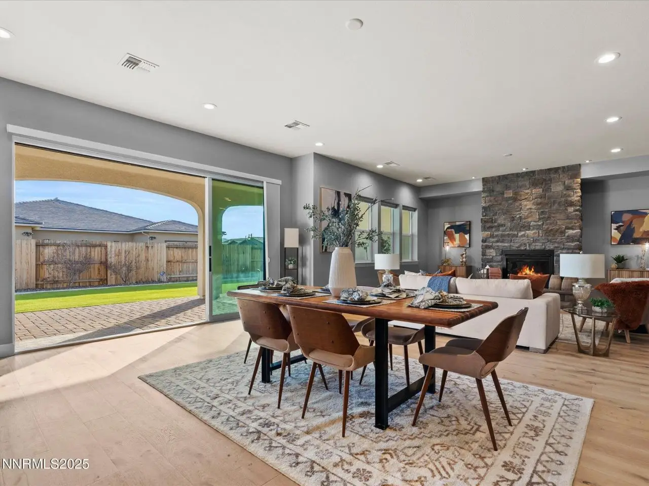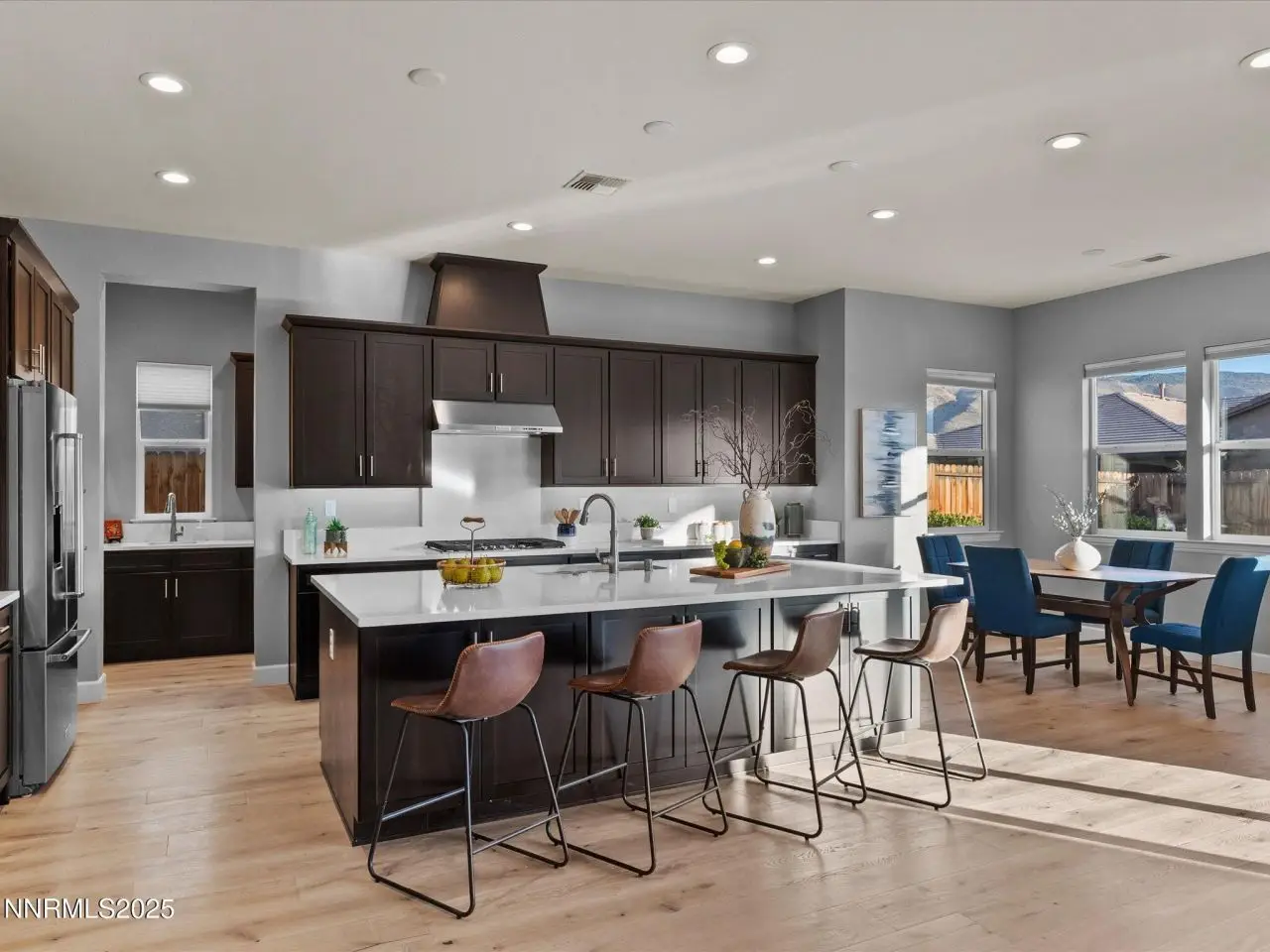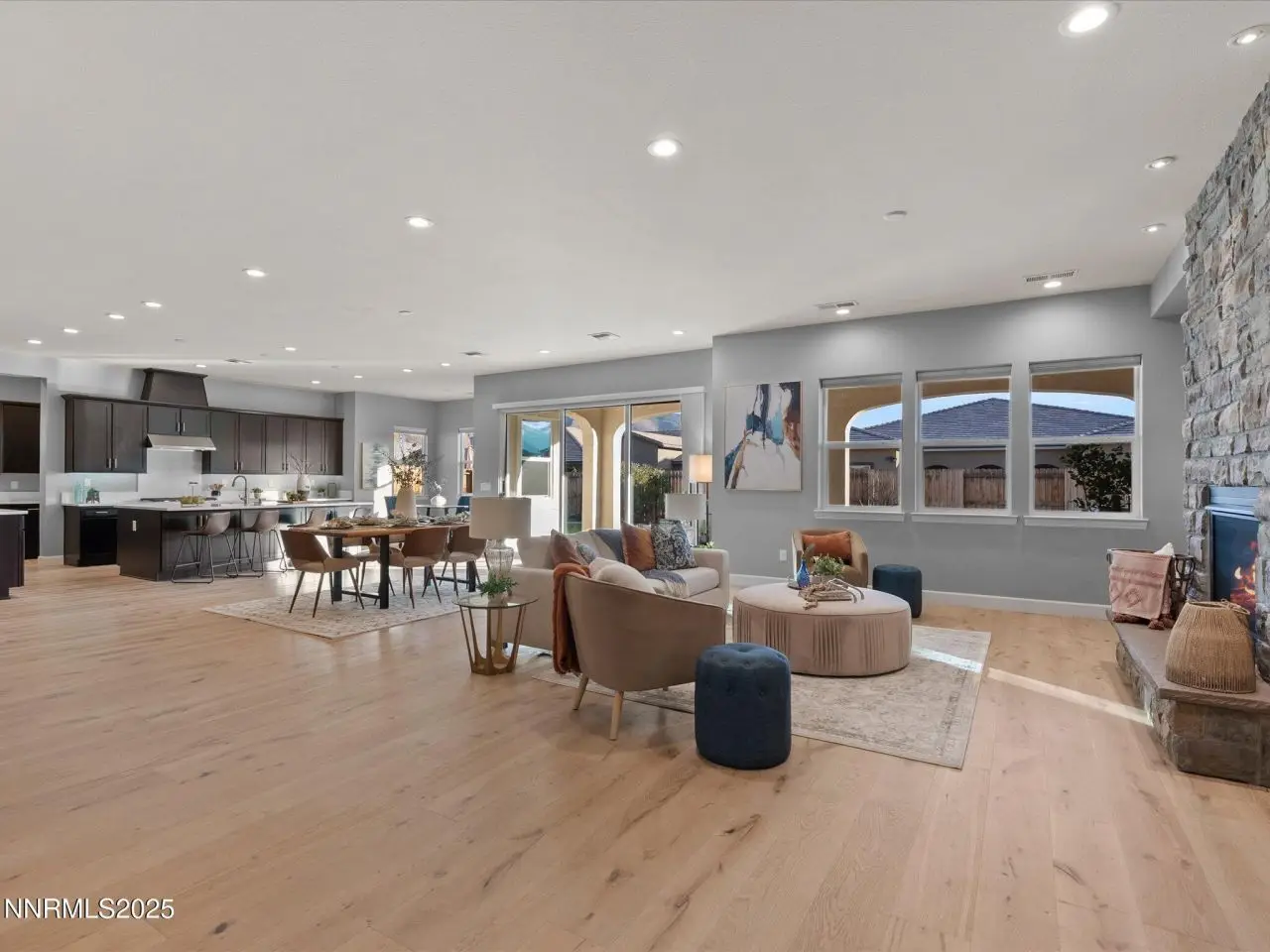 Experience relaxed, modern living in this stunning home in the gated Sorrento Trail community of Bella Vista Ranch in South Reno. Set on a premium corner lot, this property offers peak views of the Mt. Rose ski area and the Sierra Nevada mountains and professionally-designed, low-maintenance landscaping. A private, gated front courtyard leads to the covered entry area. Inside, wide wood-plank floors flow seamlessly from the foyer into the expansive great room. The heart of the home features a radiant fireplace, an open kitchen ideal for entertaining, two dining areas and a remarkable 12-foot sliding door system framing the covered patio. KitchenAid appliances, dark cabinets with under-cabinet lighting. Quartz counters define the work area of the kitchen, with a spacious adjoining butler's pantry with more work space cabinets and a prep sink -- plus there's a walk-in pantry. This home includes five well-appointed bedrooms, four full baths and a powder room. The thoughtfully-designed layout caters to many lifestyles: multi-generational living, a dedicated office and exercise or hobby spaces. The primary suite is a true retreat, featuring a lavish bathroom with a huge shower with multiple shower heads, a soaking tub, two vanities, and a generous walk-in closet. Down one hall, two bedrooms share a convenient Jack-and-Jill bath. Near the foyer, the fourth bedroom suite has a sliding glass door to the front courtyard. The fifth bedroom suite is tucked away off the kitchen. The 12-foot, multi-panel sliding glass door opens from the great room to the covered back patio, which is equipped with two gas stubs and extra electrical outlets, providing an ideal outdoor entertaining space. Bella Vista Ranch offers residents access to a vibrant community clubhouse, a saltwater swimming pool with lap lanes and a play area. Walking/biking trails surround the community, which is just off Veteran's Parkway. Nick Poulakidas Elementary school is a 5 minute walk from this home. Don't miss your chance to see this incredible property-schedule your showing today!