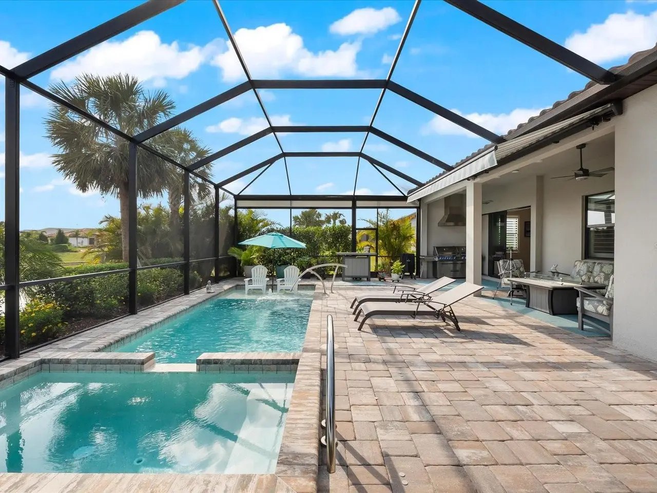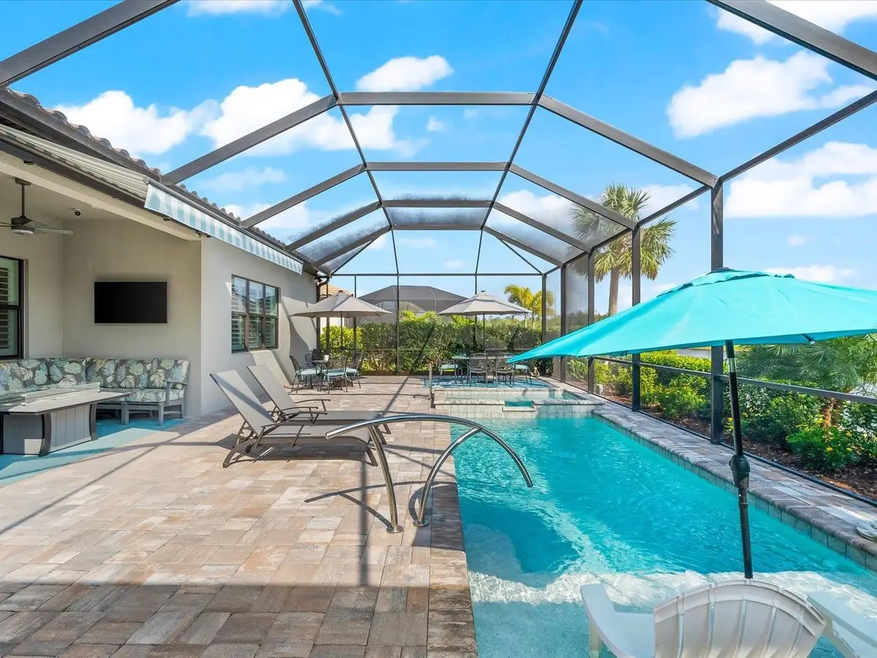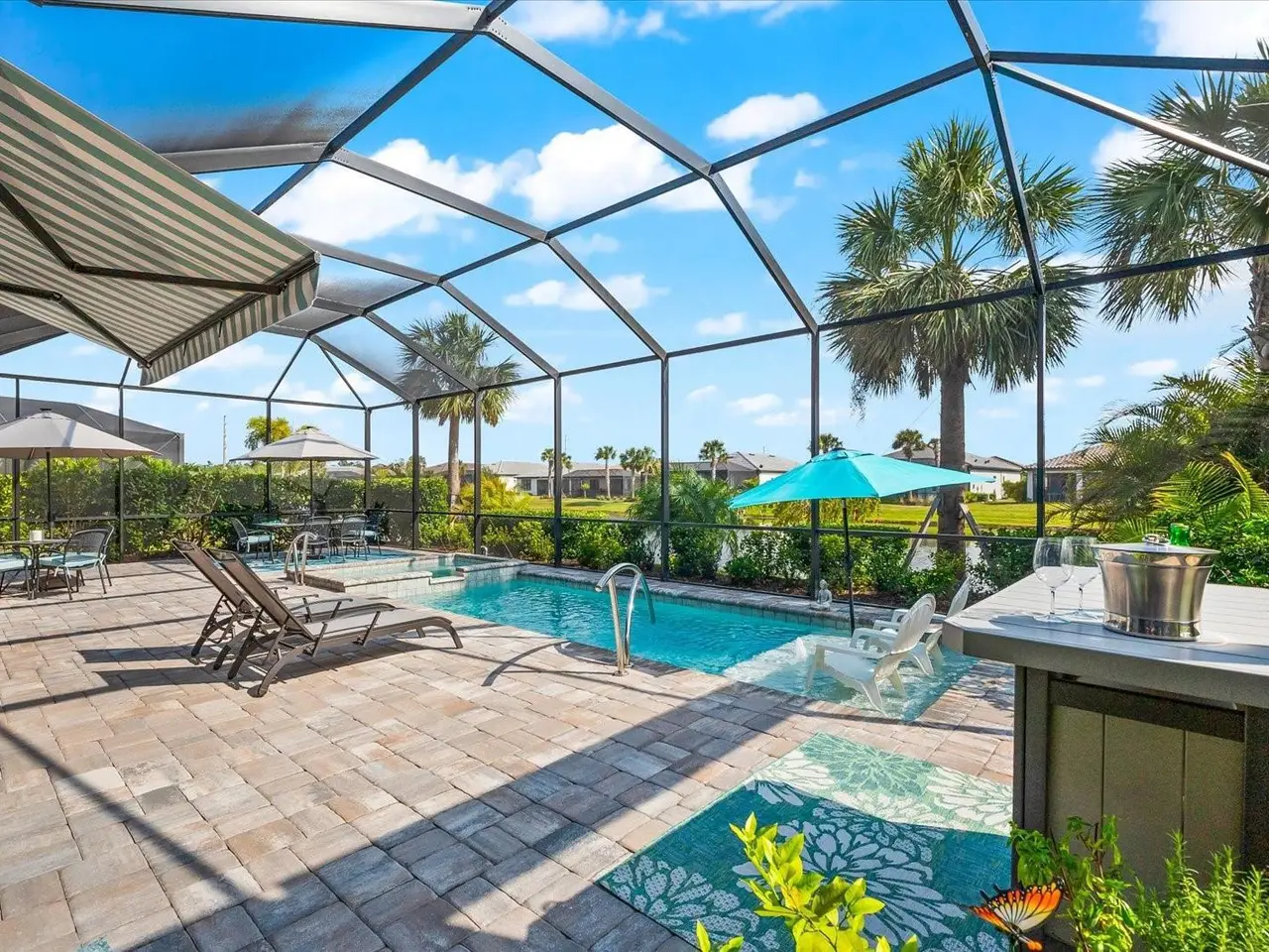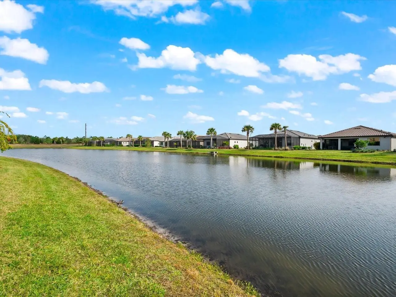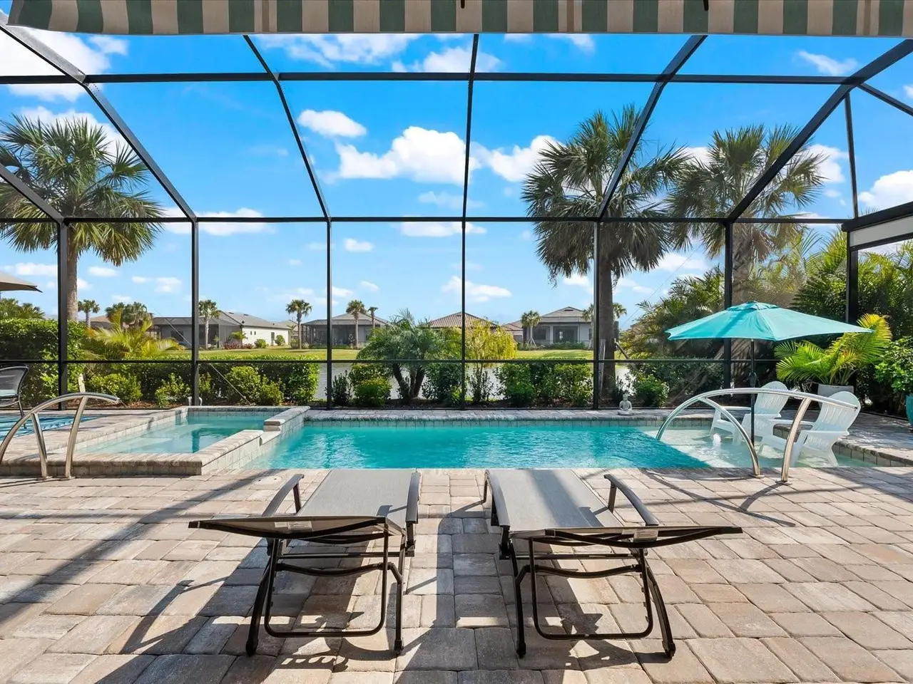 Modern Comfort Meets Resort-Style Living in Del Webb Lakewood Ranch. Welcome to easy, elegant living in the heart of Del Webb Lakewood Ranch—one of the area's most desirable 55+ communities. Set on a premium south-facing waterfront lot, this beautifully upgraded Renown floor plan offers everything you need for comfort, style, and low-maintenance Florida living. Step inside to discover an open, airy layout with three spacious bedrooms, 3.5 bathrooms, and a flexible bonus room—perfect for a home office, hobby space, or additional living area. Thoughtful upgrades shine throughout the home, from tray ceilings and crown molding to plantation shutters and impact-resistant windows and doors. The gourmet kitchen is a standout feature, complete with Bosch induction cooktop, built-in double ovens, stainless steel range hood, two-zone wine fridge, wine rack, reverse osmosis system, touchless faucet, custom cabinetry, and a perfectly organized walk-in pantry. The oversized island is the heart of the home—ideal for casual dining, entertaining, or prepping meals in style. The owner’s suite is your personal retreat, featuring a luxurious bath with dual vanities, an oversized walk-in shower, private water closet, and two custom walk-in closets. Two additional guest suites, each with their own private bath and walk-in closet, offer comfort and privacy for visitors. Enjoy peace of mind with a whole-house 24kW generator, water softener system, and an extended three-car garage with built-in storage and epoxy floors. A separate powder room, drop zone, and large laundry room add to the home’s smart and functional design. Love the outdoors? You’ll appreciate the custom-designed heated saltwater pool and spa, extended brick-paver lanai, automatic sunshades, awning, and panoramic water views—perfect for relaxing or entertaining year-round. Large pocket sliding doors open wide to blend indoor and outdoor living effortlessly. Living in Del Webb Lakewood Ranch means more than just a beautiful home—it’s a lifestyle. Enjoy access to top-tier amenities including six tennis courts, eight pickleball courts, bocce ball, a fitness center with group classes, a resort-style and lap pool, on-site restaurant and bar, and endless social opportunities organized by a full-time Lifestyle Director. With close proximity to Gulf Coast beaches, airports, shopping, dining, and culture, this home truly has it all. Move-in ready and meticulously maintained—don’t miss the opportunity to make it yours.