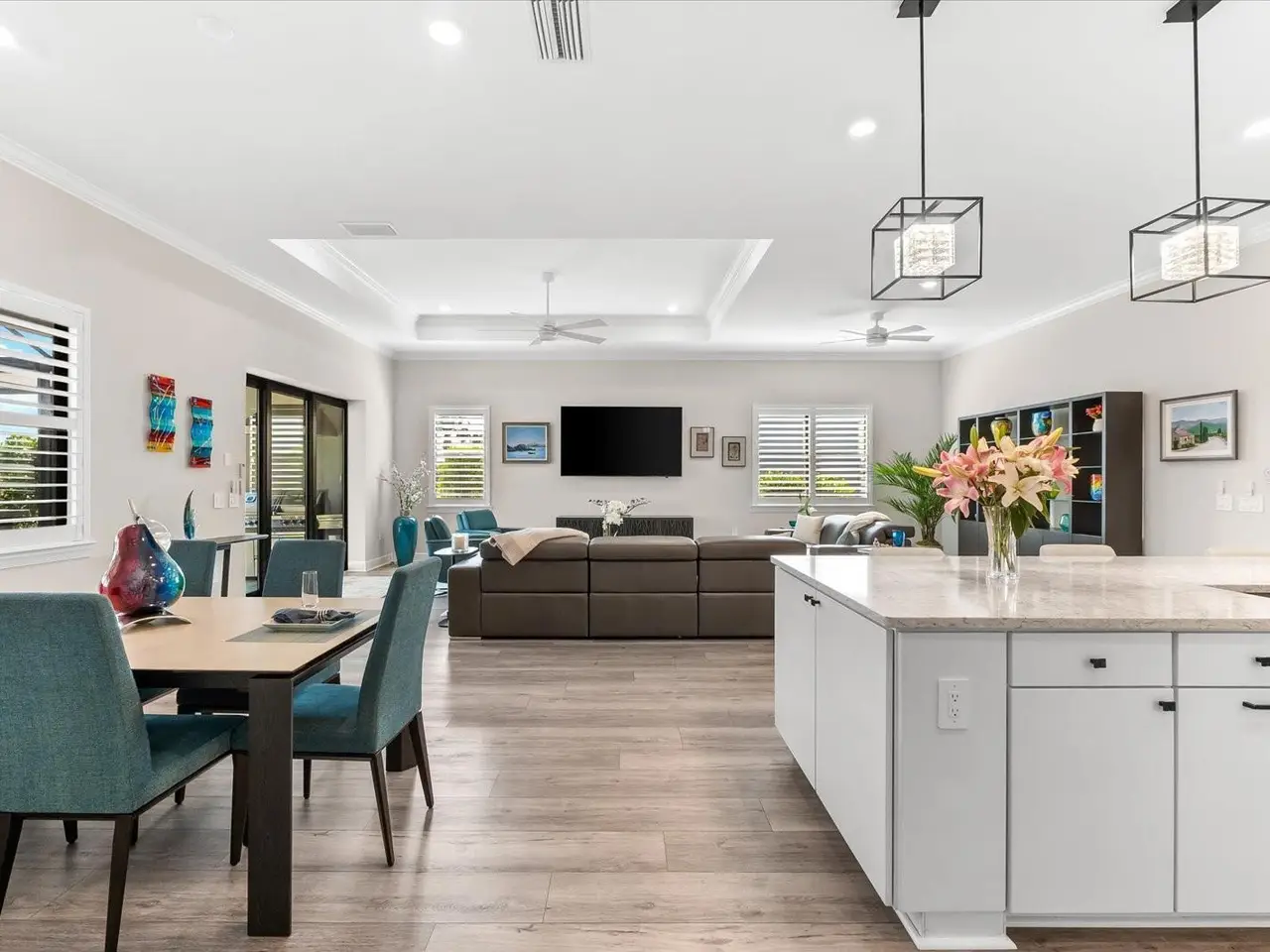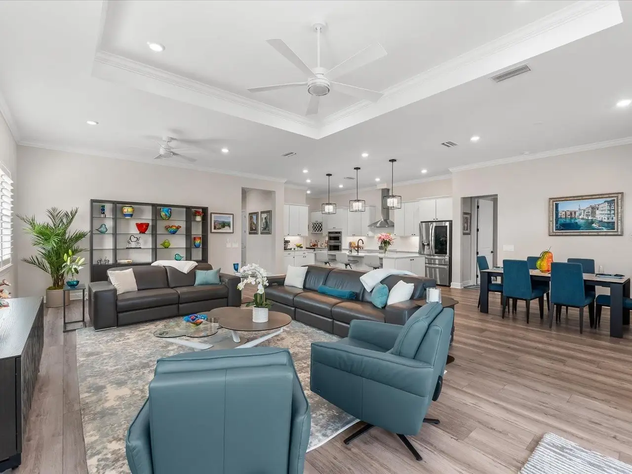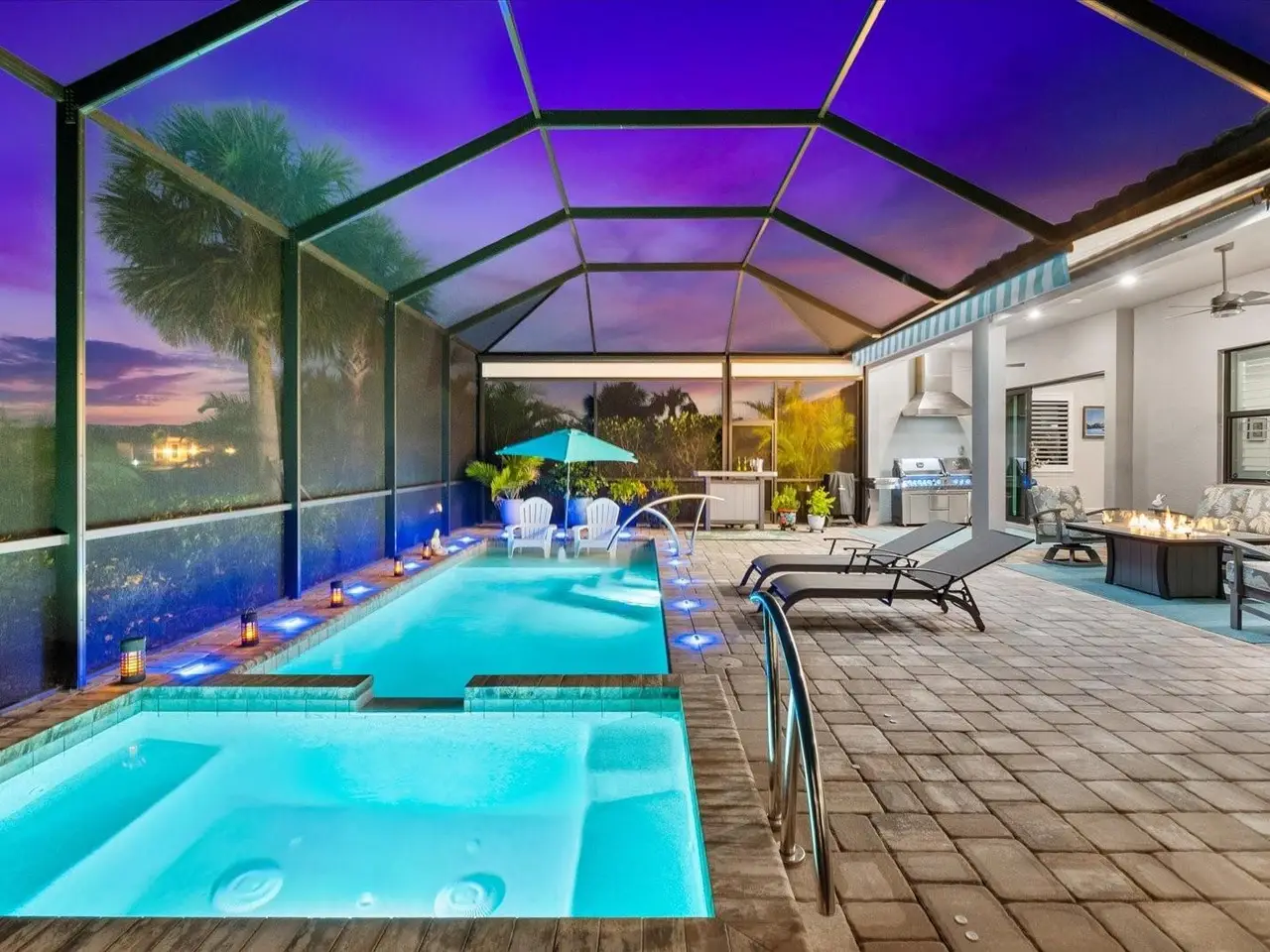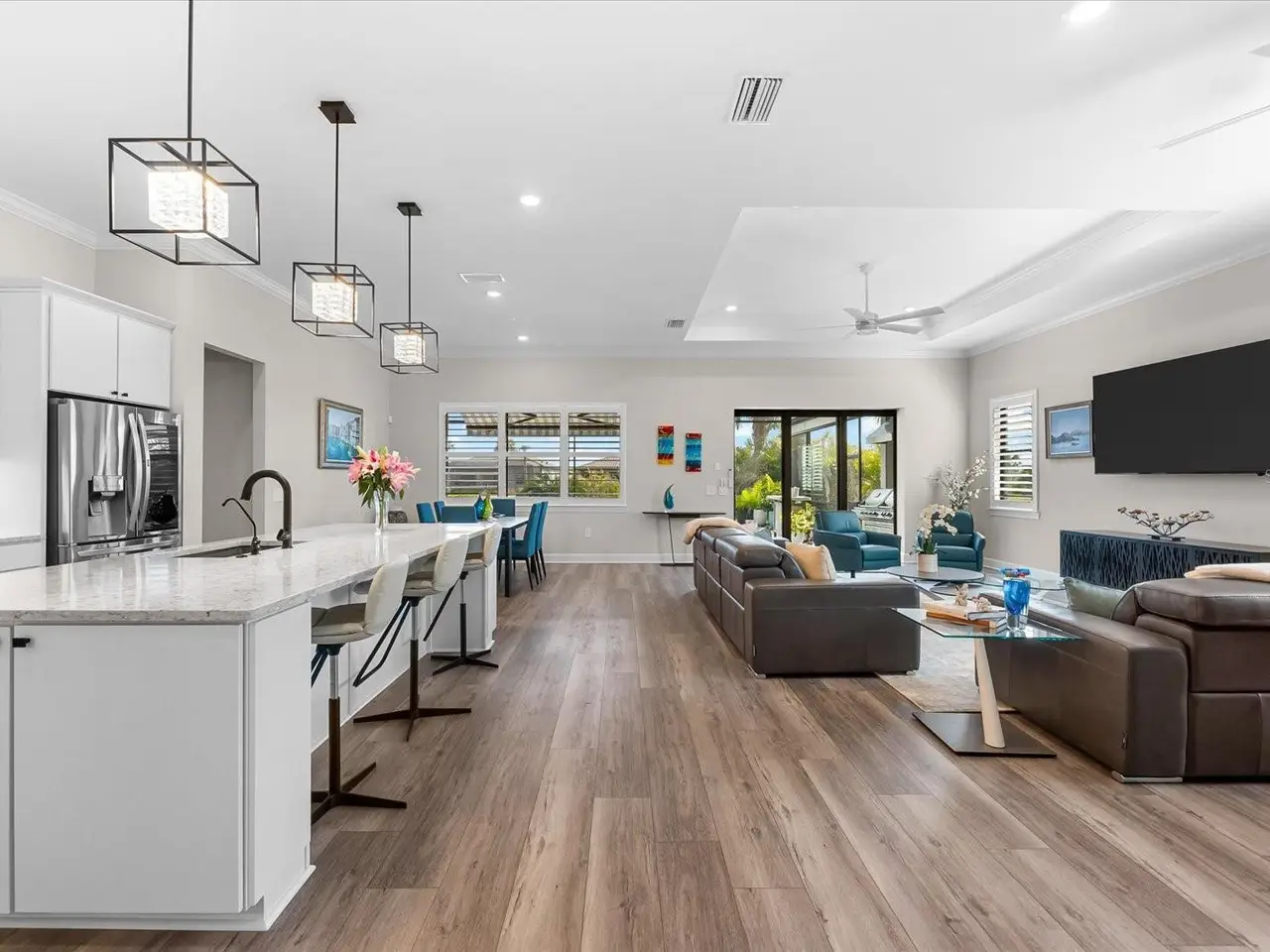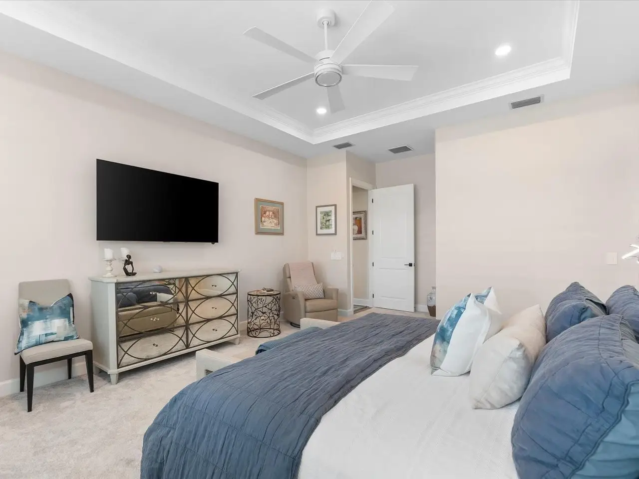 Modern Comfort Meets Resort-Style Living in Del Webb Lakewood Ranch. Welcome to easy, elegant living in the heart of Del Webb Lakewood Ranch—one of the area's most desirable 55+ communities. Set on a premium south-facing waterfront lot, this beautifully upgraded Renown floor plan offers everything you need for comfort, style, and low-maintenance Florida living. Step inside to discover an open, airy layout with three spacious bedrooms, 3.5 bathrooms, and a flexible bonus room—perfect for a home office, hobby space, or additional living area. Thoughtful upgrades shine throughout the home, from tray ceilings and crown molding to plantation shutters and impact-resistant windows and doors. The gourmet kitchen is a standout feature, complete with Bosch induction cooktop, built-in double ovens, stainless steel range hood, two-zone wine fridge, wine rack, reverse osmosis system, touchless faucet, custom cabinetry, and a perfectly organized walk-in pantry. The oversized island is the heart of the home—ideal for casual dining, entertaining, or prepping meals in style. The owner’s suite is your personal retreat, featuring a luxurious bath with dual vanities, an oversized walk-in shower, private water closet, and two custom walk-in closets. Two additional guest suites, each with their own private bath and walk-in closet, offer comfort and privacy for visitors. Enjoy peace of mind with a whole-house 24kW generator, water softener system, and an extended three-car garage with built-in storage and epoxy floors. A separate powder room, drop zone, and large laundry room add to the home’s smart and functional design. Love the outdoors? You’ll appreciate the custom-designed heated saltwater pool and spa, extended brick-paver lanai, automatic sunshades, awning, and panoramic water views—perfect for relaxing or entertaining year-round. Large pocket sliding doors open wide to blend indoor and outdoor living effortlessly. Living in Del Webb Lakewood Ranch means more than just a beautiful home—it’s a lifestyle. Enjoy access to top-tier amenities including six tennis courts, eight pickleball courts, bocce ball, a fitness center with group classes, a resort-style and lap pool, on-site restaurant and bar, and endless social opportunities organized by a full-time Lifestyle Director. With close proximity to Gulf Coast beaches, airports, shopping, dining, and culture, this home truly has it all. Move-in ready and meticulously maintained—don’t miss the opportunity to make it yours.