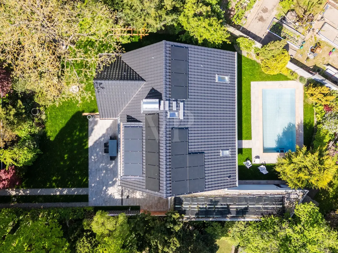 **First occupancy after refurbishment - Exceptional and energy-efficient architect's house with upscale furnishings and extensive modernization and refurbishment measures** This high-quality detached house was built in 1971 and extensively modernized and renovated in 2024/25. It is located in a quiet and beautiful area of Kladow. With a living space of approx. 216 m² and a plot area of 795 m², this characterful property combines modern living with spacious room concepts. Thanks to numerous modernizations and energy-efficient renovations in recent years, the architect-designed house offers upscale living comfort combined with contemporary energy efficiency. The property has a total of 7 rooms, including 3 well-designed bedrooms and a new bathroom. In addition, there is a terrace with an electrically controlled awning and a spacious outdoor area with a swimming pool (7.25 x 3.80 m), which was newly tiled in 2020. The pool equipment is housed in the adjoining garage, which offers additional storage space. The extensive energy-efficient refurbishment included the installation of a new roof with durable glazed tiles, 12 cm insulation on the exterior walls and new windows with triple glazing on the upper and lower floors. The heating system was also modernized and converted to two high-performance heat pumps. In addition, the house was partially fitted with new underfloor heating. The photovoltaic system (9 kWp) with a storage unit of 8 kWh was also newly installed and supports the sustainable energy use of the house. Inside, the electrics, pipes and wiring were renewed. Most of the interior walls, ceilings and floors were modernized and finished to a high standard with parquet, tiles and granite. The bathroom, shower and WC areas were also renovated as part of the refurbishment. A traditional fireplace in the living area ensures cozy hours in the cold season. The house also boasts special extras: a sauna with adjoining shower and WC, a visually historic vaulted wine cellar and a large hobby room, which is equipped with connections for a kitchen, offer many possible uses. Outside, a further fireplace and a garden water meter are included. The generous window fronts and high ceilings create a bright and airy living ambience. The full basement can be heated for the most part and considerably expands the potential uses of the house. The very well-kept and partially newly laid out garden offers plenty of space for relaxation and leisure activities. The detached house is ideal for families looking for quality and comfort combined with a modern energy and space concept. Arrange a viewing today to see the benefits of this property for yourself.