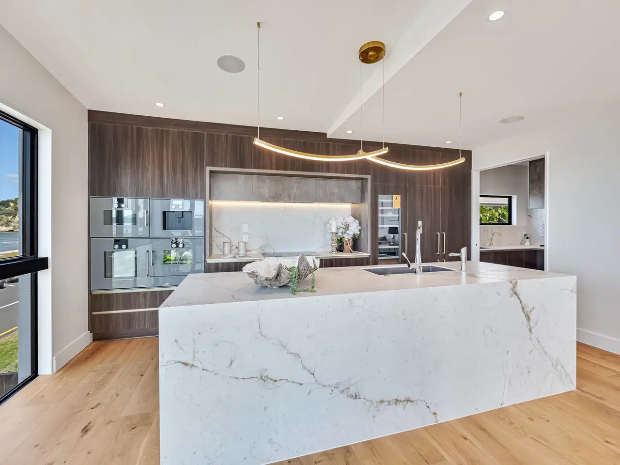 Marble waterfall island, gourmet kitchen