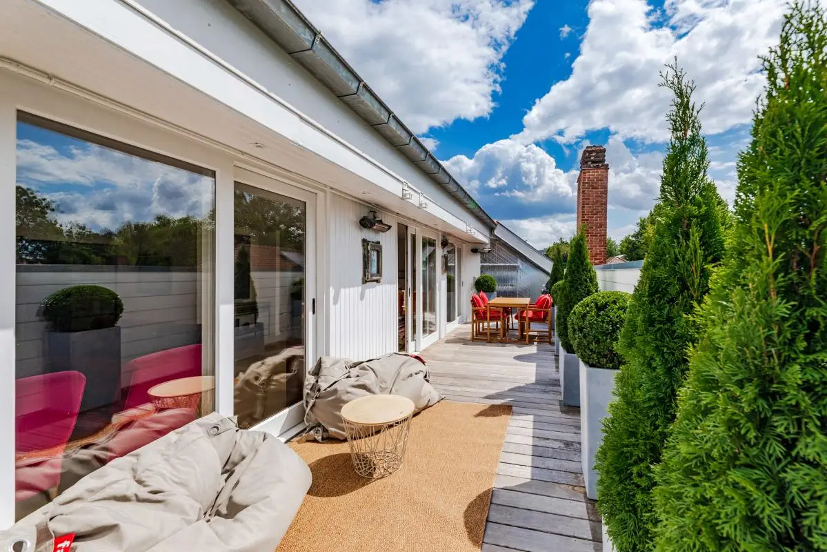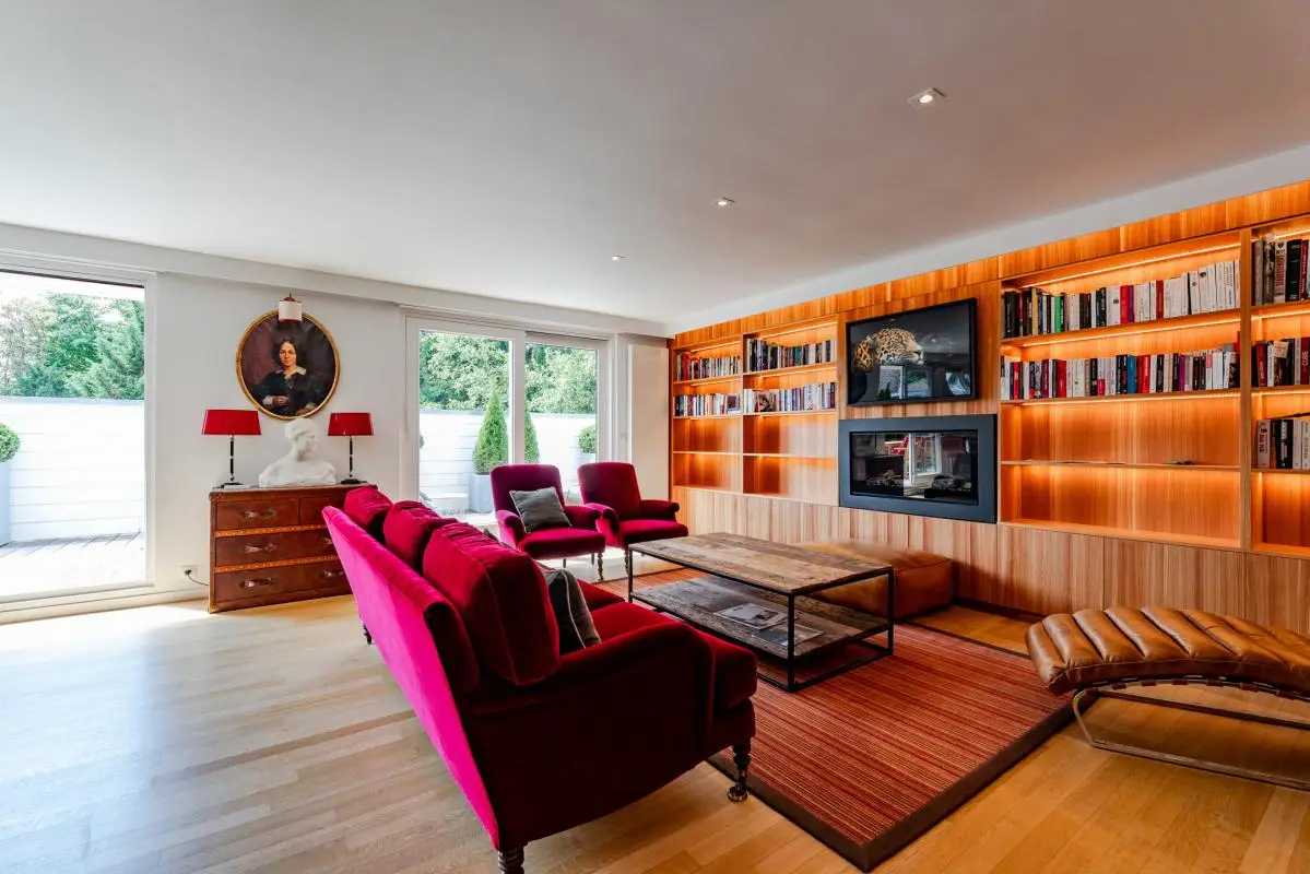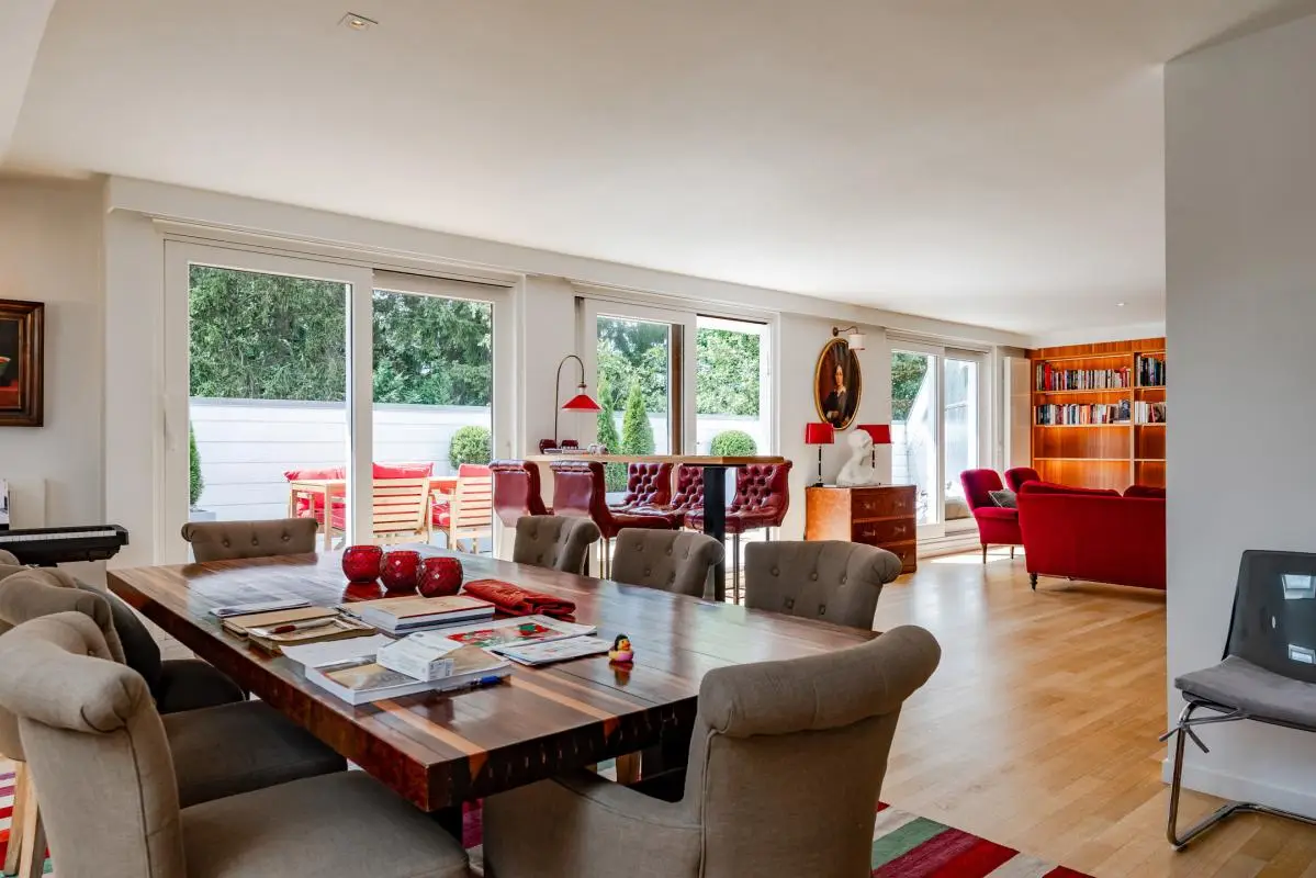 In a small, very quiet enclosed area, close to all Fort Jaco amenities, very attractive penthouse flat (+/- 295 m²) + beautiful terraces (30 and 10 m²) in a small co-ownership built in 1988 on the 2nd and 3rd floors. Private garden next to the building (125 m²). Beautiful, bright reception rooms, study, fully-equipped kitchen, 3 bedrooms, 3 bathrooms. 2 cellars and garage. PEB D