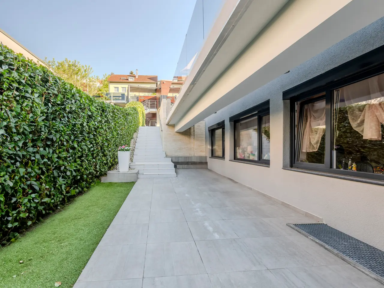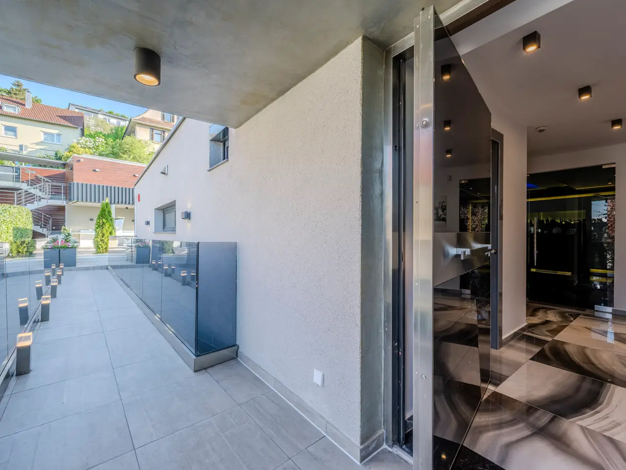 Stylish staircase leading to house entrance