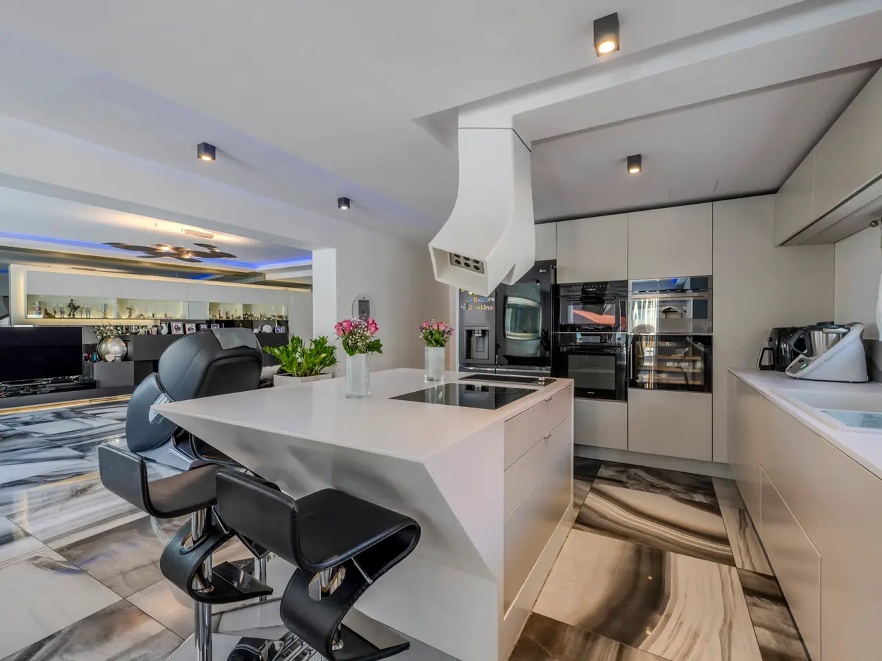 Open-plan living, dining, and kitchen areas