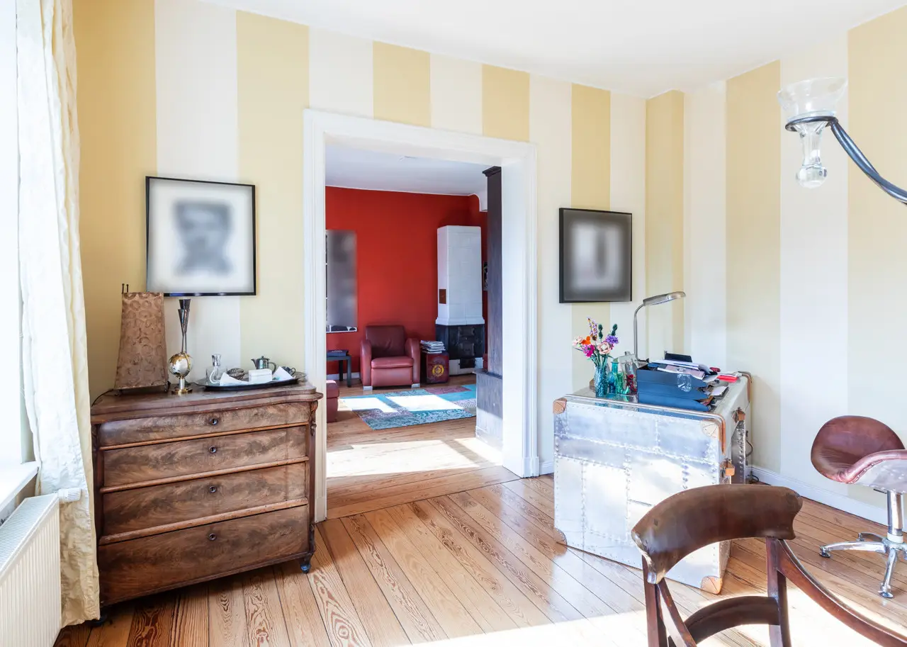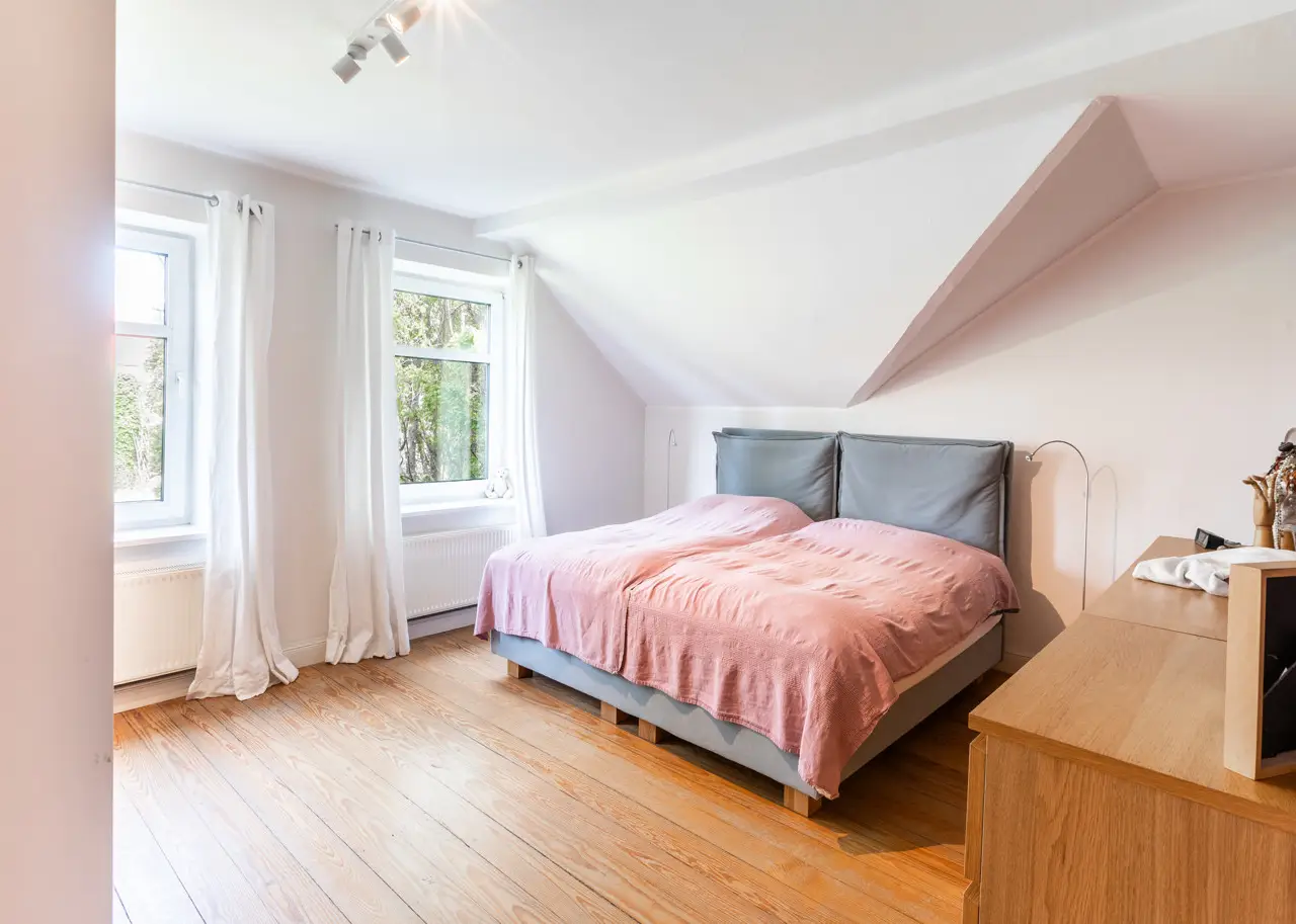 Make your dream home come true: a "town villa" in popular Eckernförde is looking for a new owner! This characterful property in a central location was built around 1920. The house impresses with its architecture and the very attractive, central location not far from the harbor and the popular shopping streets of Eckernförde. The total living space of 300 m² is spread over the ground and upper floors. There is the option of creating two residential units here. A total of nine generously proportioned rooms are available to the discerning owner. Extensive renovation and refurbishment work was carried out between 1997 and 1998. Care was always taken to preserve old stylistic elements that reflect the charm of the property. You enter the house via a beautiful entrance door, tastefully tiled in a chequerboard pattern, and reach the vestibule with space for your checkroom. It continues straight into the spacious hallway, from which the guest WC, the kitchen and the living, working / dining area lead off and the fireplace room provides for cozy hours. The modern kitchen has wooden fronts and the electrical appliances are from brand manufacturers. The floor in the kitchen was deliberately covered with gray screed, which is atmospherically very successful due to the combination of warm wooden fronts and the industrial flooring. The old, beautiful wooden floorboards in the bedrooms have been retained and can be found in all the other living spaces. As contemporary witnesses to the year of construction, they create an authentic living ambience. The choice of floor coverings, the color scheme and the existing wooden elements blend in very tastefully with the classic old building. The upper floor is accessed via a wooden staircase that blends harmoniously into the overall living concept. The upper floor is divided as follows: Three children's / study rooms, a master bedroom, a dressing room, a kitchen (option to convert 2,bathroom) and the full bathroom with shower and bathtub. One of the rooms leads out onto the balcony, where you can start the day with a cup of coffee. The house has a total of 9 rooms, including 6 bedrooms and 2 bathrooms. The room layout is optimally designed and offers enough space for individual design options. The property has central heating and is characterized by a special quality of furnishings. Particularly noteworthy are the fireplace, the garage parking spaces, the beautiful garden, the terrace, the balcony and the sauna, which invites you to relax. Overall, this beautiful property impresses with its good room layout with high ceilings, old style elements and excellent location. But that's not all: the house has a partial basement. There is a boiler room and additional storage space. A stroke of luck for all lovers of old buildings! Be enchanted by the elegant flair of this house and seize the opportunity to find your new home or investment. Arrange a viewing today and see the benefits of this property for yourself.