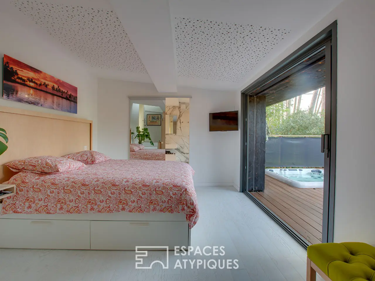 Located in the heart of Seignosse, this seventies-style property reveals an ultra-modern design of living spaces. Its quality renovation of approximately 360 sqm of living space is distinguished by the use of noble materials.In a dominant position, it offers a breathtaking view of the Pyrenees and the rooftops of the village. The charm operates when discovering the place.The particularity of the 'White House' is part of its inverted lifestyle. Its architecture promotes the circulation of natural light thanks to large bay windows surrounded by a terrace. It overlooks the garden and the pine forest. In the living space, a refined kitchen, all dressed in white, offers high-end elements. In its extension, the living room with comfortable dimensions opens onto the exterior and benefits from optimal sunshine.The night area has two elegant master suites with refined finishes. Two other bedrooms share a bathroom. A sports area faces a natural and soothing environment. The heated swimming pool and its wooden garden furniture, custom-made around a brazier, call for moments of conviviality.For the record, the second house, nicknamed the 'Pump House' is a former garage with a unique design. Its inverted sloped ceilings present an original layout with a warm living room and a custom-made wooden kitchen and its Corian worktop. Elegance and functionality are the reflection of this smooth and neat interior.On the night side, two master suites lead to the terrace with an integrated jacuzzi. They have an incredible view of the pines and benefit from a sauna for a special moment of relaxation.The 'Tree House', for its part, comes from the owner's imagination. Its access by a suspended footbridge reveals an atypical place for the greatest happiness of all. This construction on stilts, facing west, is ideal for welcoming guests. With its continuous terrace and large bay windows, it delights its visitors.The surrounding natural setting, between pine trees and hills, reinforces the unique character of this property, close to all shops, a few kilometers from the ocean beaches and the Seignosse Golf Course.REF. 8772EALDAdditional information* 15 rooms* 7 bedrooms* 1 bathroom* 5 shower rooms* Outdoor space : 4185 SQM* Property tax : 2 002 €Energy Performance CertificatePrimary energy consumptionb : 88 kWh/m2.anHigh performance housing*A*88kWh/m2.an2*kg CO2/m2.anB*C*D*E*F*GExtremely poor housing performance* Of which greenhouse gas emissionsa : 2 kg CO2/m2.anLow CO2 emissions*2kg CO2/m2.anA*B*C*D*E*F*GVery high CO2 emissionsEstimated average annual energy costs for standard use, indexed to specific years 2021, 2022, 2023 : between 820 € and 1160 € Subscription IncludedAgency feesThe fees include VAT and are payable by the vendorMediatorMediation Franchise-Consommateurswww.mediation-franchise.com29 Boulevard de Courcelles 75008 ParisInformation on the risks to which this property is exposed is available on the Geohazards website : www.georisques.gouv.fr