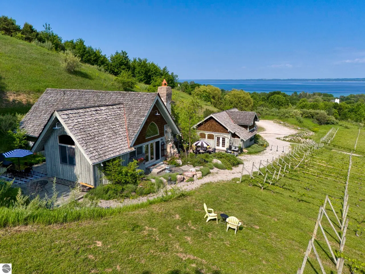 One of a kind property with the most incredible views over West Grand Traverse Bay offers many possibilities. Currently the home to Willow Winery & Vineyard - the 5th oldest working vineyard & winery on the Leelanau Peninsula, named the #2 wine region by USA today (next to Napa). This well-established, turn-key property includes a French Provencal villa designed to capture the up close water and vineyard views. The 11.45 acre site makes it the most approachable & manageable for the novice wine maker, the experienced or for existing wineries to add this magnificent site to their assets with a tasting room and residence. The villa features classic board-and-batten siding, a cedar shake roof, fireplace and imported cathedral doors from France that open into the primary suite. The impressive stone landscaping has a timeless, century-old character that blends perfectly into the rolling vineyard backdrop. The lower level of the villa is fully outfitted for winery production. A separate winery tasting room, built in the same architectural style, includes a indoor and outdoor guest seating, a bar area, retail space, 1/2 bath and storage above. A two-level equipment barn offers ample space for storage. Currently, the villa operates as a successful Airbnb rental, providing an additional revenue stream. Options to use as a private residence, continued short-term rental or full-time winery operation, Willow offers flexibility, history and unmatched charm in the heart of Leelanau Wine Country. Included in price is Wine Inventory. Shown by appointment only.