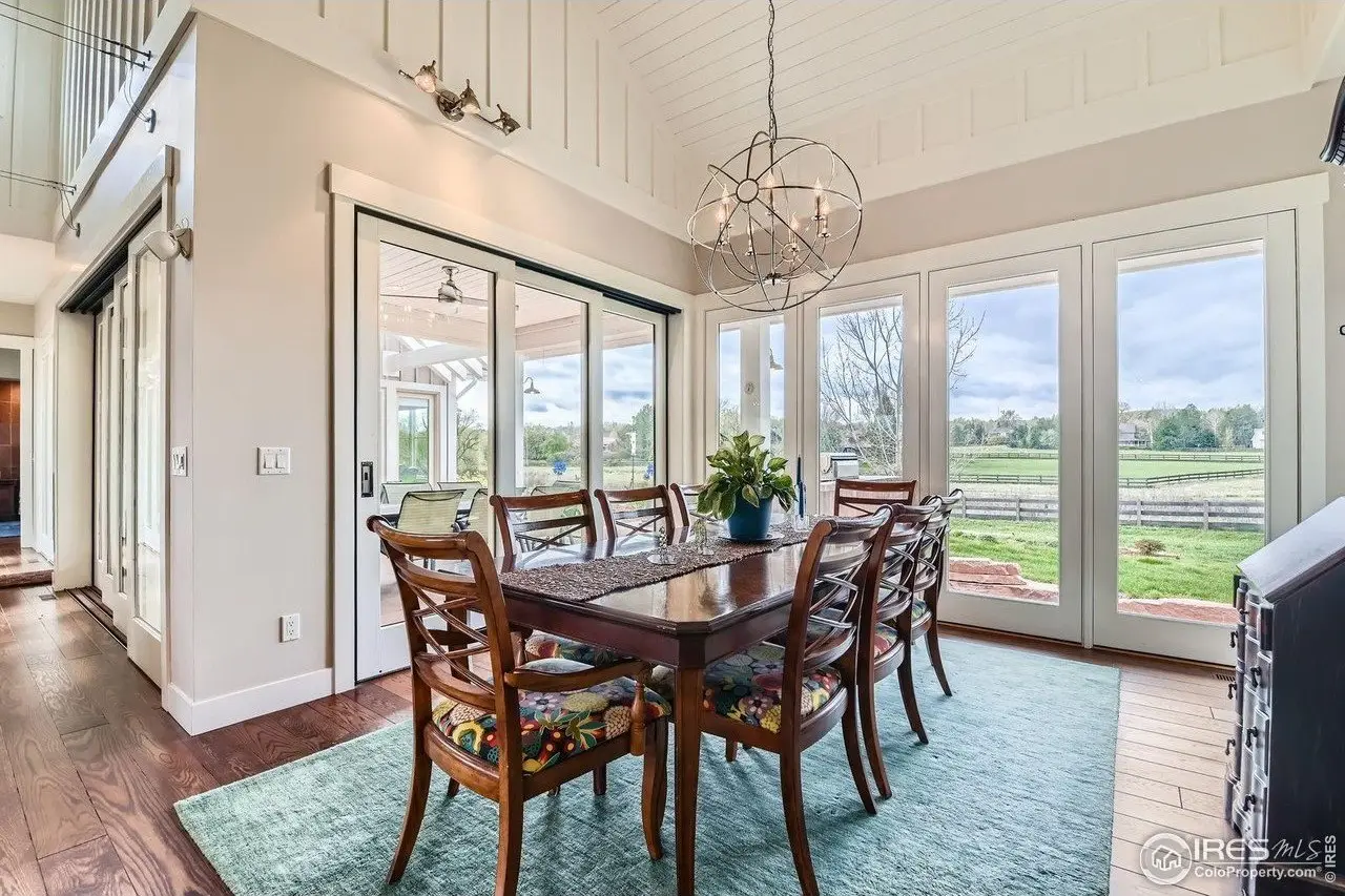 Welcome to 8392 Niwot Meadow Farm Rd, an architect-designed masterpiece in the serene and sought-after Niwot Meadow Farms community. Built by the owner, an accomplished architect, this one-of-a-kind estate blends timeless design with luxurious modern living. Set on 2.77 private, protected acres that cannot be built on, the home enjoys a tranquil, pastoral setting with expansive front views, offering peace, privacy, and a stunning connection to nature. The exterior features natural Colorado red sandstone, solid wood board-and-batten siding, and a concrete tile roof. Inside, vaulted ceilings with tongue-and-groove details, engineered wood floors, custom millwork and telescoping doors create light-filled spaces and seamless indoor-outdoor living. The gourmet kitchen includes Dacor appliances, a Miele built-in coffee maker, custom cabinetry with a rolling ladder, and a walk-in pantry. The great room showcases a horizontal fireplace with a red sandstone surround, flowing into the dining and outdoor areas. The main level offers a luxurious primary suite with a two-sided fireplace and stone accents; a guest suite with a private bath; a spacious office; a custom mudroom; an oversized two-car garage with a shop space and a built-in dog wash shower; and a separate one-car garage. A private studio suite with bath, wet bar and washer/dryer provides flexible living options. The lower level features a family room with a wet bar, three bedrooms, two bathrooms, a laundry room and ample storage. Outdoor living shines with a large covered patio, trellis, outdoor fireplace, and new landscaping. Sustainability meets luxury with geothermal heating and cooling, radiant floor heating, a solar PV system and new exterior paint. Located within walking and cycling distance to downtown Niwot, award-winning schools, and minutes to Boulder and Longmont, this extraordinary estate is a true legacy property.