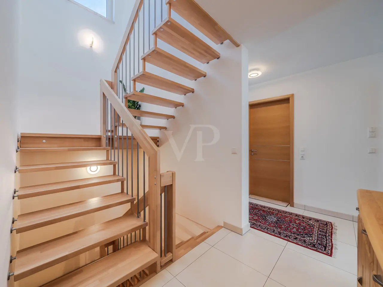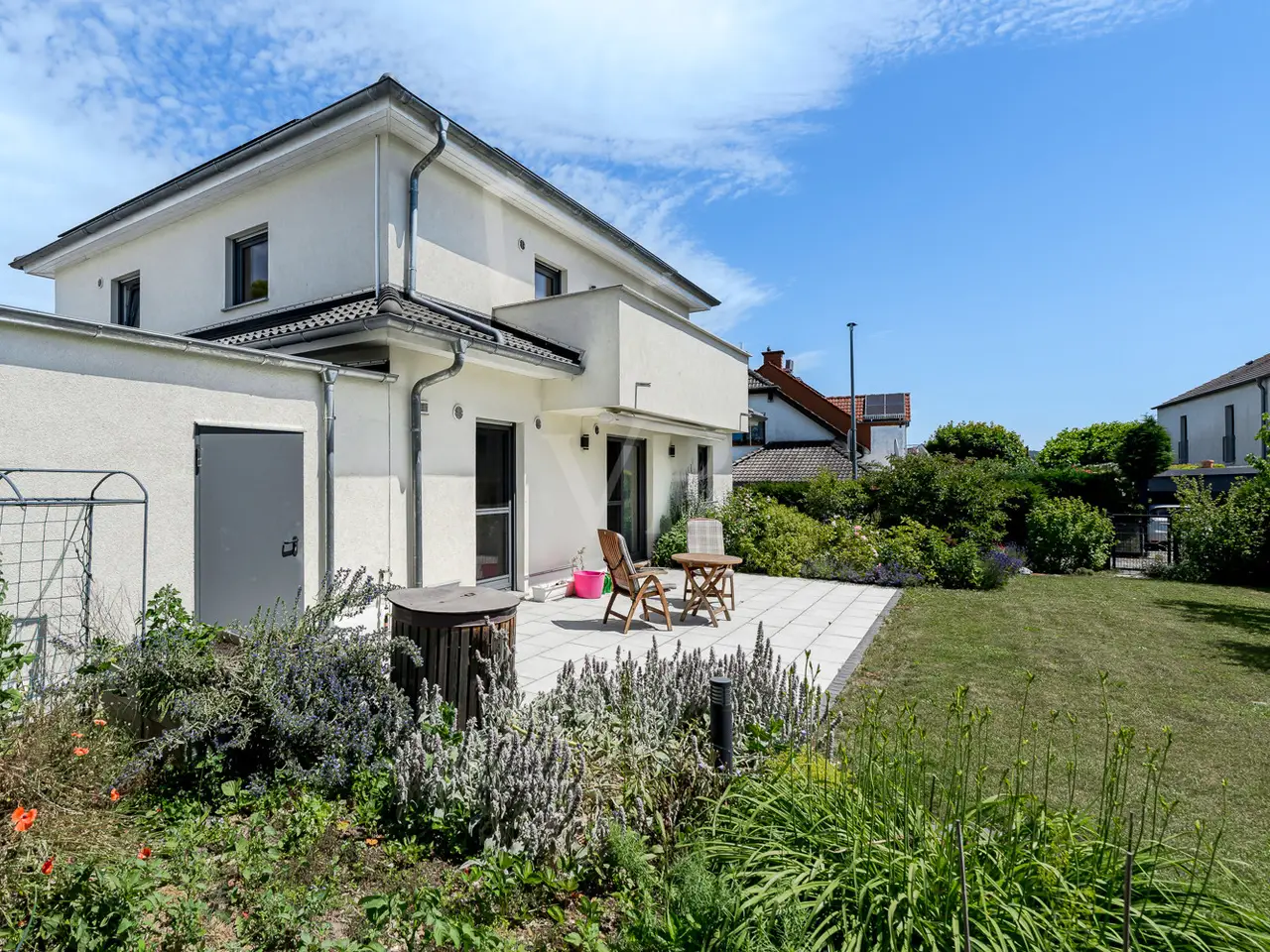 In one of the most sought-after residential areas of Usingen, this as-new detached house presents itself as a harmonious combination of timeless architecture, high-quality fittings and well thought-out functionality. Surrounded by manicured greenery and a quiet neighborhood, this property offers a living environment for people with high standards of comfort, design and sustainability. The generous living space of approx. 217 m² is spread over six light-flooded rooms, offering a stylish home for both discerning couples and families with plenty of space. The specified hobby room in the basement currently counts as usable living space and is included in the specified living space together with the proportionate terraces and the proportionate balcony. The open-plan living/dining area with floor-to-ceiling windows and direct access to the partially covered south-west-facing terrace forms the communicative heart of the house. Generosity, brightness and the flowing transition to the garden create an exclusive living atmosphere with a view of the greenery. The high-quality fitted kitchen with brand-name electrical appliances impresses with its well-kept condition and direct access to the outside - perfect for relaxed moments in convivial company. Designed with senior citizens in mind, the first floor offers a future-oriented living solution with wide door frames, a floor-level shower in the daylight bathroom and a ground-level entrance area. The upper floor accommodates three spacious bedrooms - two of which have access to the sunny balcony - as well as a stylish bathroom with a floor-level shower and a bathtub. A further bathroom on the first floor underlines the exceptional living comfort on both levels. In the basement, you will find a versatile work or hobby room and an exclusive wellness area with integrated sauna and splash shower - a retreat for peace and regeneration within your own four walls. The lovingly landscaped garden impresses with its well thought-out design and technical sophistication: An automatic irrigation system with cistern and an electric awning ensure comfort and ease of maintenance. This property also meets the highest energy standards: equipped with an air-to-water heat pump, controlled living space ventilation with heat recovery, a photovoltaic system and a solar system for hot water support, the house meets the KfW 55 standard and achieves energy efficiency class A+. A wallbox for electric vehicles and a fiber optic connection complete the future-proof features. The property is in an extremely well-kept condition and is ready to move into at short notice by individual arrangement. A large garage and three additional outdoor parking spaces round off this exclusive offer. We would be delighted to invite you to a personal viewing - experience the stylish living ambience and the special quality of this exceptional home on site.