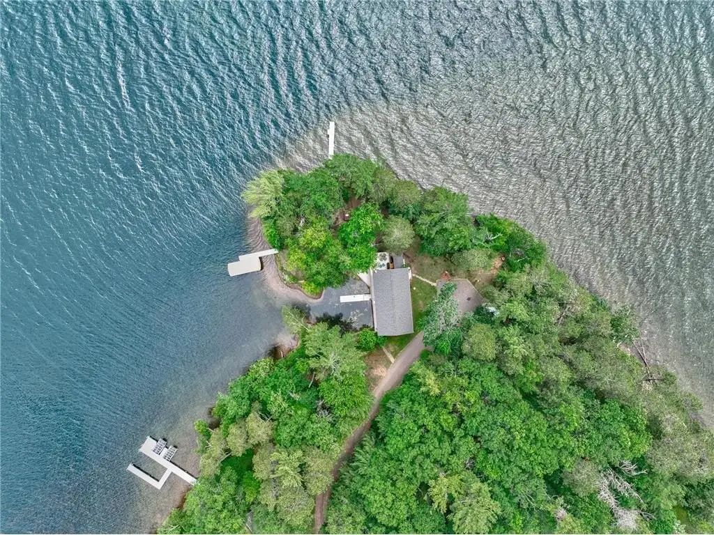 NEW PRICE!!  Round Lake Peninsula – First Time Offered! This legacy property on the crystal-clear shores of Round Lake is a once-in-a-generation opportunity. As shown on the included video, the property is set on a private 0.99-acre peninsula with 500+ ft of meandering frontage, it offers exceptional privacy, level elevation, and panoramic 270° views. Per County Zoning and DNR, development options include building a new home within a defined footprint or renovating the existing home (with some restrictions). A charming lagoon— once used to access a working boat garage—offers potential as a lakeview room or convenient storage for lake toys. Towering pines, sandy shoreline, and exceptional privacy define this rare setting at the end of Sandy Beach Rd. Whether you envision new construction or a thoughtful renovation, this is one of Round Lake’s most iconic properties. No drive by, please—home is occupied. Contact agent for full details.
