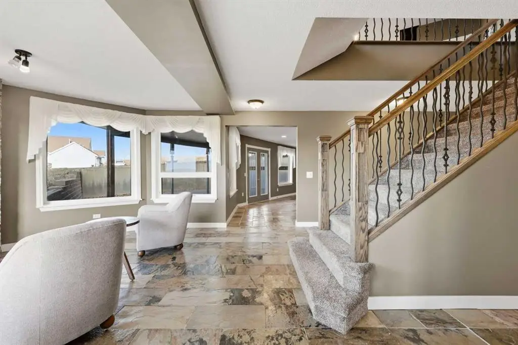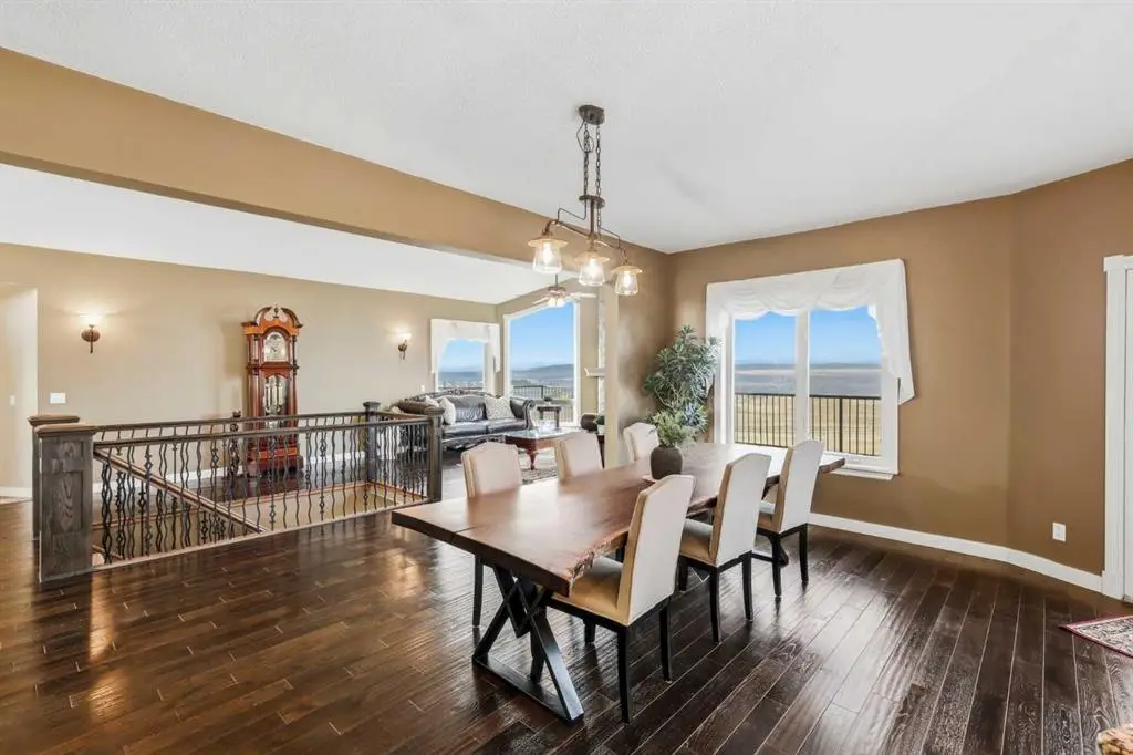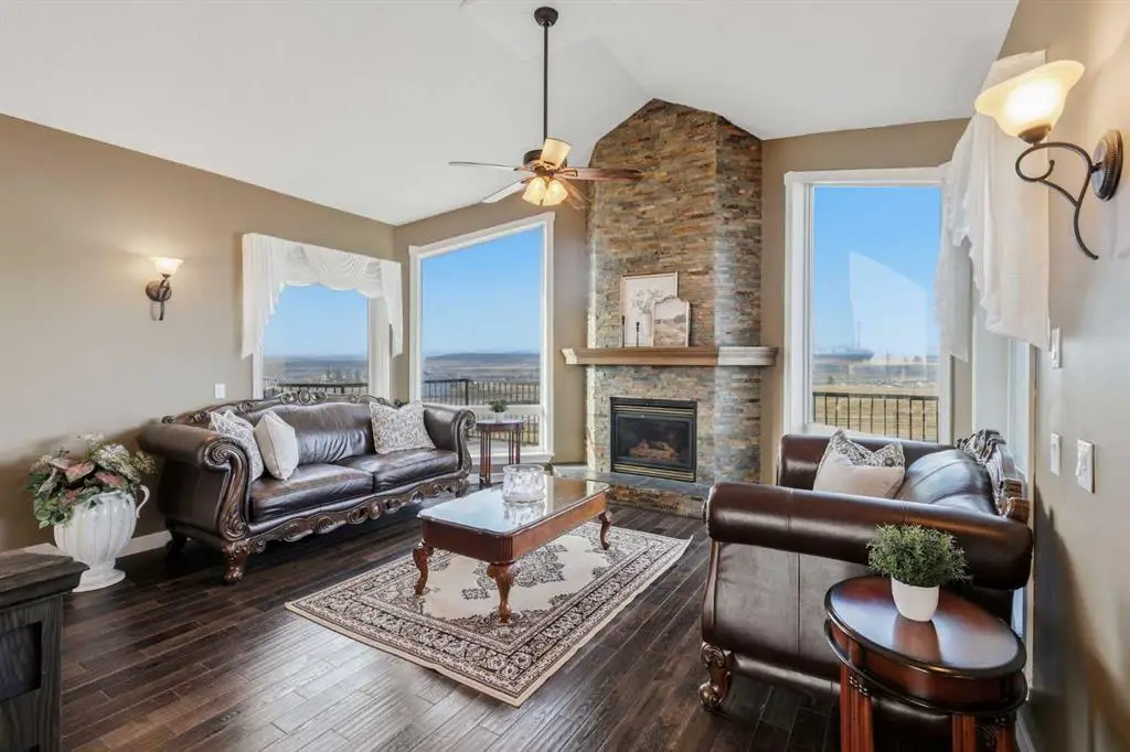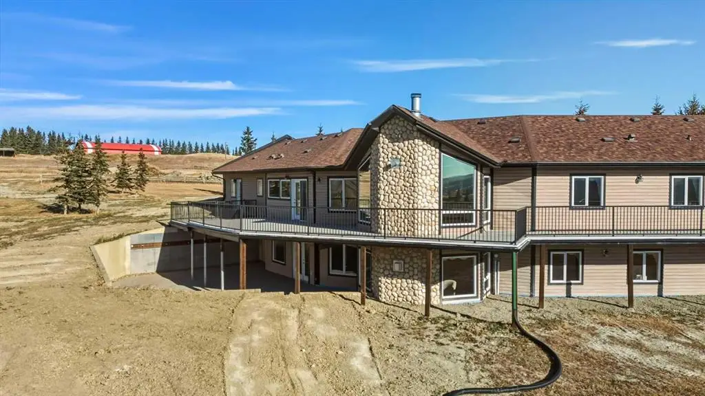 This stunning 4.41-acre property presents an exceptional opportunity to own a picturesque parcel of land with sweeping mountain views and a beautifully designed walkout bungalow. Nestled at the end of a serene, tree-lined drive, the home exudes timeless country charm with its sprawling layout, expansive wrap-around deck, and triple car garage — perfectly combining peaceful rural living with the convenience of being just minutes from Cochrane. Step inside the large front foyer, where vaulted ceilings immediately impress. The living room is a showpiece, centered around a dramatic floor-to-ceiling stone fireplace, with windows perfectly framing the breathtaking Rocky Mountain views. The spacious dining room is ideal for entertaining family and friends, offering ample space for large gatherings while enjoying the open-concept flow and natural light throughout. The chef-inspired kitchen is a standout, featuring a Wolf gas stove, Sub-Zero fridge, dual dishwashers, custom range hood, pot filler, and expansive granite countertops — perfect for both cooking and entertaining. A convenient office just off the kitchen provides a quiet workspace or flexible area. The primary suite is a tranquil retreat with spacious walk-in closets complete with organizers and private access to the west-facing deck. The ensuite bathroom is luxurious and spa-like, with double sinks, granite countertops, a large soaker tub, and a favorite feature of the current owners — an incredible steam shower. Two additional bedrooms and a full bathroom complete this wing of the home. The mudroom is highly functional, offering a half bath, laundry room with sink, and plenty of cabinetry and storage space. The attached triple garage is set up for both workshop and parking needs and is roughed in for in-floor heating and a future sink. Downstairs, the walkout basement continues to impress with a gas fireplace that anchors the space and creates a welcoming atmosphere. The expansive recreation area offers endless options — from a home gym to games or family entertaining space — all finished with durable slate flooring. The family room is perfect for movie nights or cozy evenings in. Two additional bedrooms and a full bathroom complete the lower level. Step outside to the covered patio with beautifully finished exposed aggregate concrete off the lower walkout — a generous outdoor space with room for a hot tub, sauna, or your dream outdoor living setup, all while enjoying awe-inspiring views! This home has seen thoughtful upgrades, including a new roof (2022), full replacement of poly-B plumbing, a water filtration system, a new electrical panel, a new concrete garage floor with rough-in for in-floor heating, a utility sink and a new concrete driveway apron. This exceptional property, complete with a barn, room for animals, and stunning mountain vistas, balances timeless country allure with comfort, functionality, and the perfect setting for family life. Schedule your private tour today!