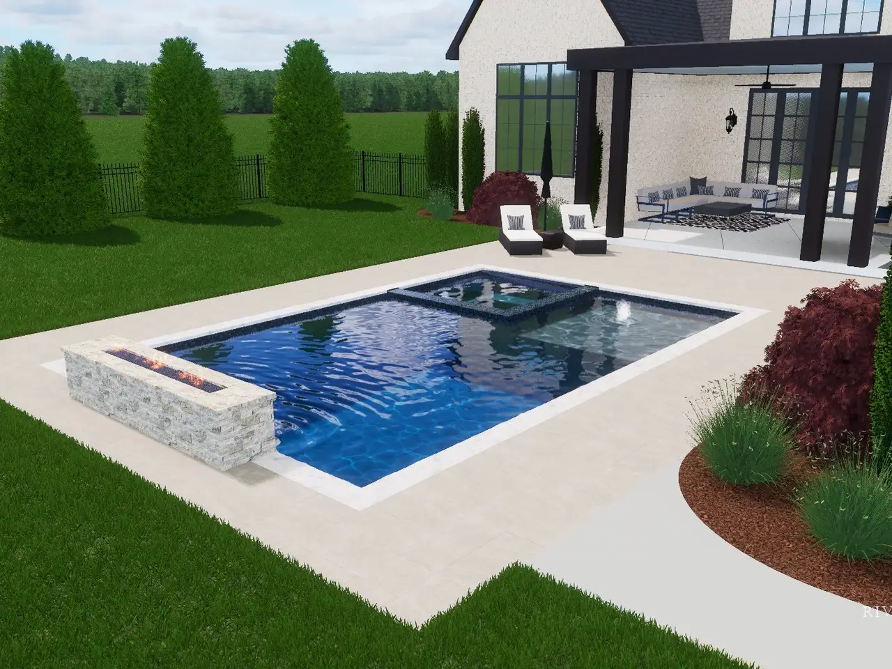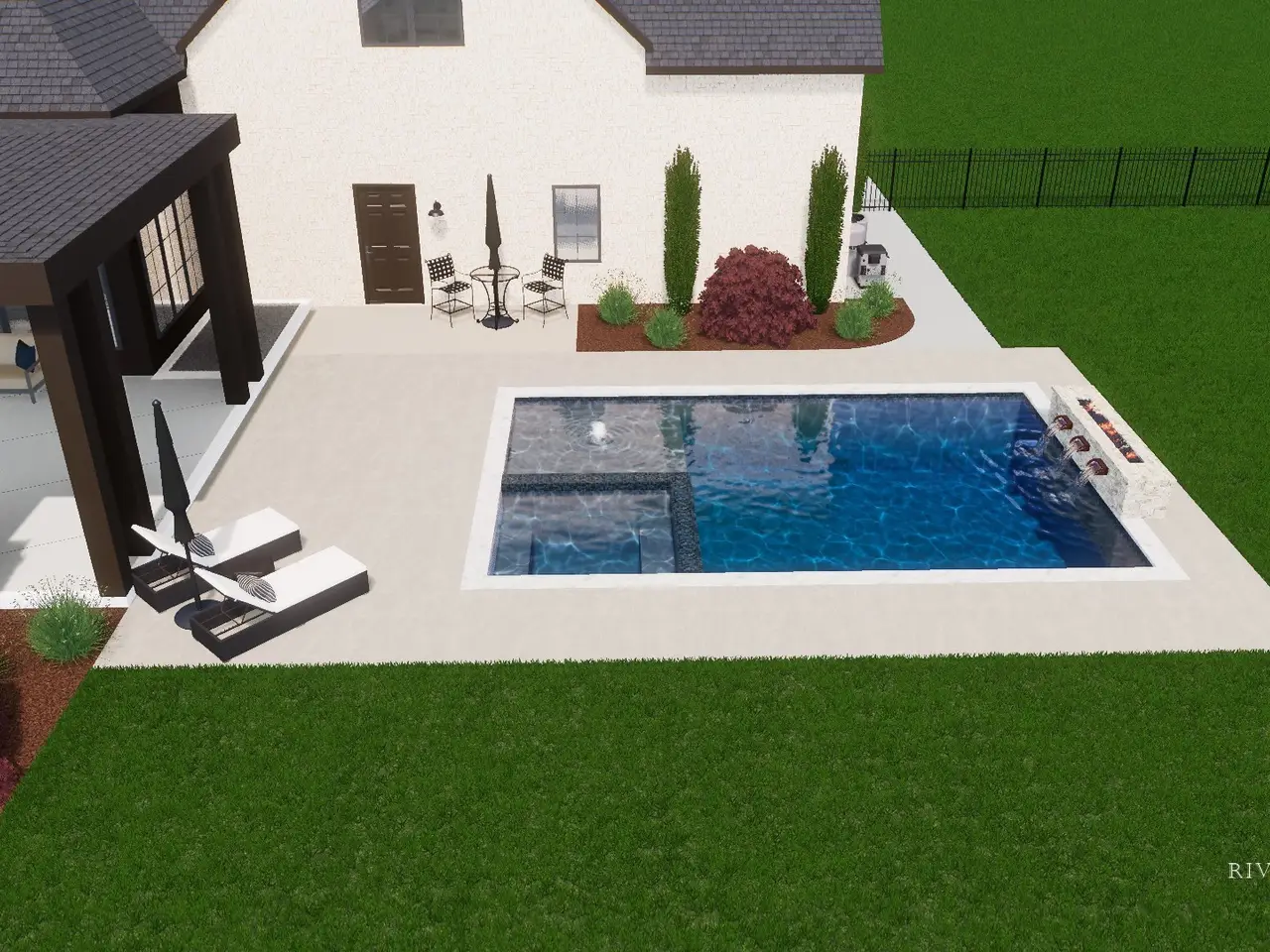 • Tree-lined fenced backyard
