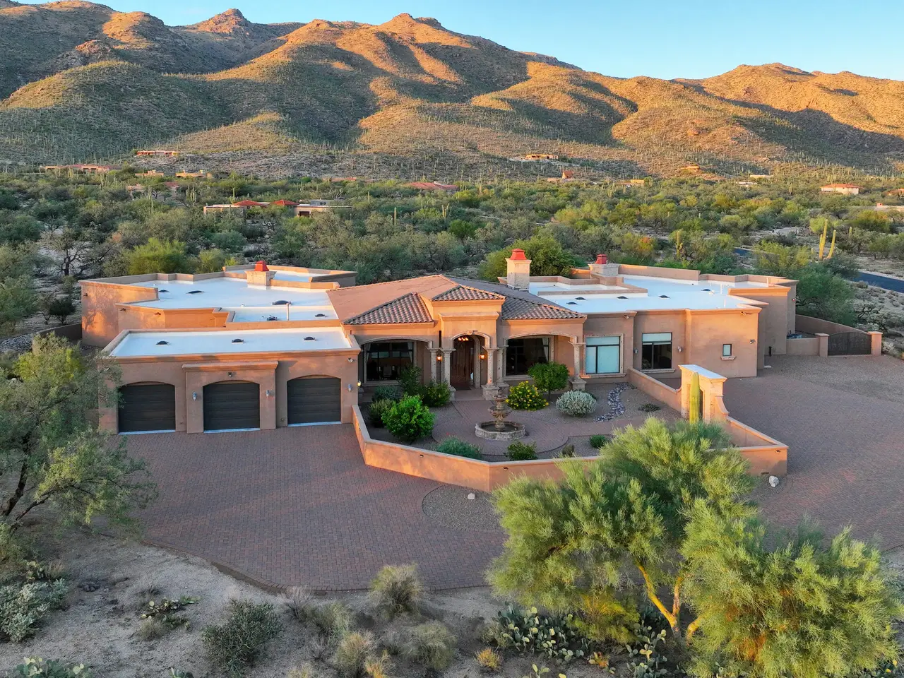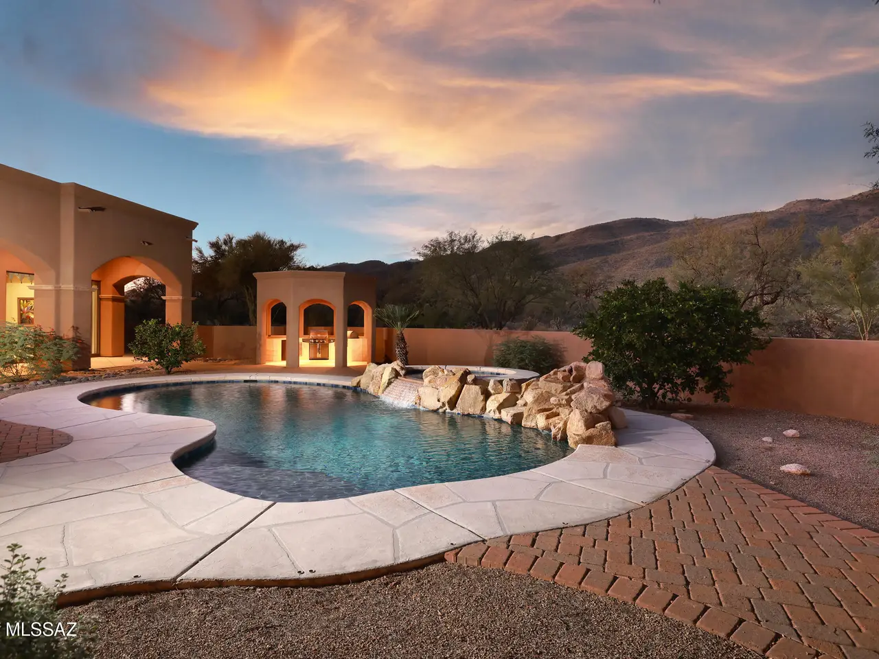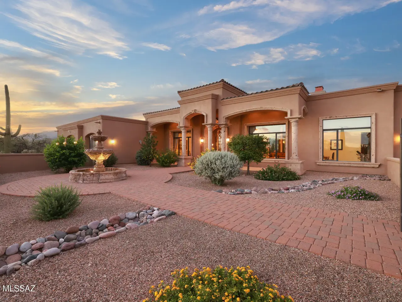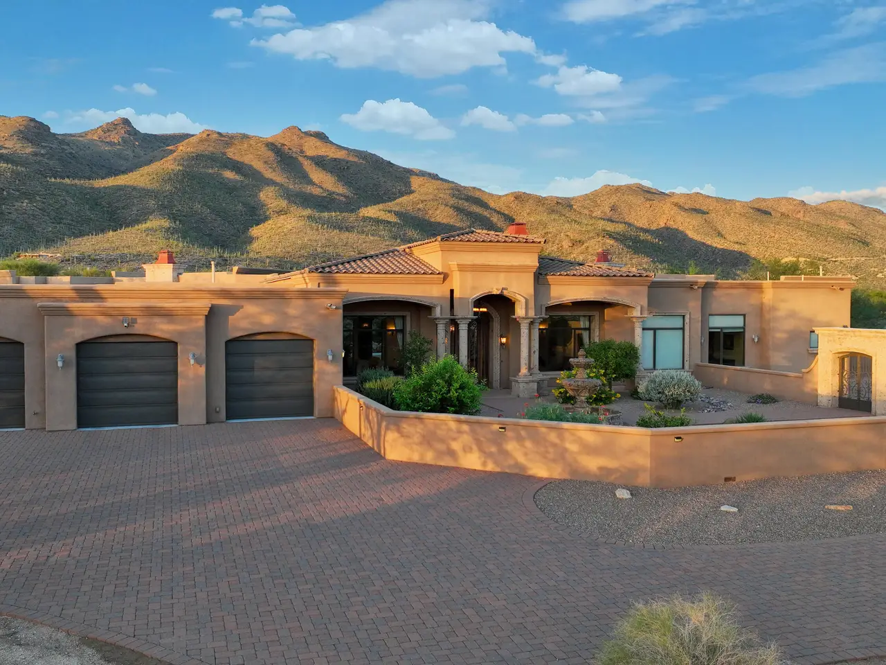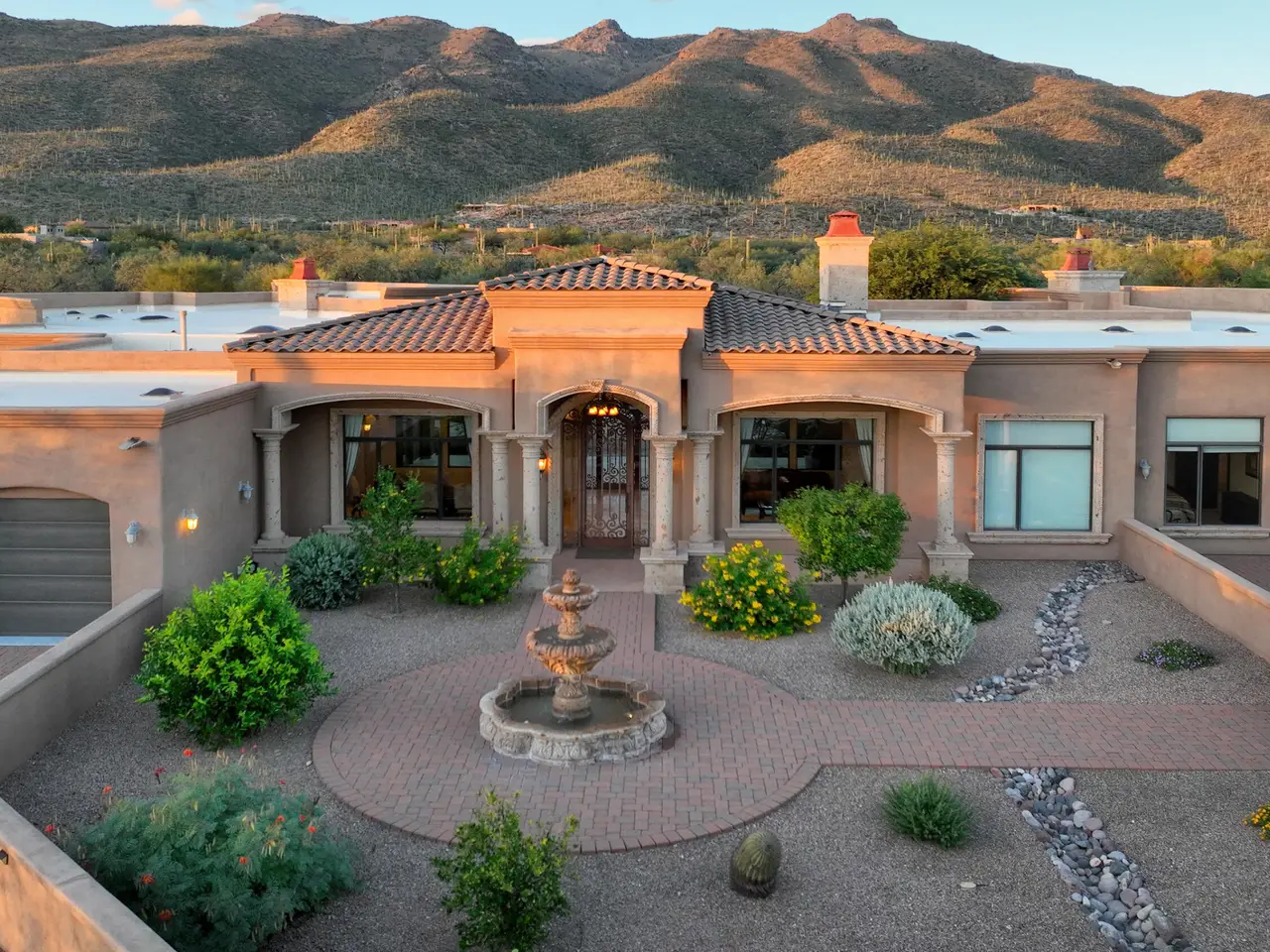 Custom home on 3.31 acres in gated Saguaro Hills Estates/Fetzer Ranch. Incredible Catalina Mt. views from this private desert retreat. Property includes heated pool & spa, 5 covered patios, a gazebo with built-in BBQ, & fruit trees. The elegant courtyard entrance with Cantera stone fountain welcomes you. Inside, 6612 sq ft of 14' high tray & barrel ceilings, Cantera stone columns, masonry fireplaces, travertine & marble floors, hand hewn alder doors and fine cabinetry. 5 bedrooms with private baths. Chef inspired kitchen includes Viking gas stove & pot filler, Miele Expresso machine, Wine refrigerator, granite island, & walk-in pantry. Family room with gas fireplace. Media room with surround sound. Oversized 3-car garage, gated paver driveway. Near parks, hiking, golf, shopping & dining.