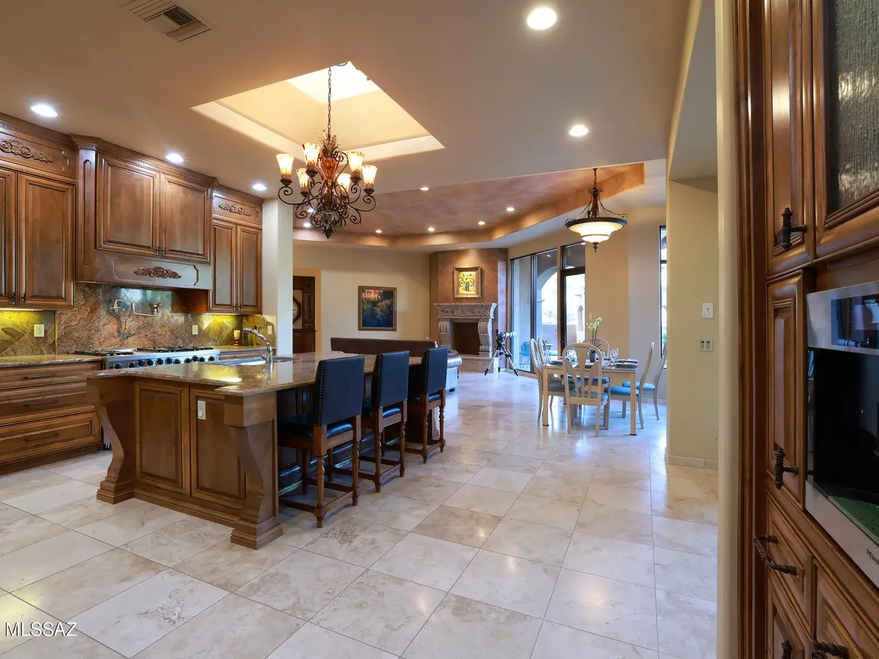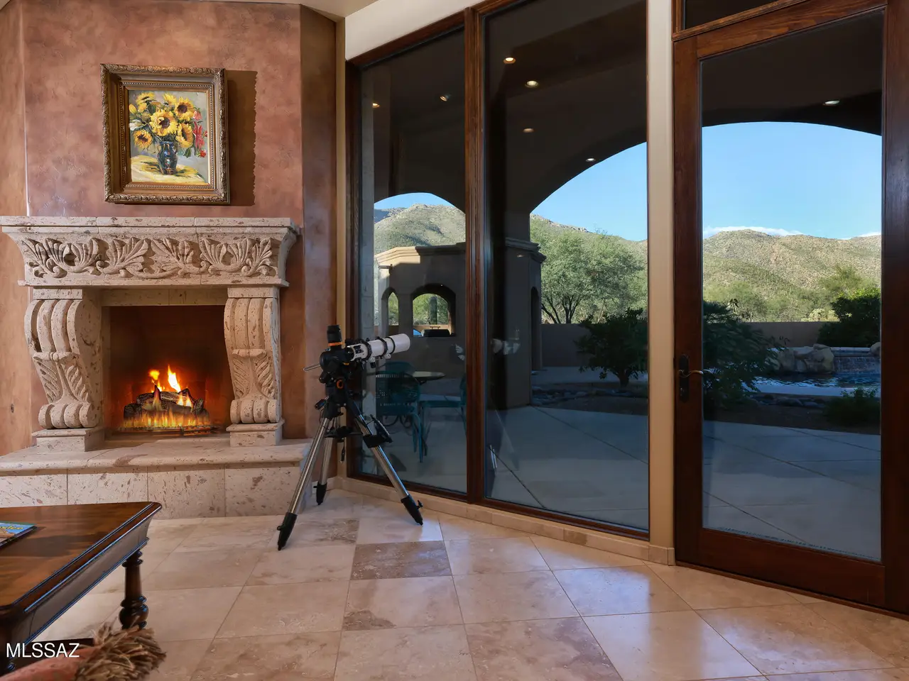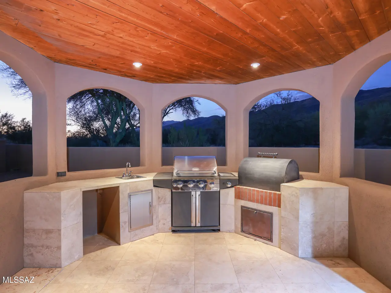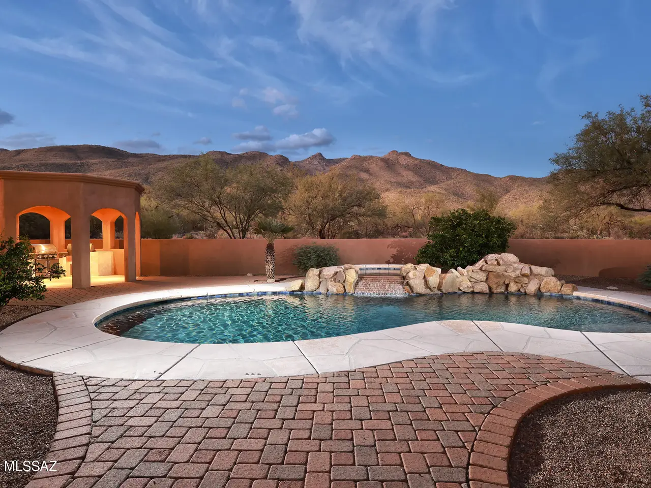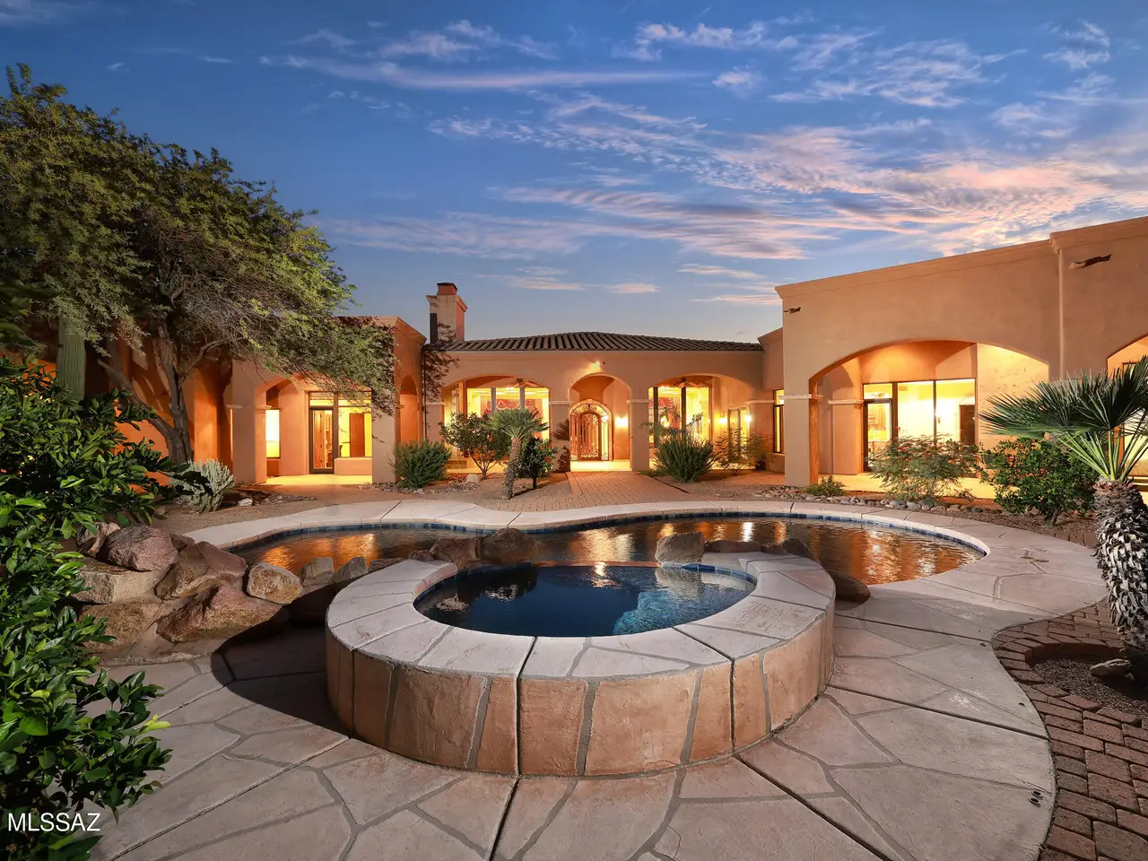 Custom home on 3.31 acres in gated Saguaro Hills Estates/Fetzer Ranch. Incredible Catalina Mt. views from this private desert retreat. Property includes heated pool & spa, 5 covered patios, a gazebo with built-in BBQ, & fruit trees. The elegant courtyard entrance with Cantera stone fountain welcomes you. Inside, 6612 sq ft of 14' high tray & barrel ceilings, Cantera stone columns, masonry fireplaces, travertine & marble floors, hand hewn alder doors and fine cabinetry. 5 bedrooms with private baths. Chef inspired kitchen includes Viking gas stove & pot filler, Miele Expresso machine, Wine refrigerator, granite island, & walk-in pantry. Family room with gas fireplace. Media room with surround sound. Oversized 3-car garage, gated paver driveway. Near parks, hiking, golf, shopping & dining.