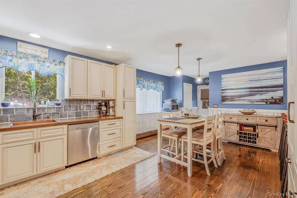 Hampton Bays Raised Ranch on Expansive 1.2-Acre Parcel in Private Cul-De-Sac Nestled in the sought-after Red Creek Park area, this 5-bedroom, 2.5-bath home sits on a generous 1.2-acre lot with Belgian block-lined streets. Perfect for extended family, the fully finished, legal lower level with separate entrance features oversized windows that flood the space with natural light. A modern custom country kitchen highlights stainless gas appliances, copper farmhouse sinks, repurposed vintage millwork, and wide-plank flooring. Additional features include central vac, in-ground sprinklers, a newer burner and hot water heater. Located less than 5 miles from Dune Road and pristine ocean beaches, and moments from top restaurants, parks with tennis and ballfields, skateparks, and community events.