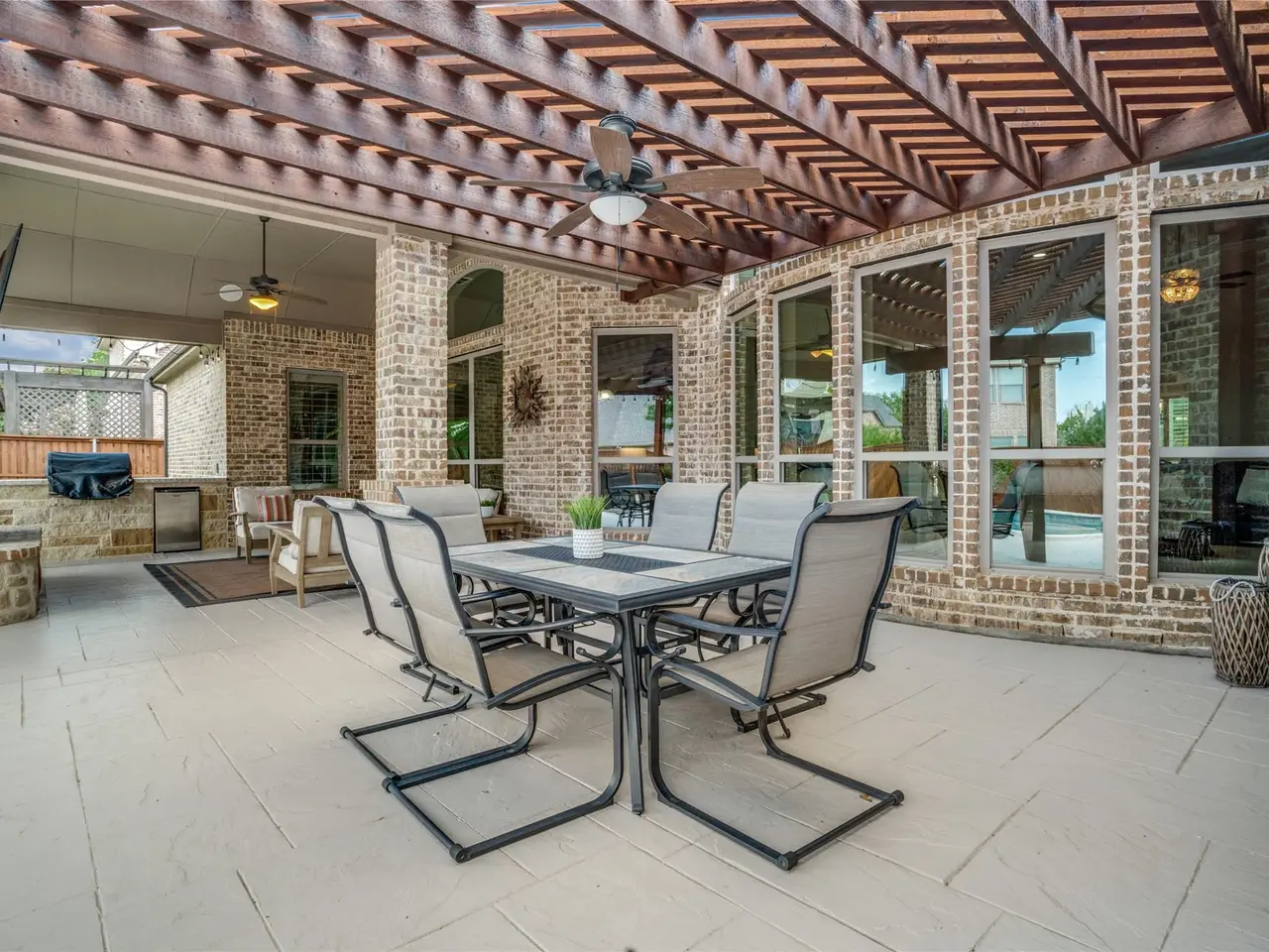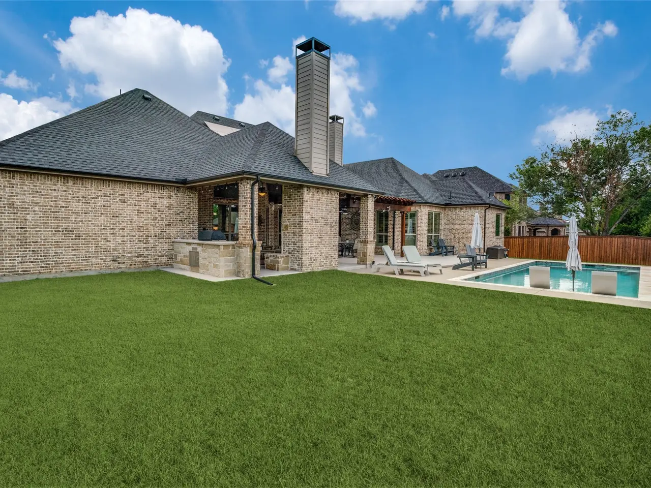 This one-story Paul Taylor custom home, having exceptional curb appeal with manicured landscaping, is located in Deer Run, one of Prospers mostdesirable communities, and blends timeless craftsmanship with modern comforts. The open design features rich hardwood floors, vaulted beamed ceilings, custom lighting, and a desirable three-way bedroom split, with a game-media room off the living area. Walls of windows greet you withnatural light as you enter the home, framing captivating views of the backyard paradise-complete with an outdoor fireplace and fully equippedkitchen. The chefs kitchen is a true centerpiece, offering a gas cooktop, double ovens, a large island, butlers pantry, and custom cabinetry. Thespacious family room centers around breathtaking backyard views, while the private primary suite boasts a spa-like bath and generous walk-incloset. Each secondary bedroom includes an en-suite bath for ultimate comfort. A long driveway offers ample space for play, parking, or gatherings, along with owned solar panels reducing monthly expenditures, making this home as functional as it is beautiful. Style, comfort, and location come together here for the ultimate living experience.