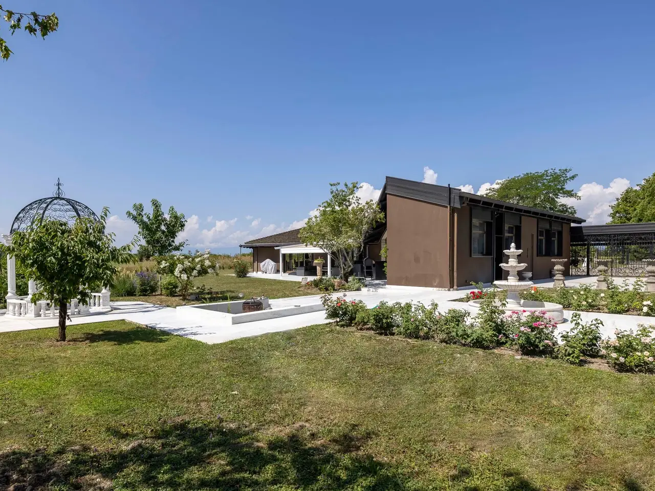 With a unique view of the Jura, the Salève and the surrounding countryside, this luxurious property is the ideal place for lovers of calm, greenery and space. The plot of more than 9,000 square meters accommodates a house of more than 600 sqm. Lined with bay windows, decorated with skylights, it is also decorated with sumptuous wooden doors and beams which structure the volumes. The rounded living room is equipped with a fireplace dating from 1712. Next come a television lounge, a spacious kitchen and five bedrooms, each with its own bathroom. The leisure area offers a pretty indoor swimming pool, opening onto the park, whose wide perimeters make it possible to organize a home gym area. Wooden and marble terraces extend the interior surface, with the park and its magnificent century-old trees beyond. A space is reserved for staff, including two bedrooms and a bathroom. The garage accommodates four vehicles.