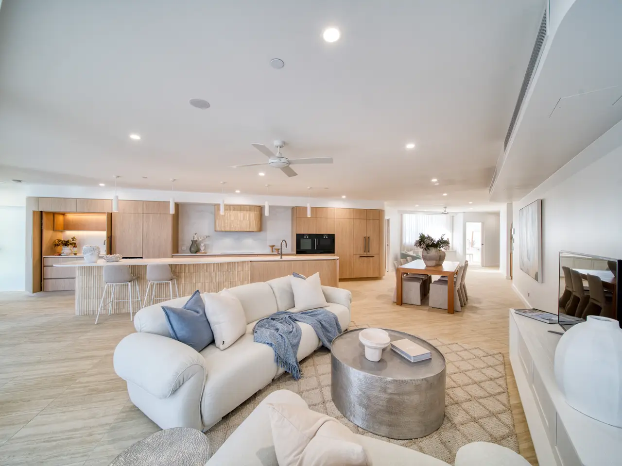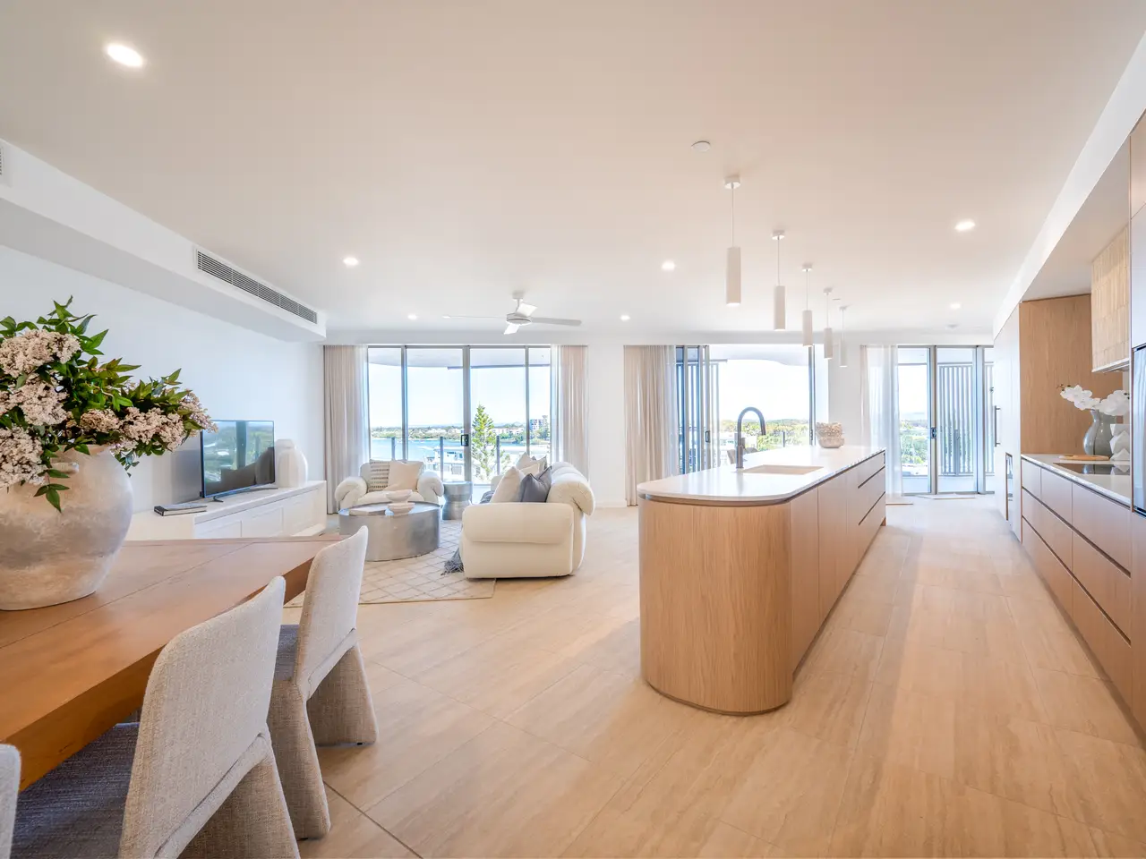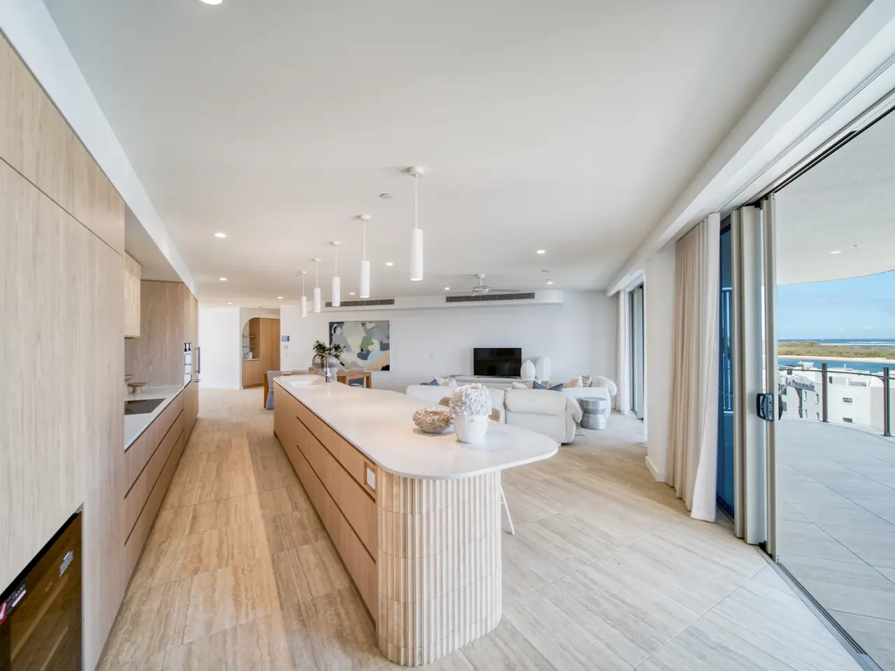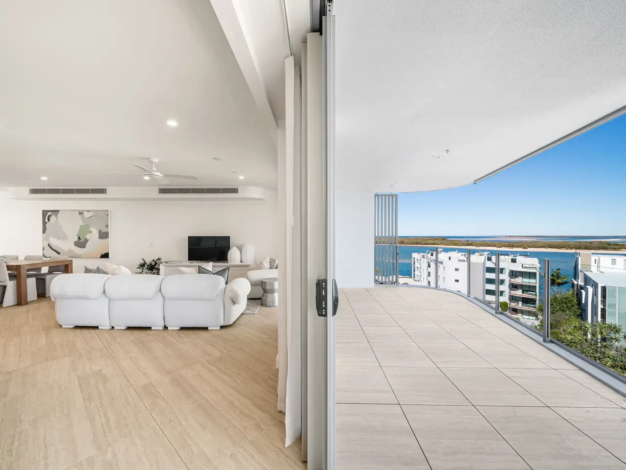 Experience the epitome of luxury in this stunning sky home, boasting over 257m² of living space. Designed to satisfy the most discerning taste for space, this residence features four generously sized bedrooms and an additional versatile multi-purpose room. The expansive outdoor living areas create a rare and unparalleled ambiance, evoking nostalgic beachside escapes and the charm of balmy southern European summers. • Pummicestone passage water views • Large multi-purpose room that can be transformed into a home office or media room • 2600mm high ceilings throughout • Floor-to-ceiling glazing allows natural light and access to the sweeping water views • The spacious master suite includes a luxury ensuite with double vanity, decadent bathtub and walk-through wardrobe • 100% wool carpet with premium underlay in all bedrooms and robes • Luxuriously appointed bathrooms with Villeroy & Boch tapware • Custom vanity cabinetry and stone benchtop • Kitchen with stone benchtops and splashback • Fully integrated Fisher & Paykel French door fridge, Vintec wine fridge, dishwasher and luxury Gaggenau cooking appliances • Ducted heating and air conditioning throughout • Separate laundry with washer,dryer and separate linen storage • Secure basement car parking 3 car spaces • Lock up storage space • Complex features resort style swimming pool, spa, gym and integrated BBQ area Mediterranean inspired, BIANCO effortlessly unites the most enviable elements of coastal design to breathe sleek cosmopolitan flair into a coveted Sunshine Coast lifestyle. An architectural masterpiece of 27 residences across 8 waterside levels, BIANCO re-envisions modern coastal luxury set against a breathtaking backdrop of panoramic views of The Pumicestone Passage, Bribie Island and beyond to the Coral Sea. Merging the fundamental design principles of orientation, aspect and livability, each BIANCO residence is a modern expression of cosmopolitan style and practical coastal design. A palette of colour taken from the natural elements of its coastal surroundings is enhanced by textures of natural fabrics and refined stone. Expansive use of glass showcases spacious balconies with a breathtaking view of Bribie Island, Pumicestone Passage and beyond. Adhering to BIANCO's flowing, open plan design, apartments benefit from the comfort of natural light and cross-ventilated ocean breezes. Vast living areas merge into the stylish practicality of a modern kitchen, equipped with quality European appliances and premium finishes. Subtle designer-style elements are impeccably executed in the finishes and layout of each residence. In an appreciation of practical living, the addition of secure basement parking , ensures your BIANCO residence compliments the unique quality of the lifestyle created within. Offering the ultimate blend of privacy, accessibility and indulgence, BIANCO rises to a stunning new level of premium coastal living in the centre of Caloundra. Every reasonable effort has been taken in the preparation of this listing to ensure the accuracy of its contents, however no warranty is given. Illustrations and all other photographic depictions are for presentation purposes only. Prospective purchasers are advised to carry out their own investigations to satisfy themselves as to all aspects of the particular development. To the extent permitted by law, liability for loss or damage incurred or suffered by any person who acts or makes decisions on the basis of the information and artistic illustrations shown to them in this website and our linked websites, is excluded.