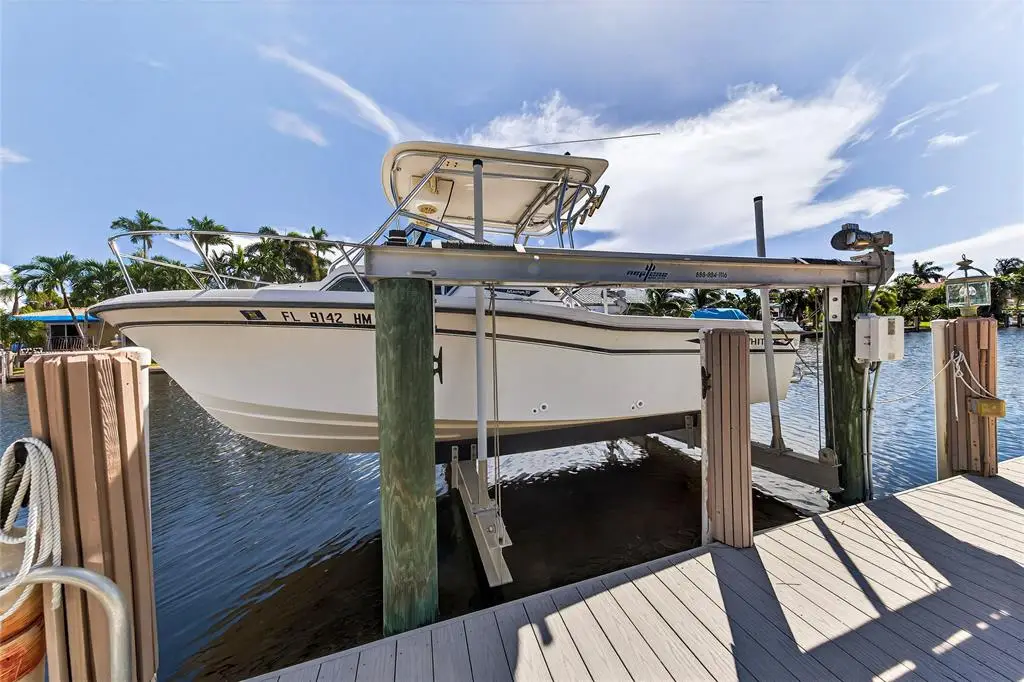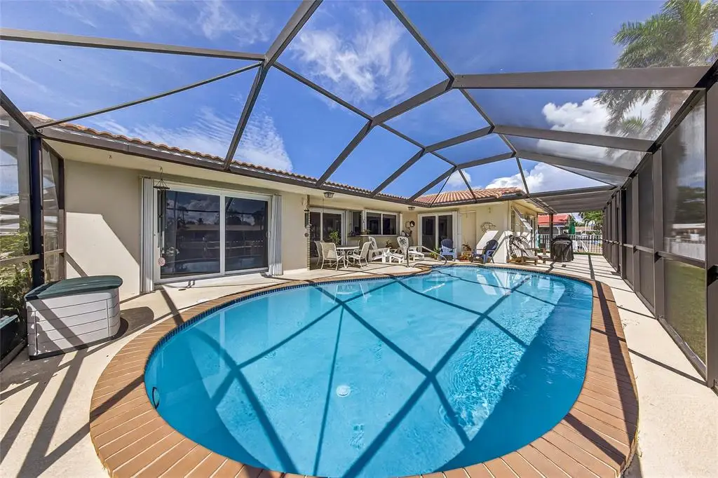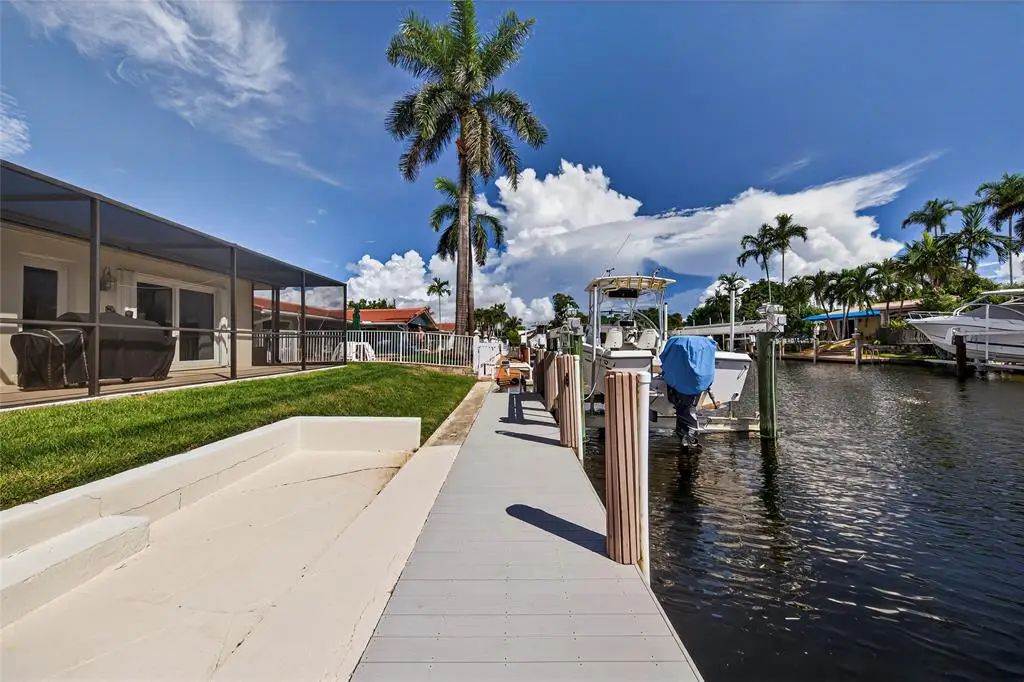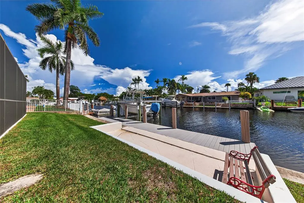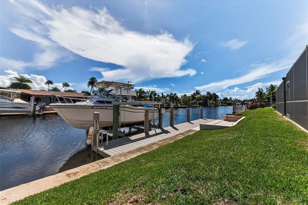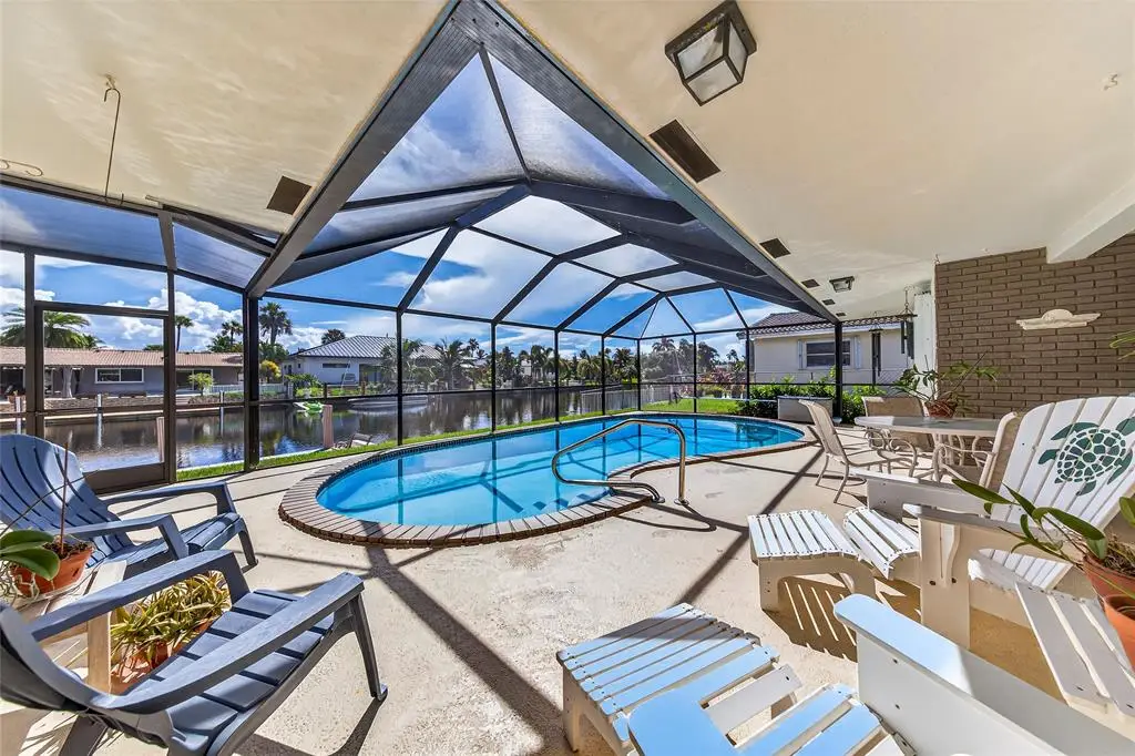 Well maintained 4 bedroom home with 2 original bathrooms, 2 car garage, screened pool, 80 feet of water frontage, one fixed bridge to ICW. Dock is composite and includes a boat lift. Roof was replaced in 2024, split package A/C units. Interior & exterior electrical panels updated 2018 including generator hookup. Impact windows and doors. Kitchen is older but not original, and opens to the family room. Formal dining room in living room. Fourth bedroom connects to the primary suite, ideal as an office, gym or nursery.