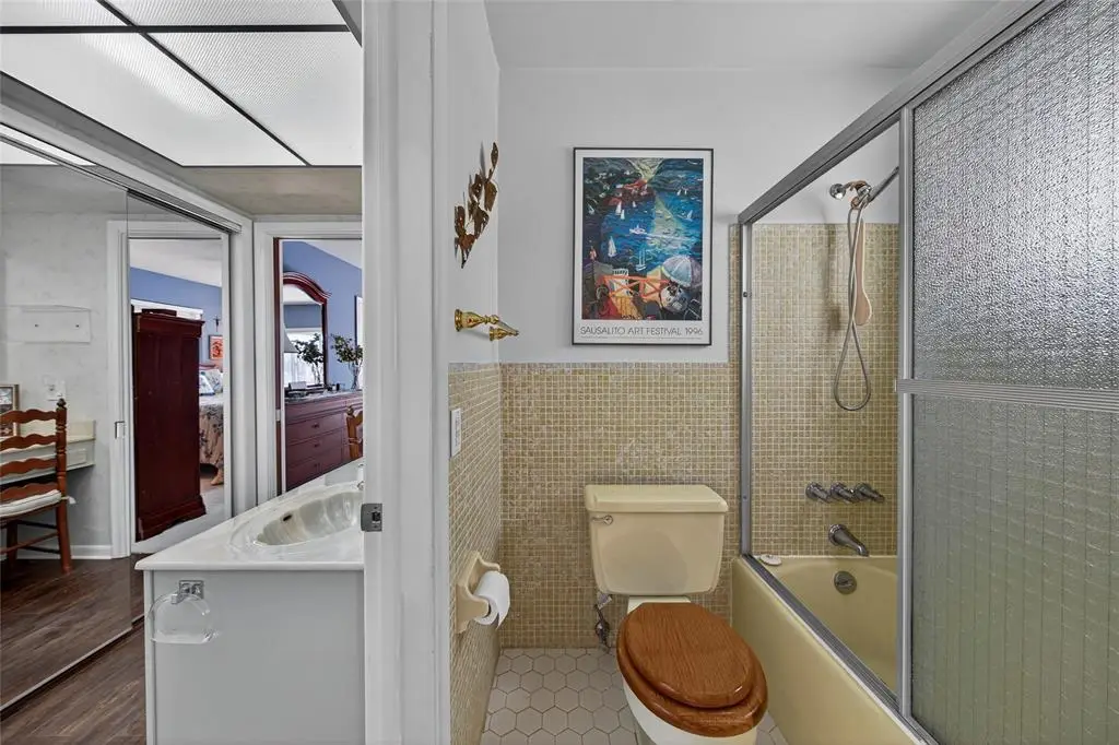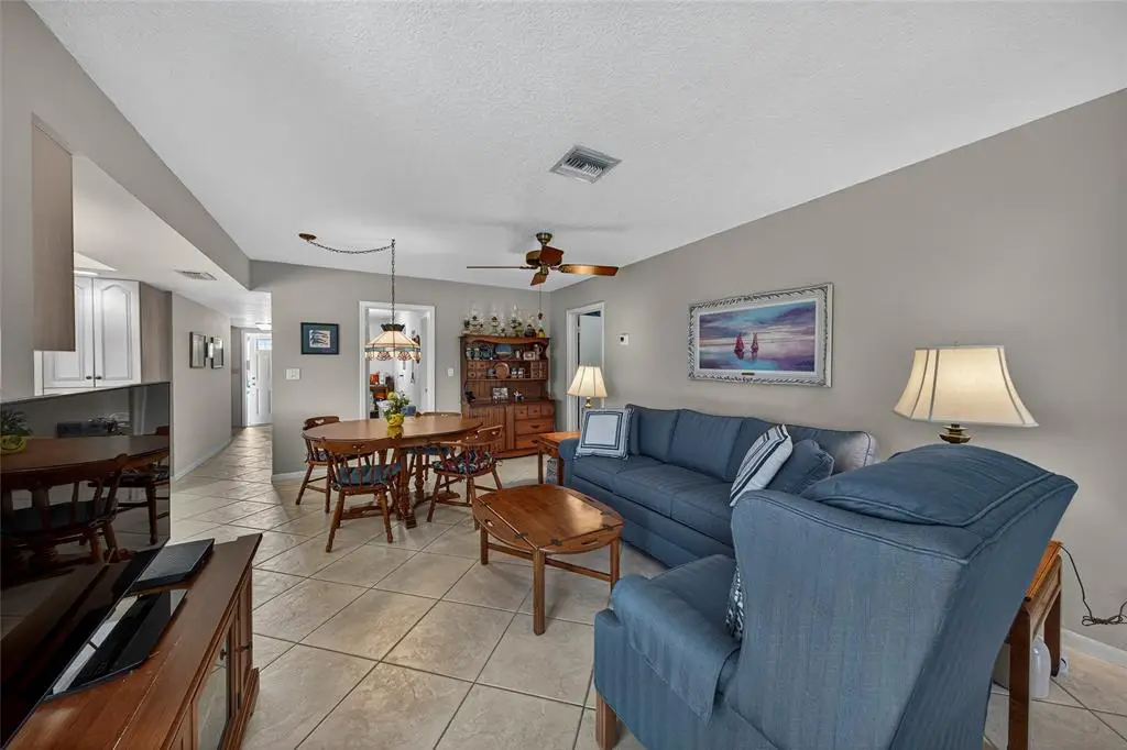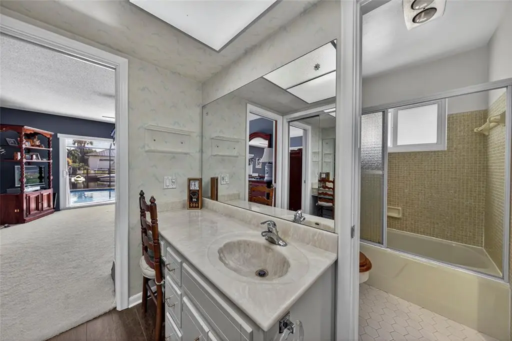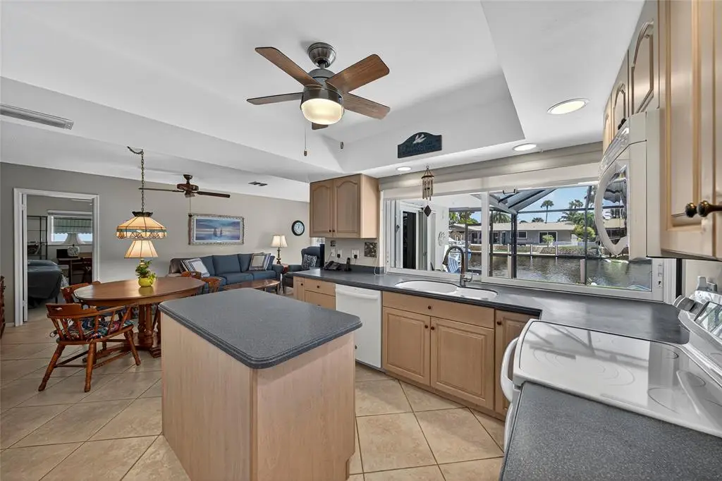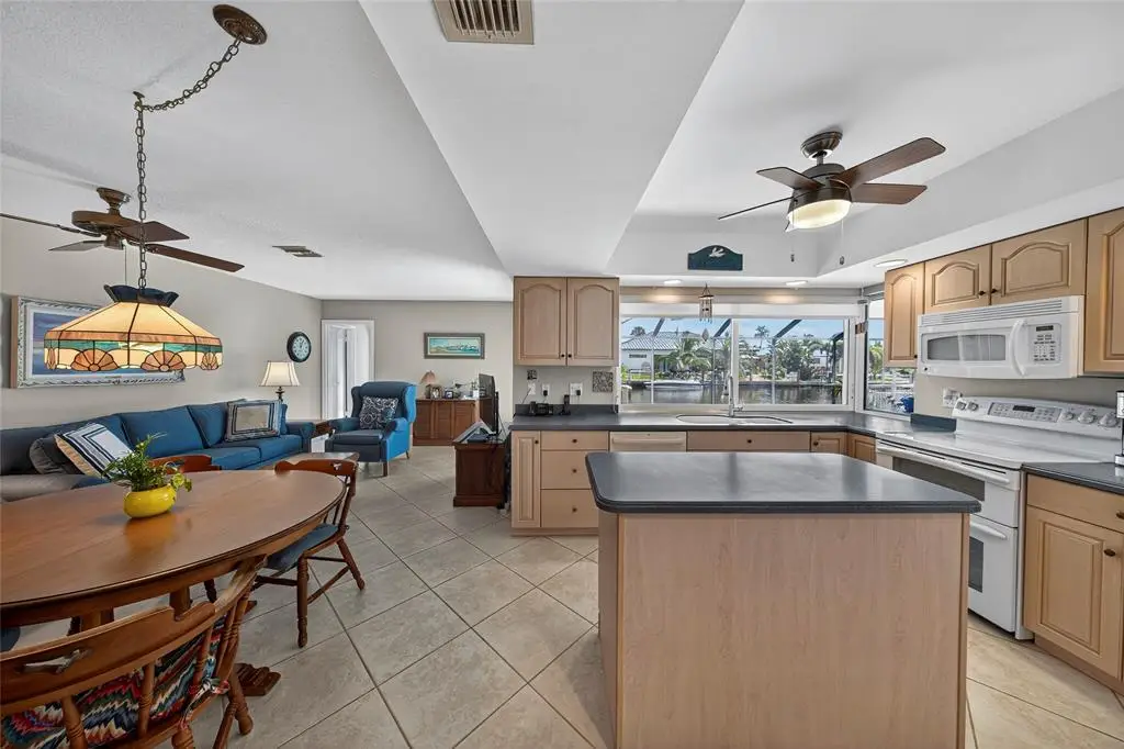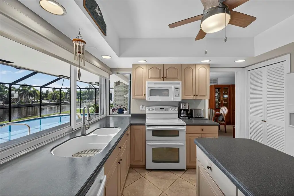 Well maintained 4 bedroom home with 2 original bathrooms, 2 car garage, screened pool, 80 feet of water frontage, one fixed bridge to ICW. Dock is composite and includes a boat lift. Roof was replaced in 2024, split package A/C units. Interior & exterior electrical panels updated 2018 including generator hookup. Impact windows and doors. Kitchen is older but not original, and opens to the family room. Formal dining room in living room. Fourth bedroom connects to the primary suite, ideal as an office, gym or nursery.