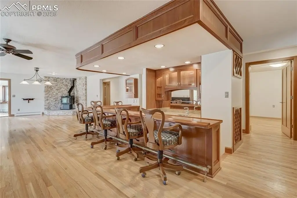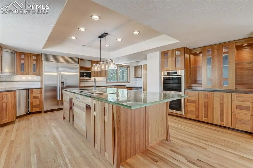 Luxury equestrian modern home on 13+ acres w/indoor riding arena, & barn w/studio. As you enter natural slate & solid hardwd flrs lead you to the great rm. Large bay window captures views of the valley. The light & bright great rm features a wd burning FP w/flr to ceiling slate & granite surround, built-ins & entertainment cabinet. The views & natural light continue in the chefs dream kitchen. Designer glass countertop island w/breakfast bar, craftsman-built cabinets, subway tile, commercial SS appliances, LED lighting, dumb waiter, pantry w/ pull out drawers & more! Walk out to the backyard oasis w/expansive multi-tier flagstone patio incl a covered/heated area w/built-in kitchen grill/smoker, 2 beverage taps, bar, & stream/waterfall features on either side. Lighted/fenced sports court perfect for pickle ball in the beautiful private setting. Back inside the formal dining rm features chandelier & wd flrs. The main lvl primary suite is loaded w/amenities; walk-out access, panoramic views, FP, sitting area, lux 5pc bath w/standalone jetted tub w/great mtn views, spa shower w/steam, radiant heat flr, separate glass vanities w/ floor to ceiling glass tile walls, custom luxury closet, & adj laundry rm w/cabinets & 2 sinks. 2nd main level bedrm has built in shelving & in-wall bed, offering a flexible guest rm w/nearby full bath. The walk-out bsmnt offers a large wd bar w/plenty of seating, space for pool table & sitting area w/wd burning stove. Lower-lvl office captures mtn views & has wall of built-in shelving & desk. 1 of the 2 bsmnt bedrms has sitting area while the other bedrm is setup as a workout rm. Both have easy access to hall bath w/steam shower. Quick walk to the heated/irrigated 140x80 riding arena, 60x40 shop w/concrete floor, 5 stall barn w/tongue & groove walls/ceiling, multiple large entries/exits, tack rm, handicap accessible bath, spacious 1bd 1ba barndominium w/full kitchen above, & more. Must see CO luxury ranch w/great access.