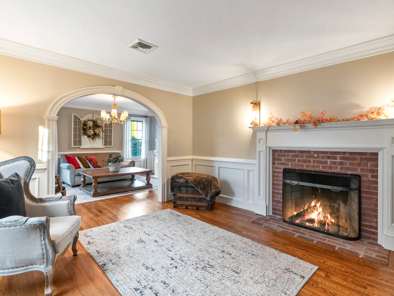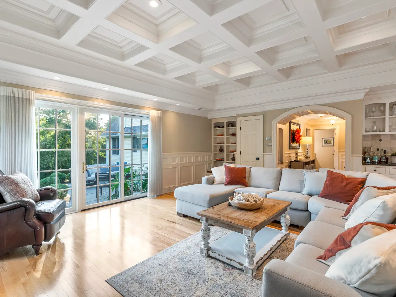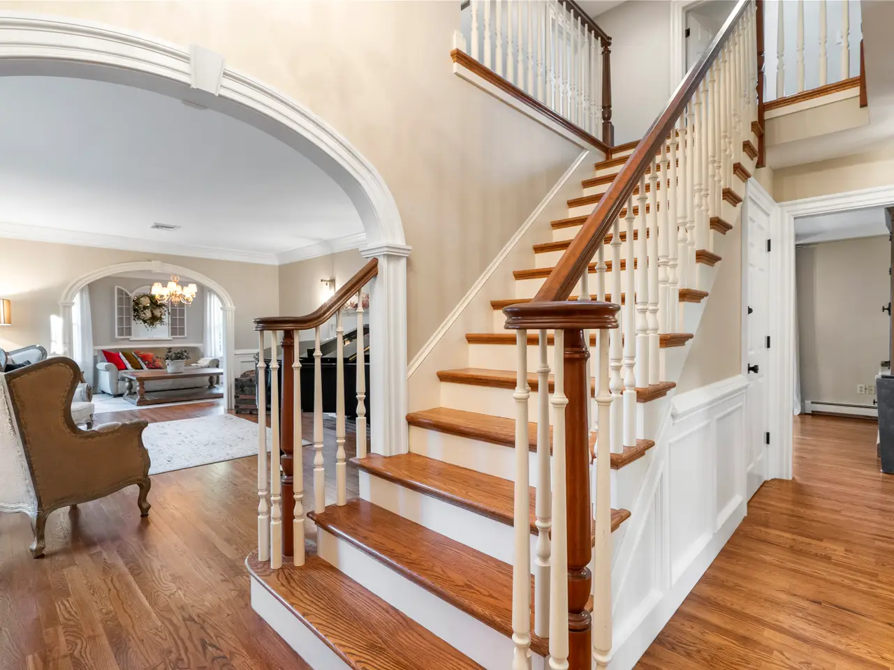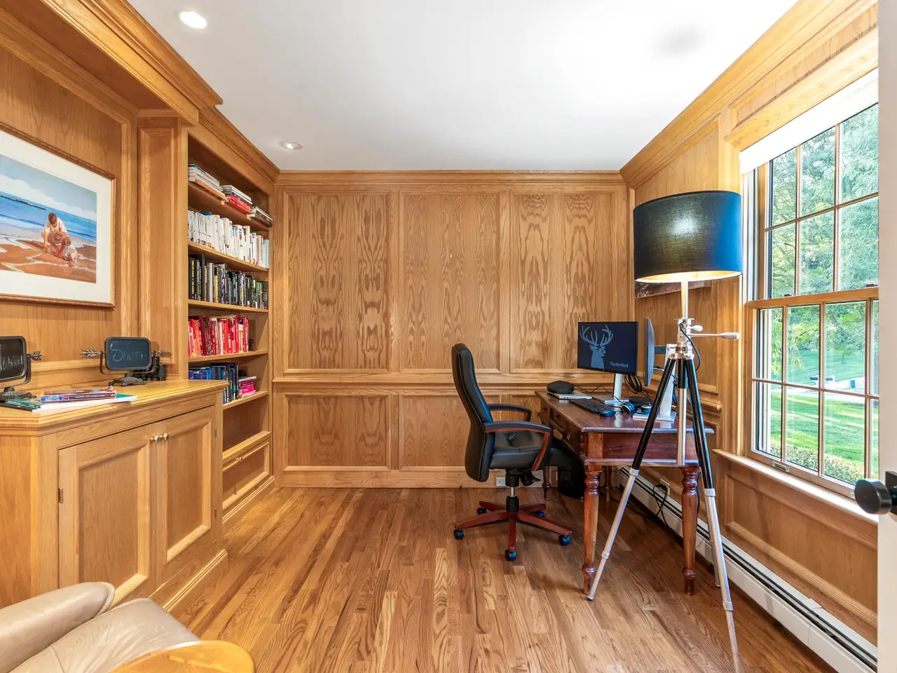 Extensive trim and molding throughout set this stunning custom home apart from any other. Every corner highlight extraordinary trim, detailed architecture, and unmatched craftsmanship. 25 meticulously crafted coffered ceilings, elegant wainscoting, multi-tiered crown molding, arched entryways, and custom inset cabinetry - a level of detail nothing short of phenomenal. Located in the coveted Red Hill neighborhood, homes rarely come on the market. Buyers often reach out to owners to inquire about selling. The home's incredible curb appeal is matched by beautifully landscaped grounds featuring a bluestone patio, outdoor TV, stone walls, fire pit, fountain, vegetable garden, and landscape lighting. Inside, there are three fireplaces that anchor the home's inviting atmosphere, while the custom kitchen offers an oversized island with second sink, two refrigerator drawers, and spacious pantry. Flowing together, the formal living and dining rooms-with a charming wood-burning fireplace-create a perfect setting for entertaining. The first-floor primary suite is exquisitely appointed, with a walk-in closet and a beautifully remodeled bath. The home office is thoughtfully designed with custom shelving, inset cabinetry, and French doors. Upstairs, a renovated full bath serves the secondary bedrooms. 650 sq. ft. finished walk-out lower level provides versatile space for entertaining, playroom, or home. Carefully crafted for both elegance and daily living, this home is truly exceptional.