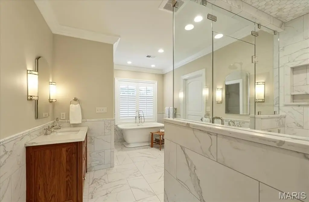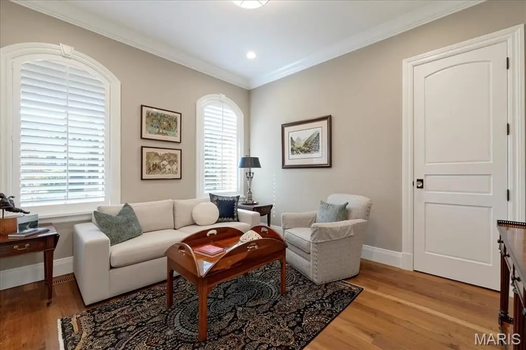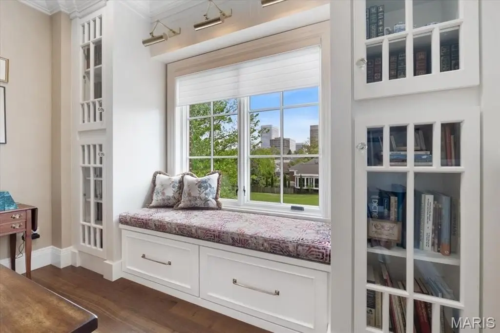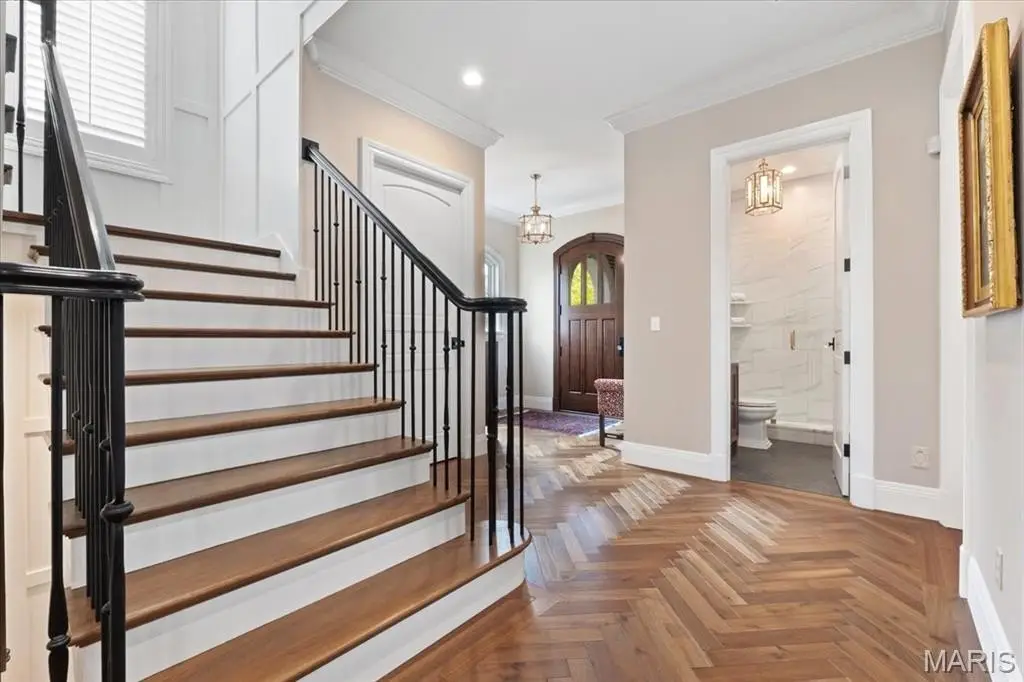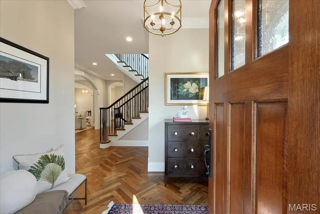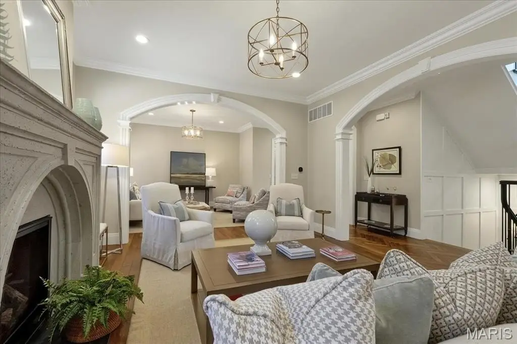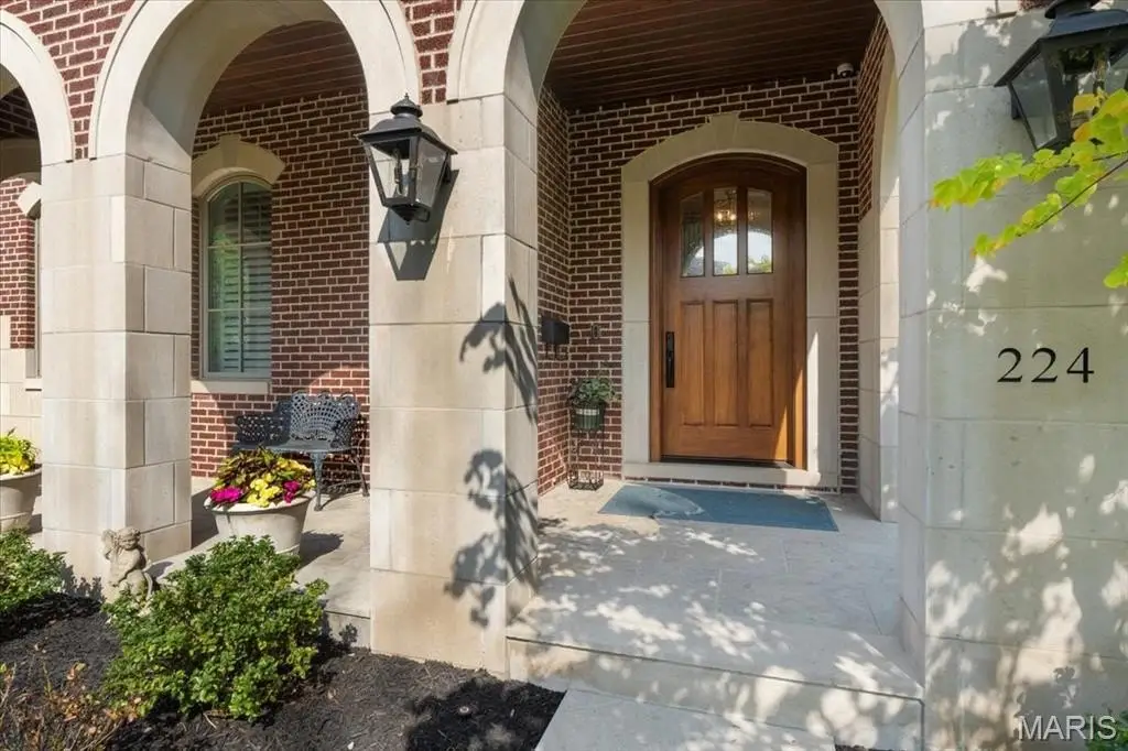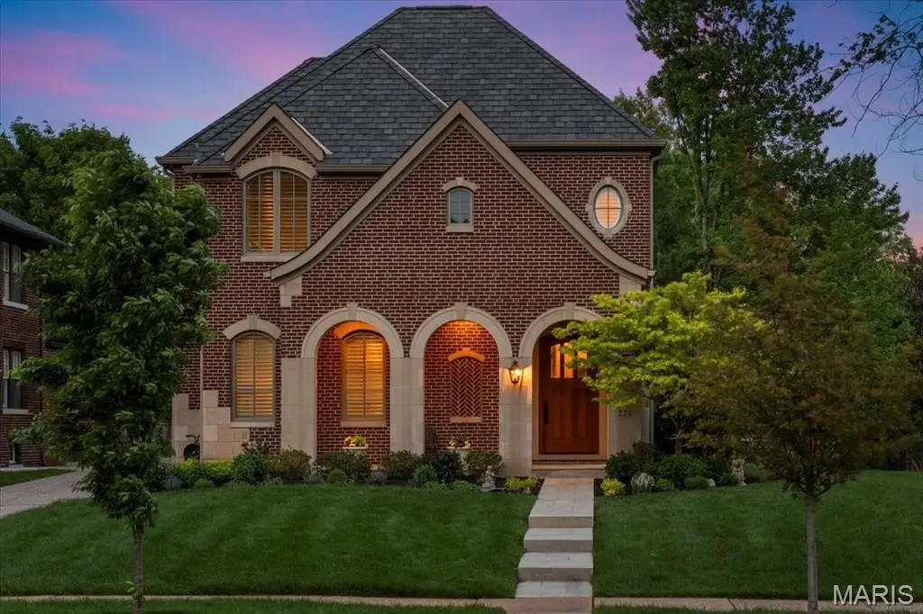 Constructed of brick and limestone, this newer home evokes the timeless charm of historic architecture while blending harmoniously into the surroundings of Old Town Clayton. Designed with impeccable attention to detail, the home boasts European oak floors, detailed moldings, and 10-foot and 9-foot ceilings on the main and second levels, offering refined comfort throughout. The gracious living room with a gas fireplace flows into a spacious dining area and a custom kitchen featuring rift-sawn Plato cabinetry, Sub-Zero and Wolf appliances, and a custom hammered stainless steel hood. The serene primary suite upstairs includes a versatile adjacent room, a large walk-in closet, and a luxurious bath with a soaking tub, steam shower, Vaughn sconces, and Robern cabinets. A second ensuite bedroom boasts restored Vitrolite tile, while a third bedroom has a direct access full bath. Completing the upper level is an oversized laundry room and a loft with leaded glass cabinetry and a window seat with views to downtown Clayton. A large family room with a wet bar, full bath, bedroom, and second laundry is found on the lower level. Additional features include geothermal HVAC, attached two-car and detached one-car heated garages, and an elevator shaft ready to serve all floors. Across from Taylor Park and within walking distance to Clayton’s shops and dining, this home offers luxury, location, and lifestyle. Optional adjacent duplex available for expanded living or investment.