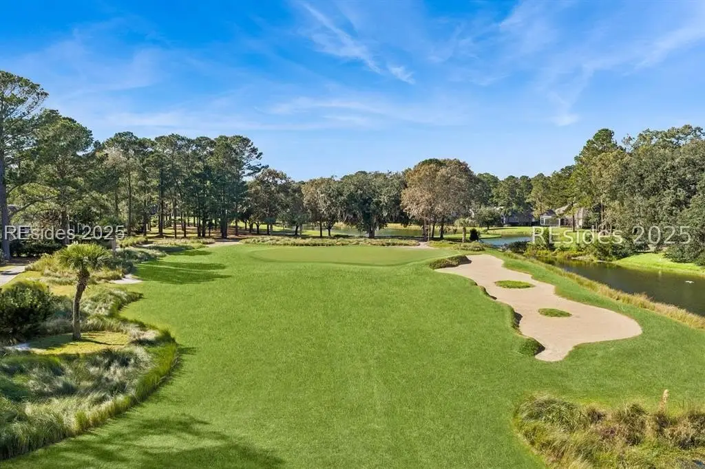 Enjoy panoramic golf and lagoon views overlooking the par 3, 2nd hole of Belfair's East Course from this beautifully crafted 4BD, 4.5BA custom residence. Designed for Lowcountry living, the open floor plan features a formal living and dining room, a great room with gas fireplace, a spacious kitchen with wine cooler, and a study with built-ins and a vaulted ceiling. Additional highlights include hardwood flooring throughout, a generous primary suite with luxurious bath, and guest bedrooms each with en-suite baths. Outdoor living is enhanced by a screened porch and open patio surrounded by lush landscaping with irrigation well. Quality details abound, Rinnai tankless water heaters, foam insulation, and a new roof installed in 2021.