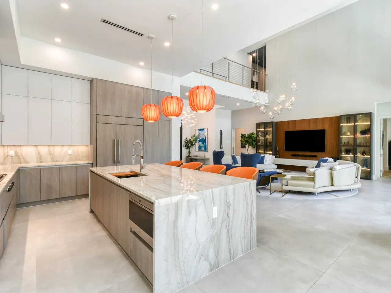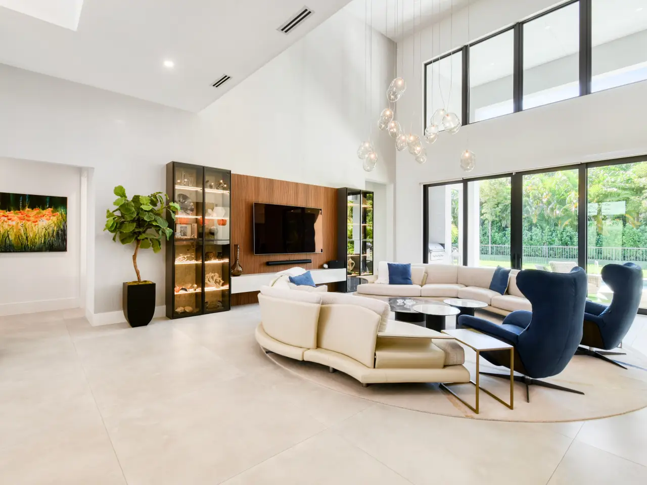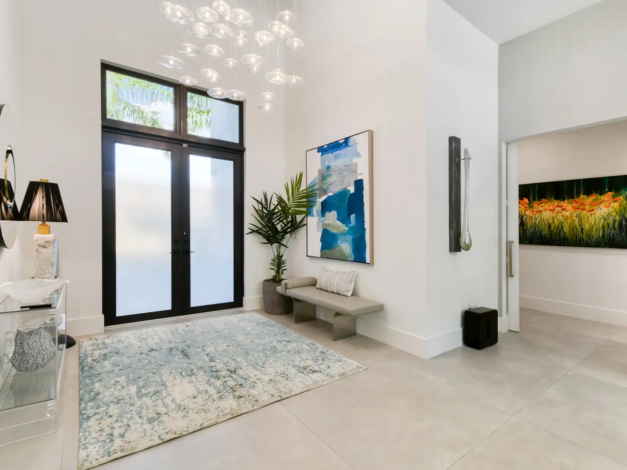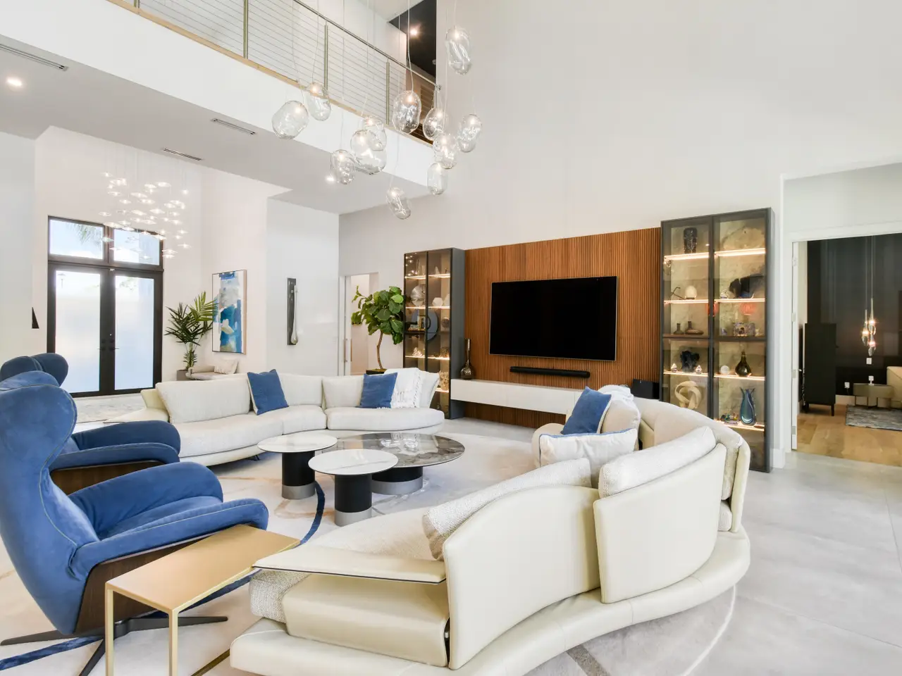 Step into elegance the moment you arrive at 18432 Symphony Court, where luxury and design meet in perfect harmony. This stunning Jupiter estate is the epitome of refined living, meticulously crafted with upscale finishes and timeless sophistication.From the grand entryway, you're greeted by imported designer chandeliers from Italy, suspended gracefully from soaring 25-foot ceilings. These radiant centerpieces illuminate a custom, backlit Italian wall unit with floating shelves, set against a stunning silk wallpaper backdrop, offering a dramatic yet elegant welcome.The open-concept layout is anchored by ravishing 48'' x 48'' porcelain tile flooring that flows throughout the main level.