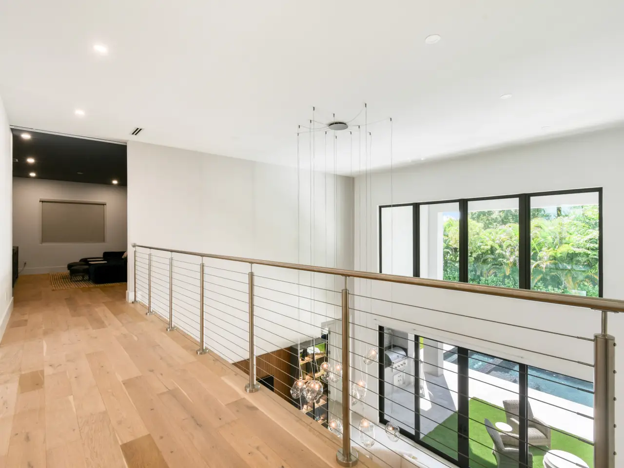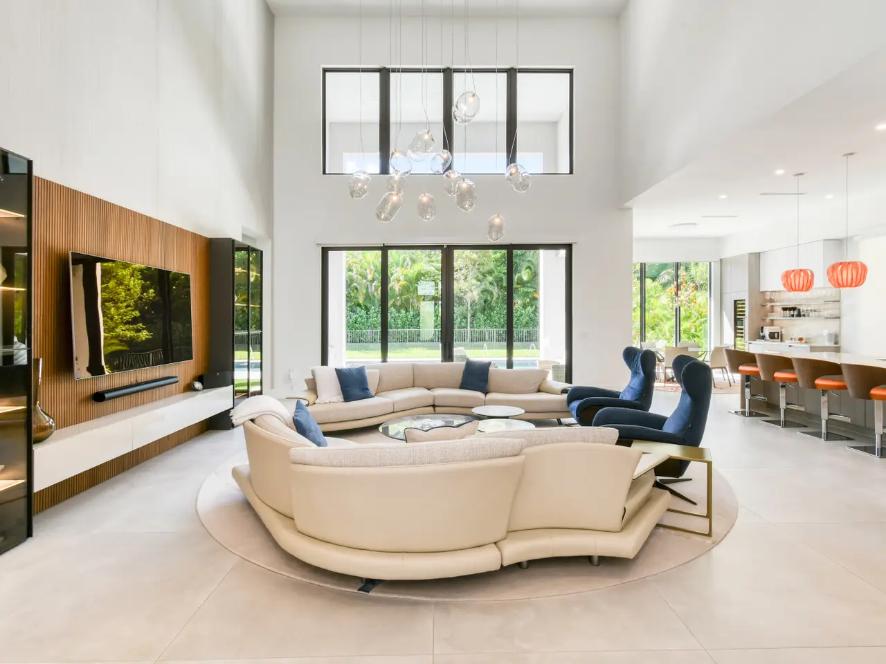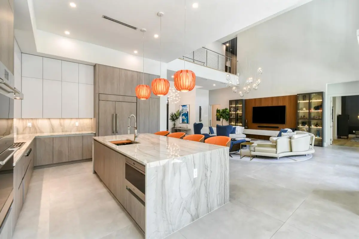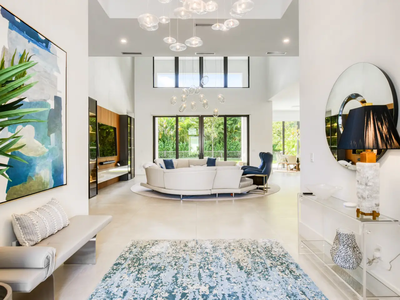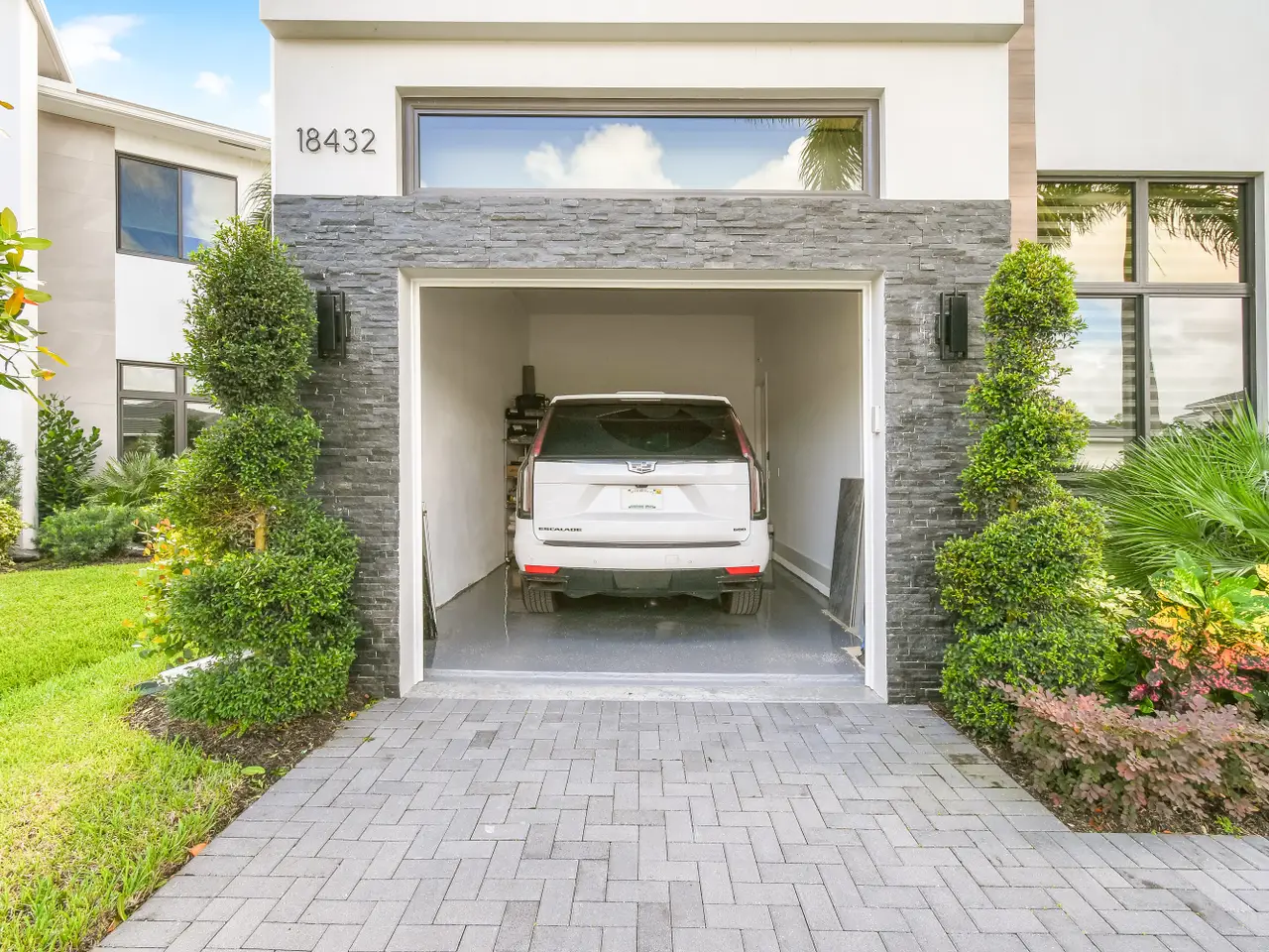 Step into elegance the moment you arrive at 18432 Symphony Court, where luxury and design meet in perfect harmony. This stunning Jupiter estate is the epitome of refined living, meticulously crafted with upscale finishes and timeless sophistication.From the grand entryway, you're greeted by imported designer chandeliers from Italy, suspended gracefully from soaring 25-foot ceilings. These radiant centerpieces illuminate a custom, backlit Italian wall unit with floating shelves, set against a stunning silk wallpaper backdrop, offering a dramatic yet elegant welcome.The open-concept layout is anchored by ravishing 48'' x 48'' porcelain tile flooring that flows throughout the main level.