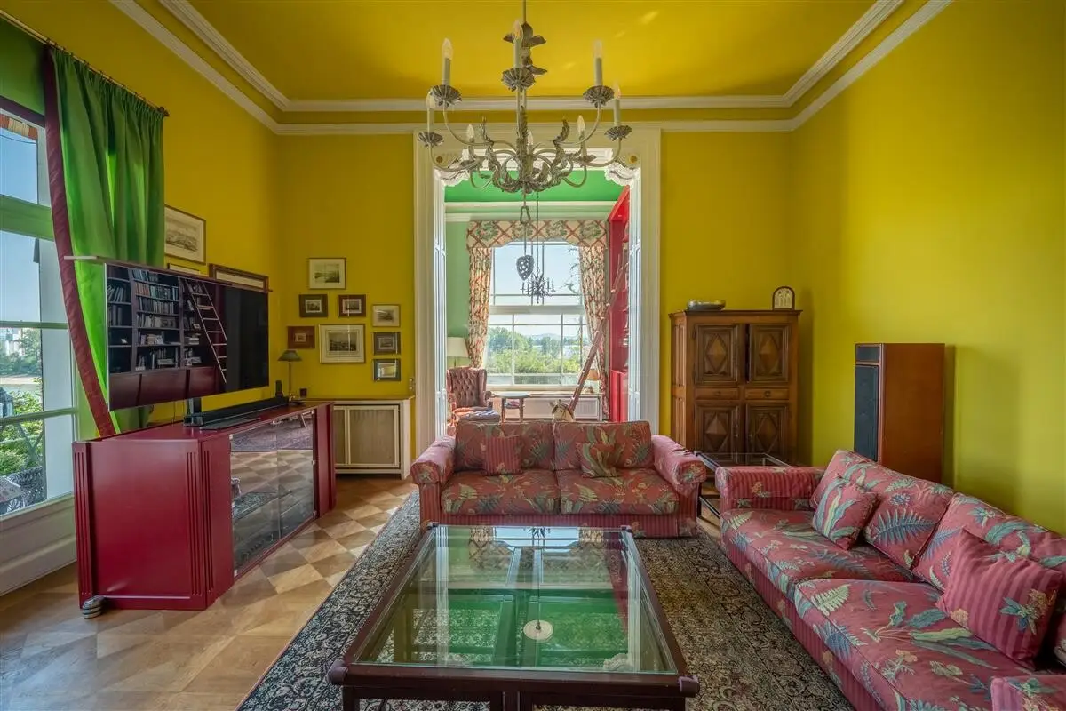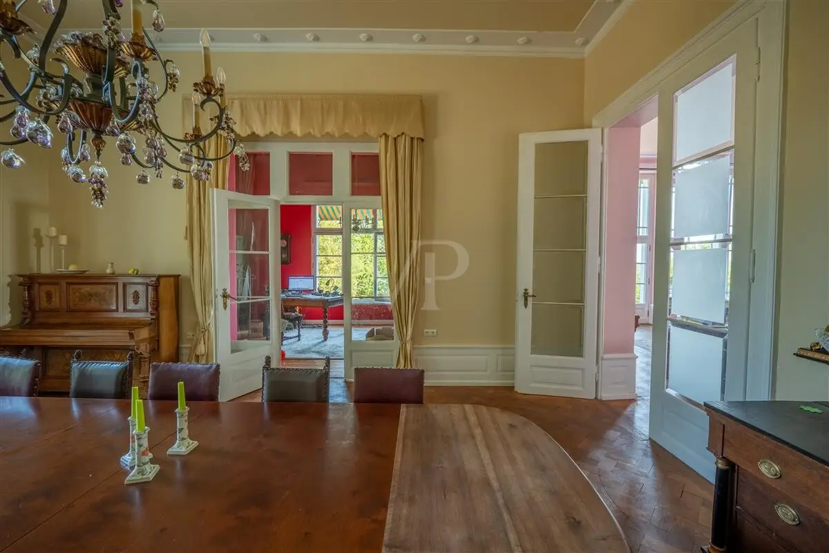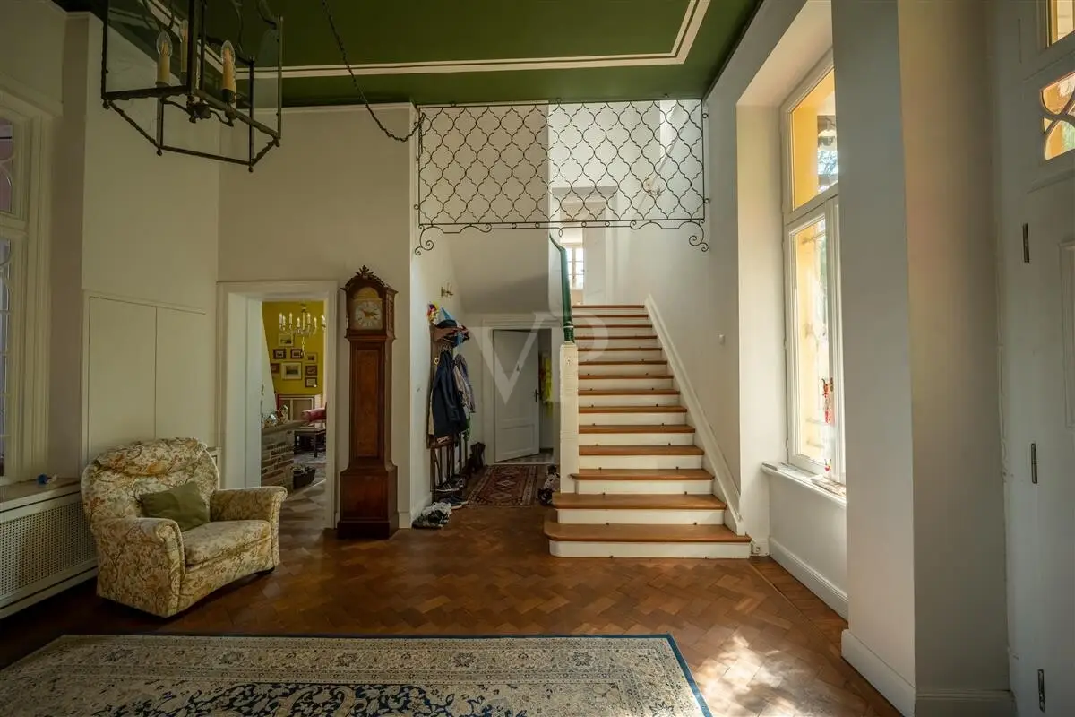 This extraordinary country villa is located on a hill in the Feldkirchen district, only 5 minutes by car from the center of Neuwied, 20 minutes from Koblenz or 45 minutes from Bonn. The history of the house dates back to 1847. Built by Privy Councillor Dr. Gottfried Leonhard August von Roentgen (son of the famous cabinetmaker David Roentgen), "Schloss Roentgen" impresses above all with its generous living space of approx. 475 m² and a park of approx. 25,000 m². Inside the villa, high ceilings and large window fronts invite you to feel at home. The original charm of the house has been preserved to this day. It has only been lovingly adapted to current standards. The bathrooms have been renovated and an additional bathroom has been created. The generously proportioned rooms and their interconnections create an enormous spatial quality, which offers you and your family sufficient space and possibilities for your own realization. From the south-west facing terrace and the balcony above, the fantastic distant view and the view of the course of the Rhine are impressive. The entire property is fenced in and the extensive park with its mature trees, beautiful paths and secluded spots invites you to linger and offers you privacy in the largest possible area. The property is located on a private road. The good infrastructure and direct transport links to the B42 round off this rare offer between Koblenz and Bonn.