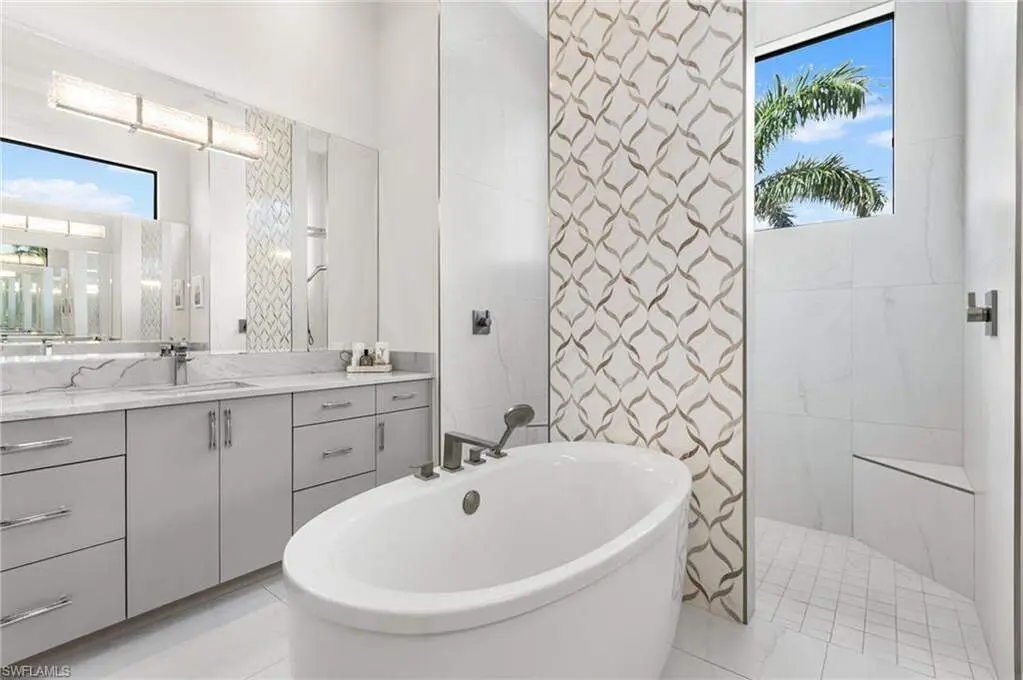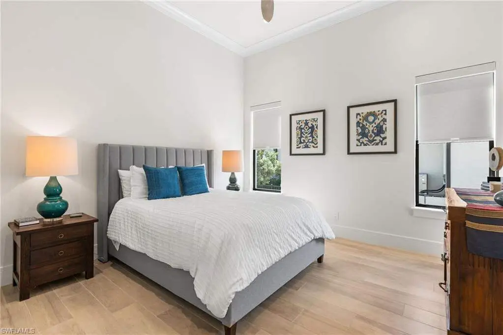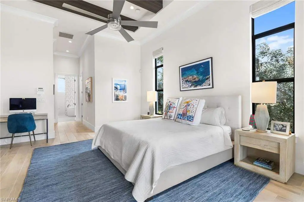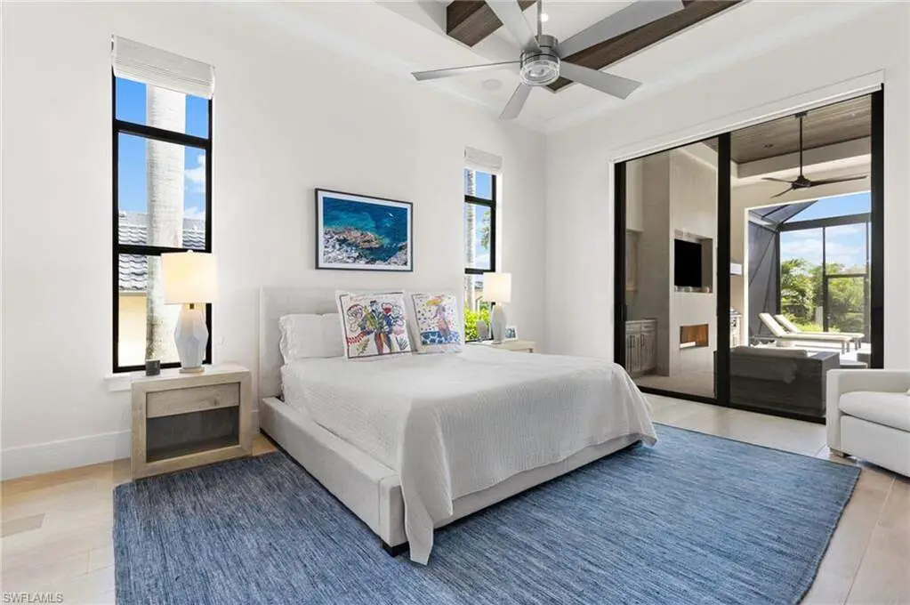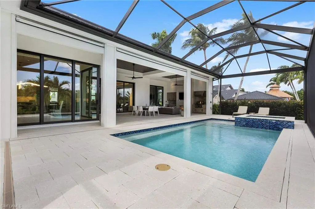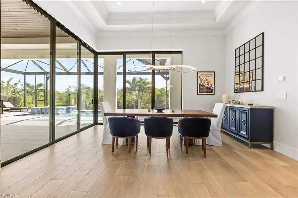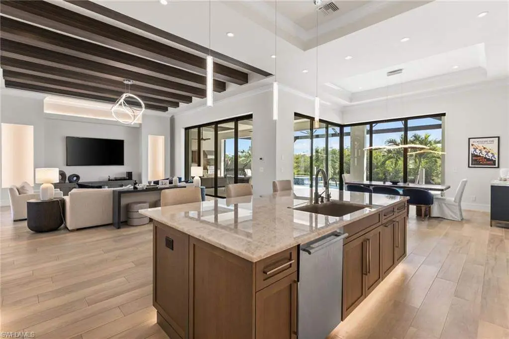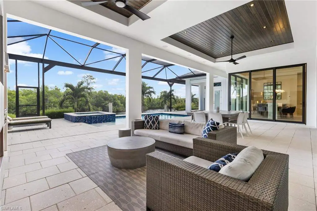 Discover luxury coastal living in this stunning one-owner home, located in the highly desirable waterfront community of Palmetto Point. Built in 2022, this 4-bedroom + den, 4 full ensuite baths and 2-half bathroom residence with a dedicated office/den and 3-car garage offers direct Gulf access-just minutes to open water-with no homes across your canal, ensuring ultimate privacy and serenity. Boasting over 3,700 sq ft of refined living space, this home seamlessly blends modern design with timeless elegance. Soaring ceilings with exposed wood beams create a grand ambiance in the main living area, while a 12-foot wall of sliding glass doors brings the outdoors in, offering panoramic views of lush mangroves and tranquil water. The open-concept chef's kitchen is a dream come true, featuring a massive quartz island, Thermador appliances, a morning kitchen with a second refrigerator and wine cooler, and abundant space for entertaining. The formal dining room overlooks the water, adding to the home's sophisticated layout. The primary suite offers direct lanai access, two oversized custom closets, and a spa-inspired ensuite bathroom with dual vanities, a separate soaking tub, and an expansive walk-through shower. Each guest bedroom includes its own private ensuite bath and walk in closets for ultimate comfort and convenience. Step outside to your massive covered lanai with tongue-and-groove ceilings, a sparkling turquoise salt water pool, a fully equipped outdoor kitchen (Sedona grill, refrigerator, sink), fire pit, outdoor shower, and pool bath-perfect for entertaining year-round. An 80-ft floating concrete dock is ready for your boat and water toys and can accomodate a yacht up to 100 ft. Additional high-end features include: Hurricane impact doors and windows Solid core interior doors throughout Tankless water heater Mini-split A/C in garage with finished epoxy floor Pavered driveway Spacious laundry room with sink and extra storage This move-in ready waterfront masterpiece offers quintessential indoor-outdoor Florida living at its finest. Don't miss your chance to own in one of the area's most prestigious boating communities.