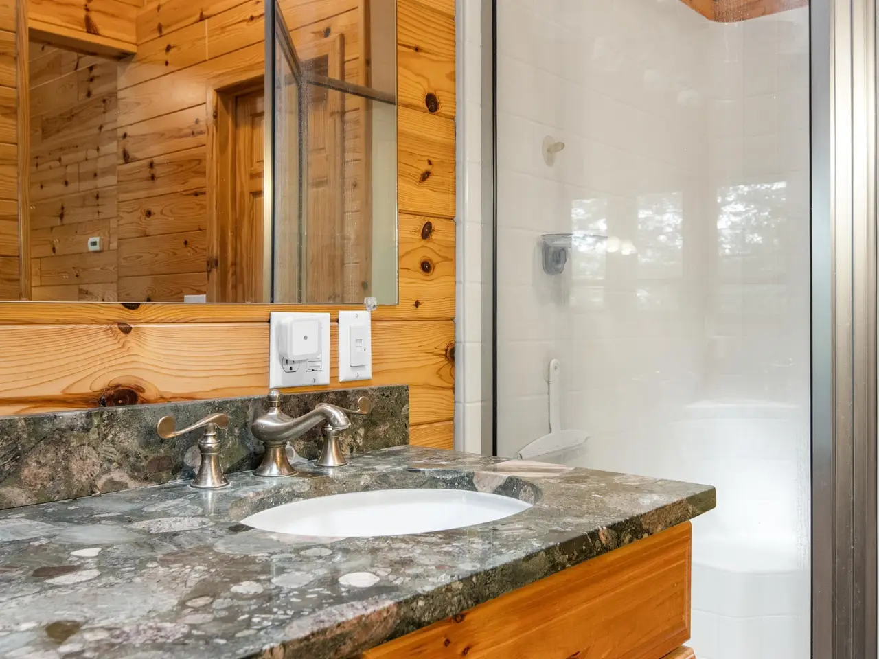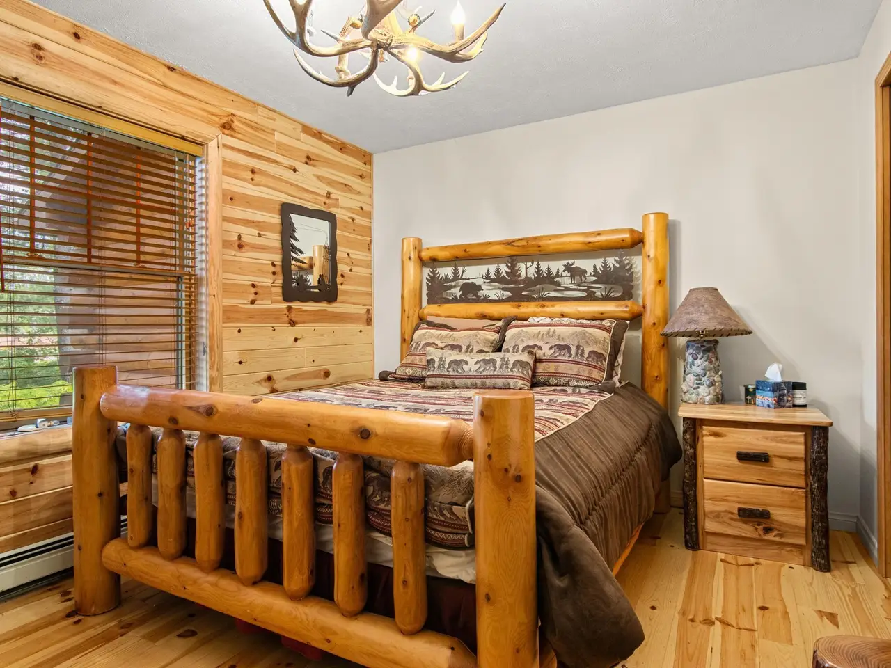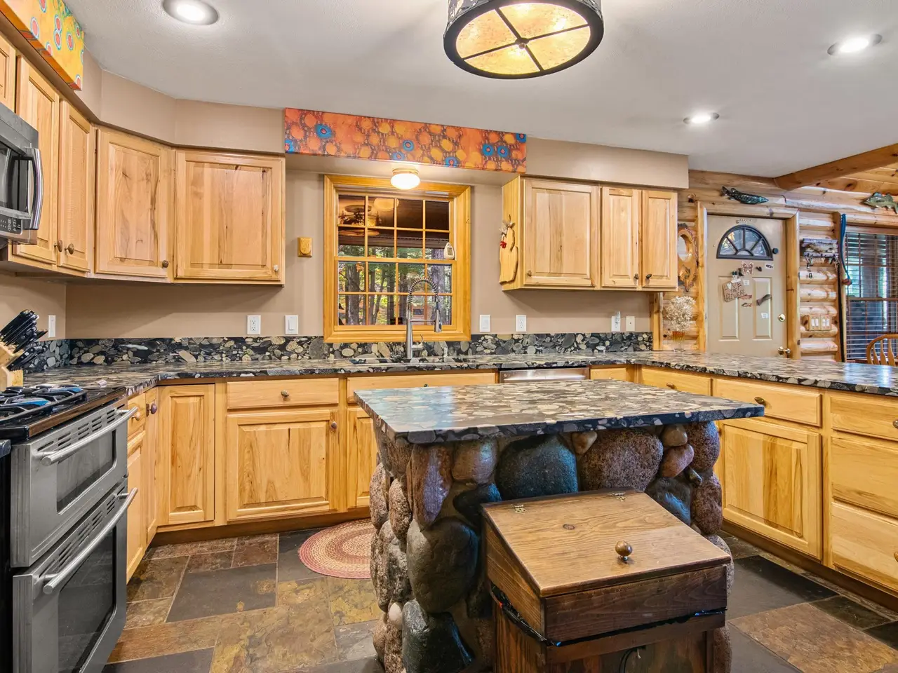 • Masonry stone fireplace with custom juniper mantel
