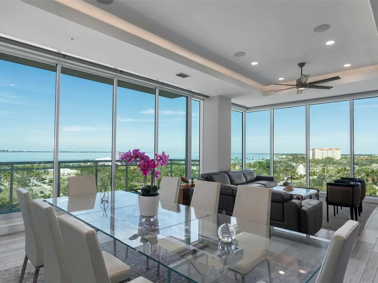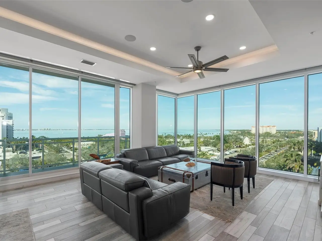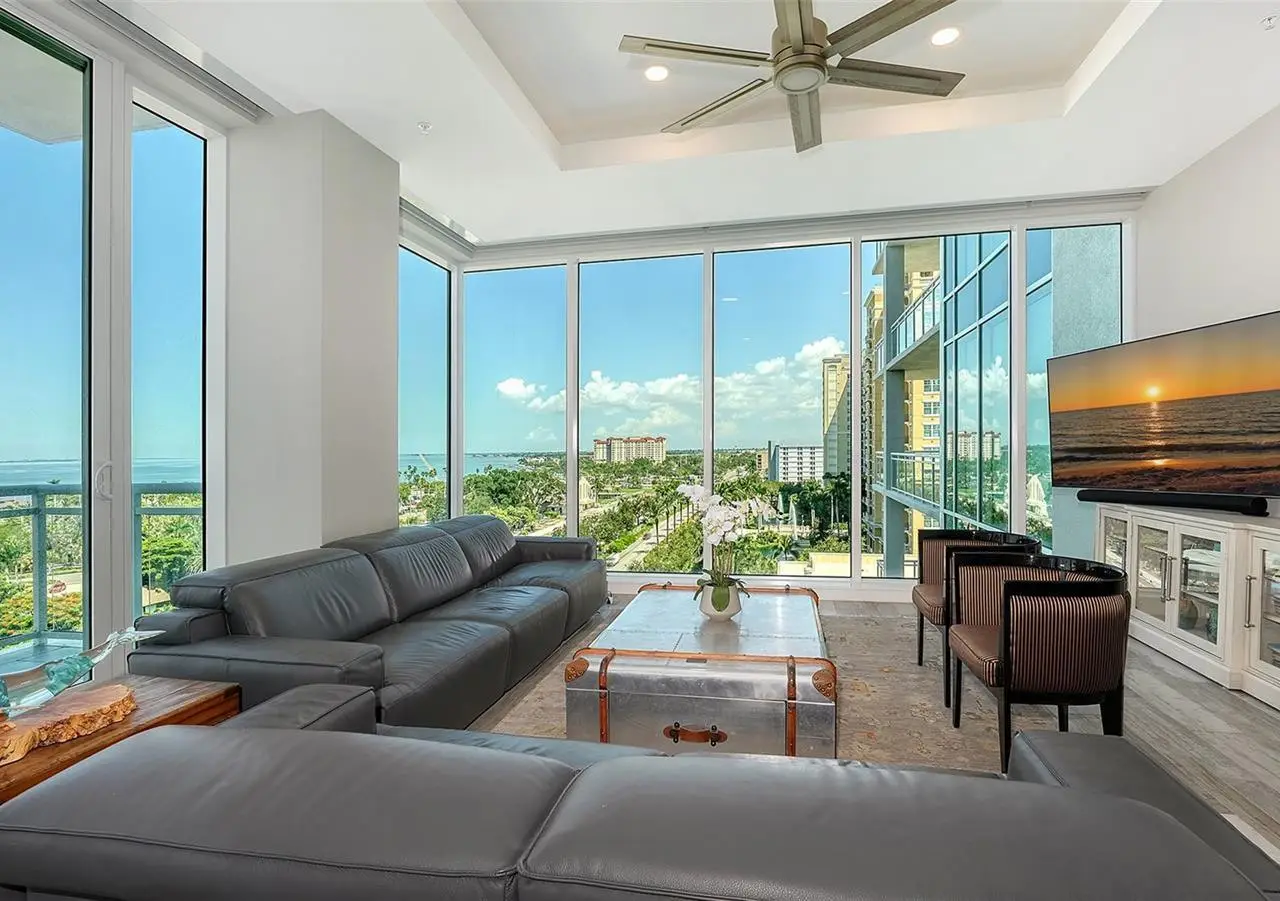 Welcome to your magnificent home in the sky at the sought-after & highly amenitized BLVD Sarasota which boasts some of the most breathtaking panoramic Bayfront and City views in all of Sarasota with second-to-none vistas, sunrises, & sunsets encapsulated by vast floor-to-ceiling impact windows and a 12' impact sliding door. This 8th floor condo in the desired 02 stack features 3 sprawling open-air terraces w/ glass railings & tile flooring, & boasts 3962 sf, 3 bedrooms, 3.5 baths & luxurious finishes & countless one-of-a-kind updates where no expense has been spared in design, material, finish, technology, or resident experience. A private access-controlled elevator opens directly into your foyer where the expansive open-concept great room & dining area & those stunning views meet the state-of-the-art Chef's kitchen. The beautiful open space includes a large working/social Caesarstone Quartz waterfall island & countertops, custom wet bar w/ Scotsman ice machine, 46 bottle Subzero wine fridge and Elkay martini-glass shaped bar sink, and chic Italian tile backsplash. High-quality stainless Thermador kitchen appliances featuring 3' refrigerator and 18" freezer, natural gas 6 burner with griddle range/dual oven, oversized hood, slide-out microwave, & upgraded dishwasher. Premium custom cabinetry w/ soft-close doors/drawers, under cabinet task lighting, & spacious pantry, complete the design forward space. 3 lavish & spacious bedroom suites each w/ private terrace access and luxurious en-suite baths w/ lighted mirrors. The primary is complete w/ spacious custom built-in with refrigerator, dual walk-in California closets & primary bath including glass/tile oversized shower w/ dual showerheads, walk-in soaking tub, floating dual sink vanities & premium cabinetry w/Caesarstone Quartz counters. A lovely powder room & separate laundry room w/ cabinetry, sink & Electrolux high-capacity front load washer/dryer with pedestals are conveniently located. Enhanced by Wicked Smart Homes, the state-of-the-art smart home system features Lutron lighting & motorized black-out & privacy shades, Sonos surround sound system w/ 6 amplifiers, in-wall subwoofer & other advanced automation, ensuring ultimate comfort/convenience. Other noteworthy residence features: Cove lighting, 8-foot-tall entry doors, solid-core interior doors many w/ custom glass, designer recessed light fixtures throughout. This unit is 1 of just a few w/ private 2-car garage (available under a separate contract) & 2 additional secure premium parking spaces & air conditioned private storage locker. BLVD, centrally located in the Rosemary District, w/ only 49 residences & its unique amenities set it apart from all other luxury condominiums on the Suncoast. Amenities include: Full building water softener, Rooftop infinity-edge pool & outdoor kitchen, fully staffed reception lobby & controlled building access, Wine Cellar w/ private lockers & wine tasting table, Pet Lawn & Grooming Station, Indoor Golf Driving Range, Owners Lounge, Conference Center & state-of-the-art Fitness Center. BLVD residents are only an elevator ride away from 1000 North, a members-only dining Club opening in 2025. Minutes to #1 rated Siesta Key Beach, retail shopping at St Armand's & all that downtown Sarasota has to offer. Rarely does a home of this caliber become available - don't miss the chance to own a piece of Sarasota's most coveted address.