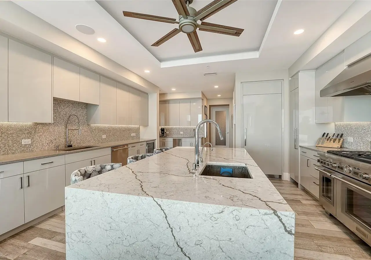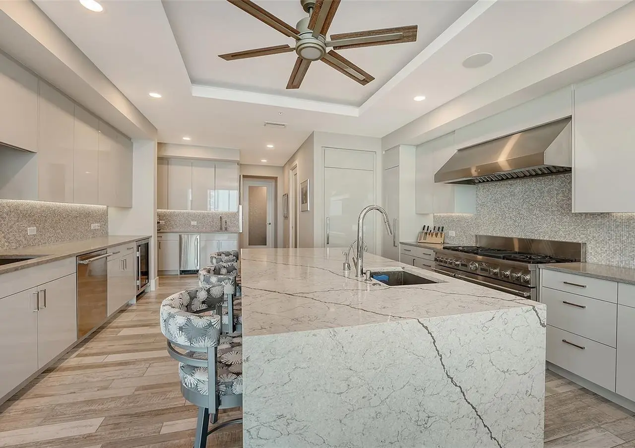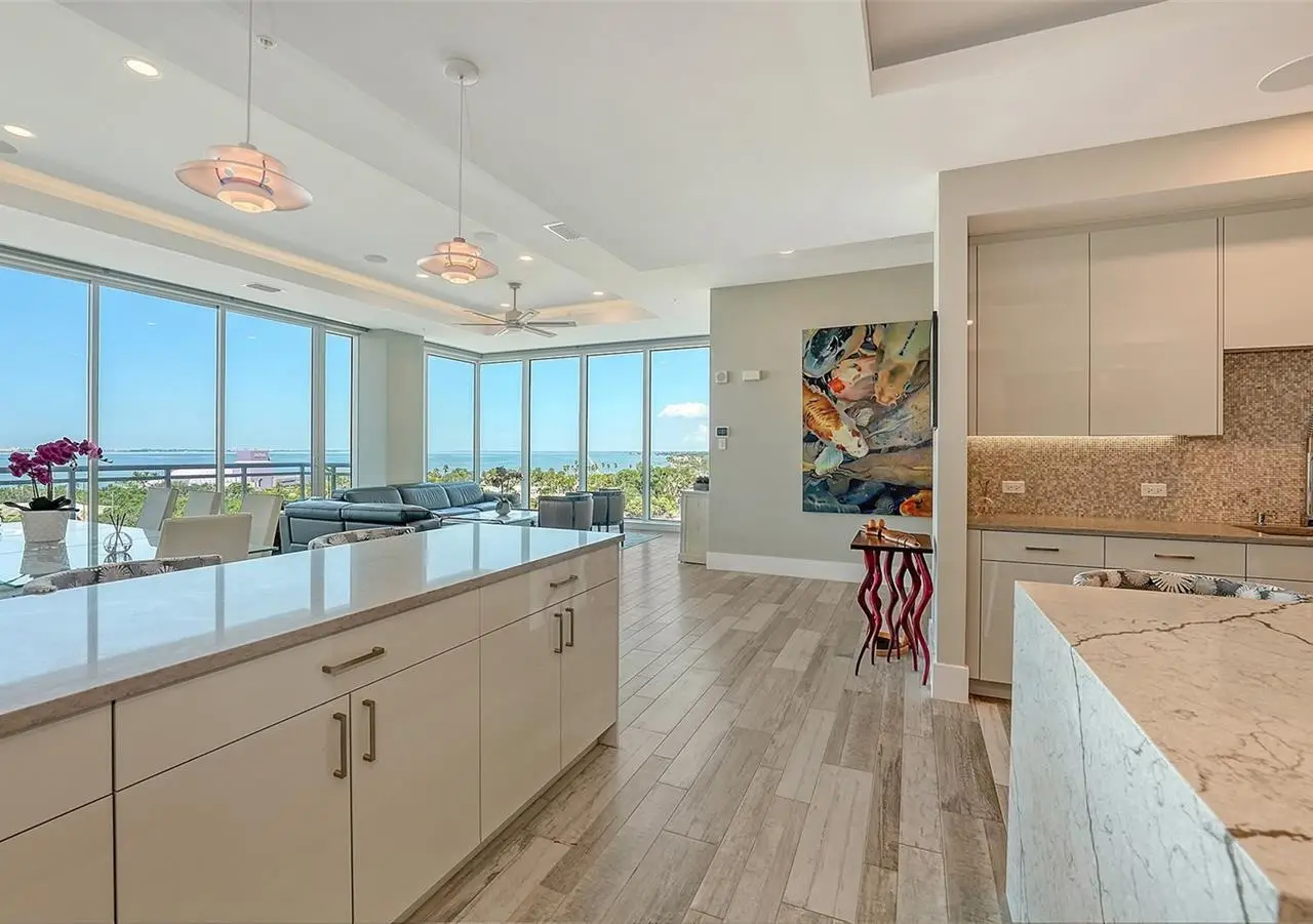Welcome to your magnificent home in the sky at the sought-after & highly amenitized BLVD Sarasota which boasts some of the most breathtaking panoramic Bayfront and City views in all of Sarasota with second-to-none vistas, sunrises, & sunsets encapsulated by vast floor-to-ceiling impact windows and a 12' impact sliding door. This 8th floor condo in the desired 02 stack features 3 sprawling open-air terraces w/ glass railings & tile flooring, & boasts 3962 sf, 3 bedrooms, 3.5 baths & luxurious finishes & countless one-of-a-kind updates where no expense has been spared in design, material, finish, technology, or resident experience. A private access-controlled elevator opens directly into your foyer where the expansive open-concept great room & dining area & those stunning views meet the state-of-the-art Chef's kitchen. The beautiful open space includes a large working/social Caesarstone Quartz waterfall island & countertops, custom wet bar w/ Scotsman ice machine, 46 bottle Subzero wine fridge and Elkay martini-glass shaped bar sink, and chic Italian tile backsplash. High-quality stainless Thermador kitchen appliances featuring 3' refrigerator and 18" freezer, natural gas 6 burner with griddle range/dual oven, oversized hood, slide-out microwave, & upgraded dishwasher. Premium custom cabinetry w/ soft-close doors/drawers, under cabinet task lighting, & spacious pantry, complete the design forward space. 3 lavish & spacious bedroom suites each w/ private terrace access and luxurious en-suite baths w/ lighted mirrors. The primary is complete w/ spacious custom built-in with refrigerator, dual walk-in California closets & primary bath including glass/tile oversized shower w/ dual showerheads, walk-in soaking tub, floating dual sink vanities & premium cabinetry w/Caesarstone Quartz counters. A lovely powder room & separate laundry room w/ cabinetry, sink & Electrolux high-capacity front load washer/dryer with pedestals are conveniently located. Enhanced by Wicked Smart Homes, the state-of-the-art smart home system features Lutron lighting & motorized black-out & privacy shades, Sonos surround sound system w/ 6 amplifiers, in-wall subwoofer & other advanced automation, ensuring ultimate comfort/convenience. Other noteworthy residence features: Cove lighting, 8-foot-tall entry doors, solid-core interior doors many w/ custom glass, designer recessed light fixtures throughout. This unit is 1 of just a few w/ private 2-car garage (available under a separate contract) & 2 additional secure premium parking spaces & air conditioned private storage locker. BLVD, centrally located in the Rosemary District, w/ only 49 residences & its unique amenities set it apart from all other luxury condominiums on the Suncoast. Amenities include: Full building water softener, Rooftop infinity-edge pool & outdoor kitchen, fully staffed reception lobby & controlled building access, Wine Cellar w/ private lockers & wine tasting table, Pet Lawn & Grooming Station, Indoor Golf Driving Range, Owners Lounge, Conference Center & state-of-the-art Fitness Center. BLVD residents are only an elevator ride away from 1000 North, a members-only dining Club opening in 2025. Minutes to #1 rated Siesta Key Beach, retail shopping at St Armand's & all that downtown Sarasota has to offer. Rarely does a home of this caliber become available - don't miss the chance to own a piece of Sarasota's most coveted address.