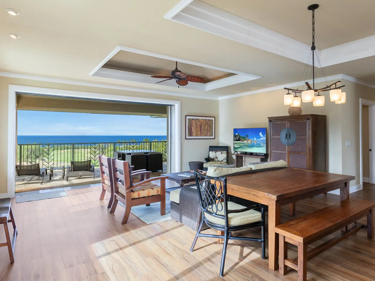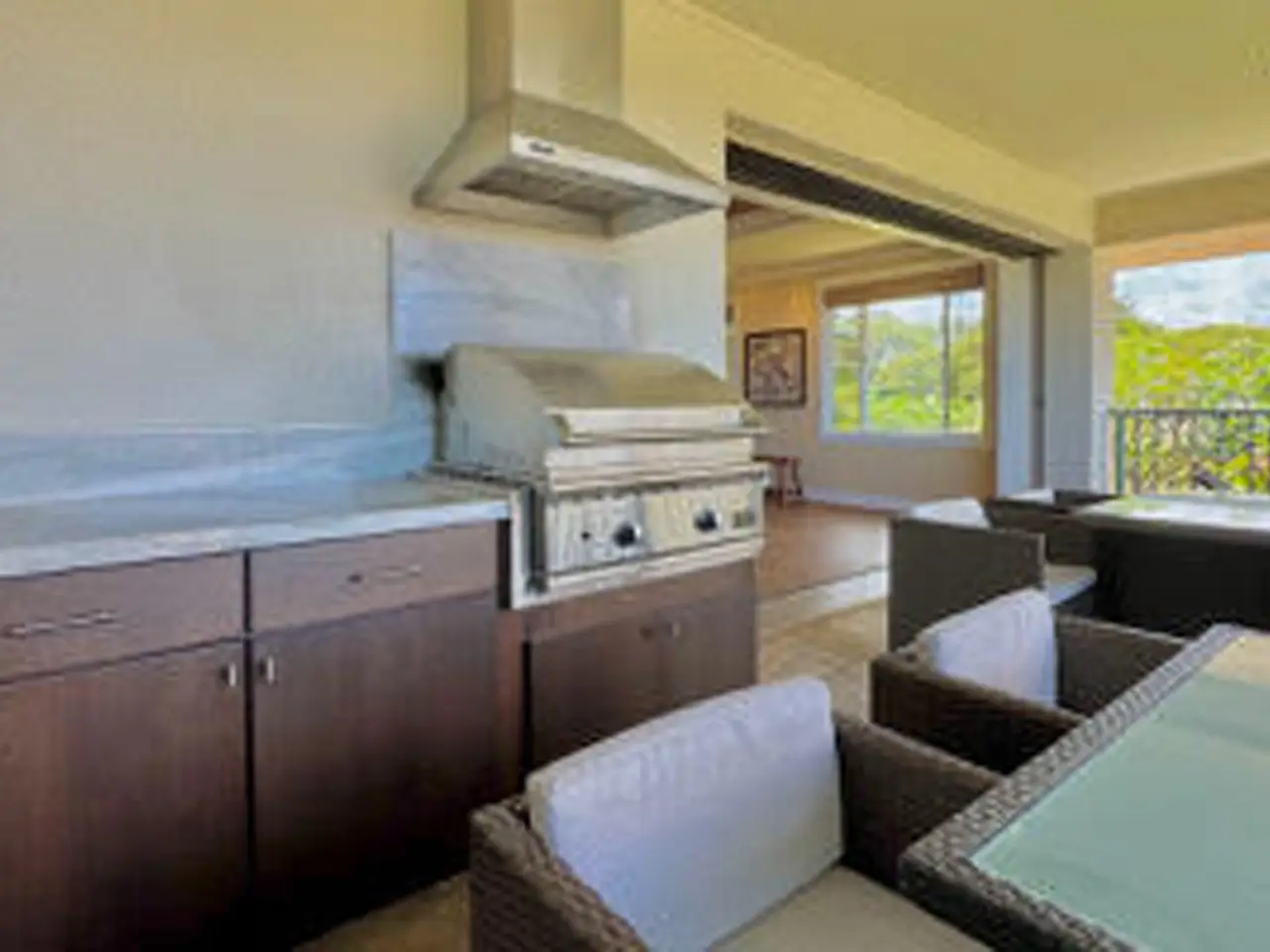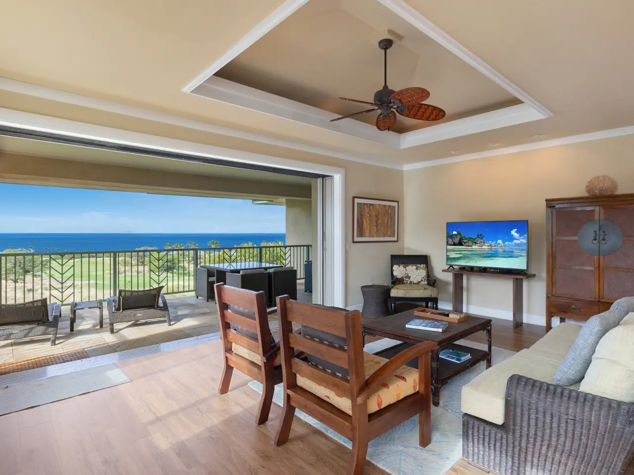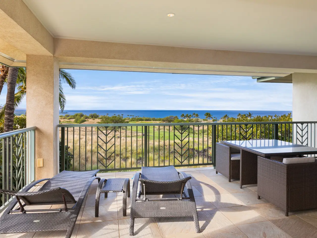 Wai'ula'ula A201 is positioned as arguably the best-located unit within the community. Overlooking the 15th fairway of the Hapuna Golf Course, this "front row" ridge unit boasts unobstructed ocean and coastline views, along with stunning year-round sunset vistas. This is the first time the unit has ever been offered for resale. Additionally, the "A" building of Wa'ula'ula served as the model building during the initial sales phase by the developer due to its exceptional location and expansive views.Wai'ula'ula A201 offers a seamless transition as it is being sold fully furnished, including beautiful artwork (some pieces by local artists) and is move-in ready. This 3-bedroom, 3-bathroom unit boasts two master bedrooms overlooking stunning views. With 2,111 square feet of air-conditioned living space and a generous 253-square-foot covered lanai, it also includes a spacious one-car garage with storage and an additional uncovered, undesignated parking stall.The unit has an STVR with some advanced bookings already in place. Features of this premier upstairs unit include natural stone floors in the kitchen, bathrooms and laundry, recently installed water resistant plank floors in the great room, hallway and bedrooms, vaulted ceilings with crown molding, wood cabinetry throughout, framed pocket doors and custom window coverings. Stainless steel kitchen appliances include a SubZero refrigerator, Bosch dishwasher, Wolf gas cook-top, wall oven and microwave. This outdoor lanai features a built-in brushed stainless DCS grill with a Viking hood, set against a Bella Pietra Quartzite countertop and backsplash. Custom Thomasville cabinetry in a dark finish with modern hardware completes the sleek, functional design.Mauna Kea Resort is currently undergoing a $180M renovation, set for completion in late 2025. The transformative project includes a revitalization of all four dining venues, and the addition of a world-class destination spa with an infinity pool.