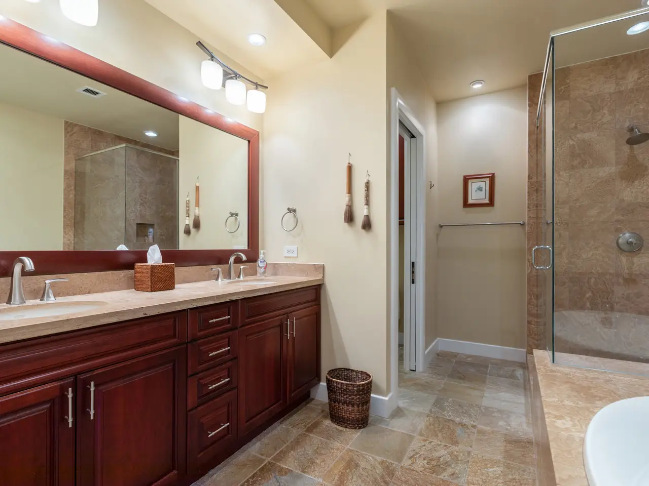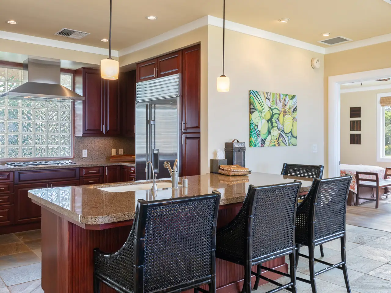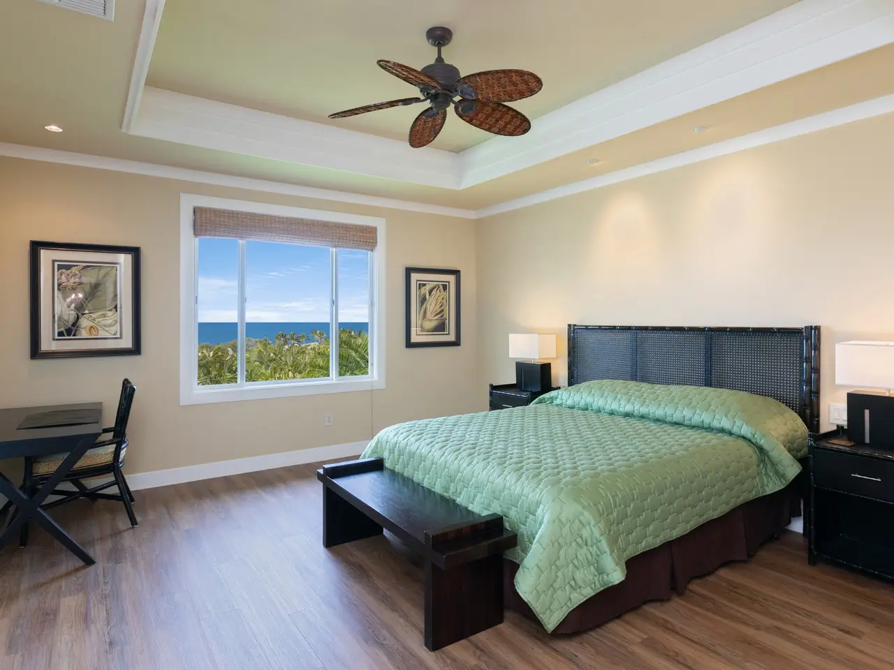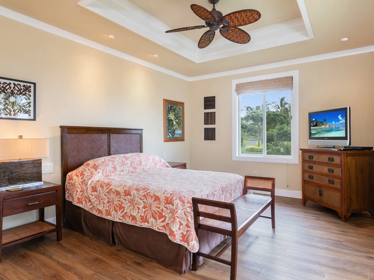 Wai'ula'ula A201 is positioned as arguably the best-located unit within the community. Overlooking the 15th fairway of the Hapuna Golf Course, this "front row" ridge unit boasts unobstructed ocean and coastline views, along with stunning year-round sunset vistas. This is the first time the unit has ever been offered for resale. Additionally, the "A" building of Wa'ula'ula served as the model building during the initial sales phase by the developer due to its exceptional location and expansive views.Wai'ula'ula A201 offers a seamless transition as it is being sold fully furnished, including beautiful artwork (some pieces by local artists) and is move-in ready. This 3-bedroom, 3-bathroom unit boasts two master bedrooms overlooking stunning views. With 2,111 square feet of air-conditioned living space and a generous 253-square-foot covered lanai, it also includes a spacious one-car garage with storage and an additional uncovered, undesignated parking stall.The unit has an STVR with some advanced bookings already in place. Features of this premier upstairs unit include natural stone floors in the kitchen, bathrooms and laundry, recently installed water resistant plank floors in the great room, hallway and bedrooms, vaulted ceilings with crown molding, wood cabinetry throughout, framed pocket doors and custom window coverings. Stainless steel kitchen appliances include a SubZero refrigerator, Bosch dishwasher, Wolf gas cook-top, wall oven and microwave. This outdoor lanai features a built-in brushed stainless DCS grill with a Viking hood, set against a Bella Pietra Quartzite countertop and backsplash. Custom Thomasville cabinetry in a dark finish with modern hardware completes the sleek, functional design.Mauna Kea Resort is currently undergoing a $180M renovation, set for completion in late 2025. The transformative project includes a revitalization of all four dining venues, and the addition of a world-class destination spa with an infinity pool.