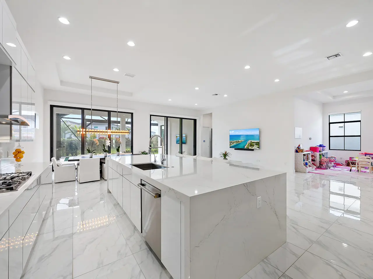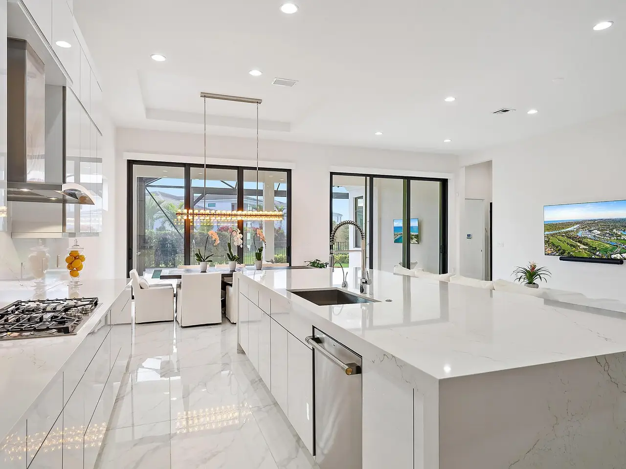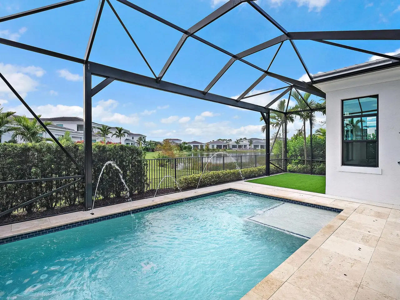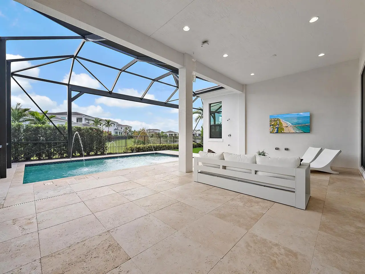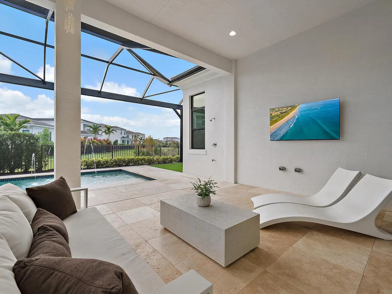 A sanctuary of balance and design, this one-level home spans over 3,000 SQ. FT. of living space with 3 bedrooms, 3.5 baths, and an oversized den or fourth bedroom. The grand foyer features 17-foot ceilings, and 12 feet throughout the home. Only one owner of this new construction home that closed in 2024. The kitchen's statement island anchors the space and the kitchen features a full quartz backsplash, sleek acrylic touch-latch cabinetry, and GE Monogram appliances complemented by Restoration Hardware lighting. The serene primary suite features wood floors, a floating double vanity, soaking tub, walk-in shower, automatic shades, and views of the saltwater pool. California Closets and roller shades in all rooms. Outdoors, relax on your travertine patio with large lanai, screened enclosure
