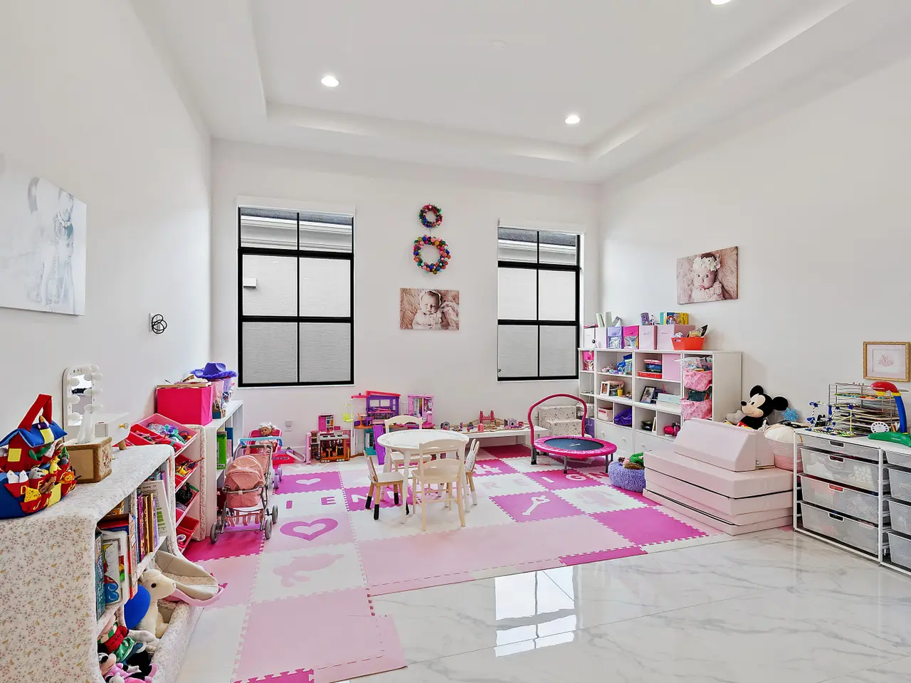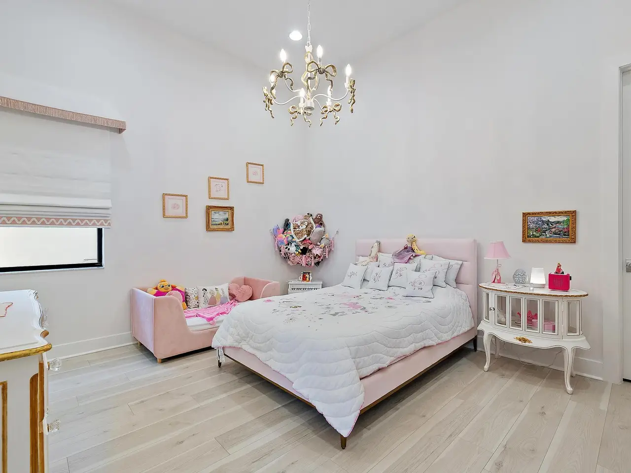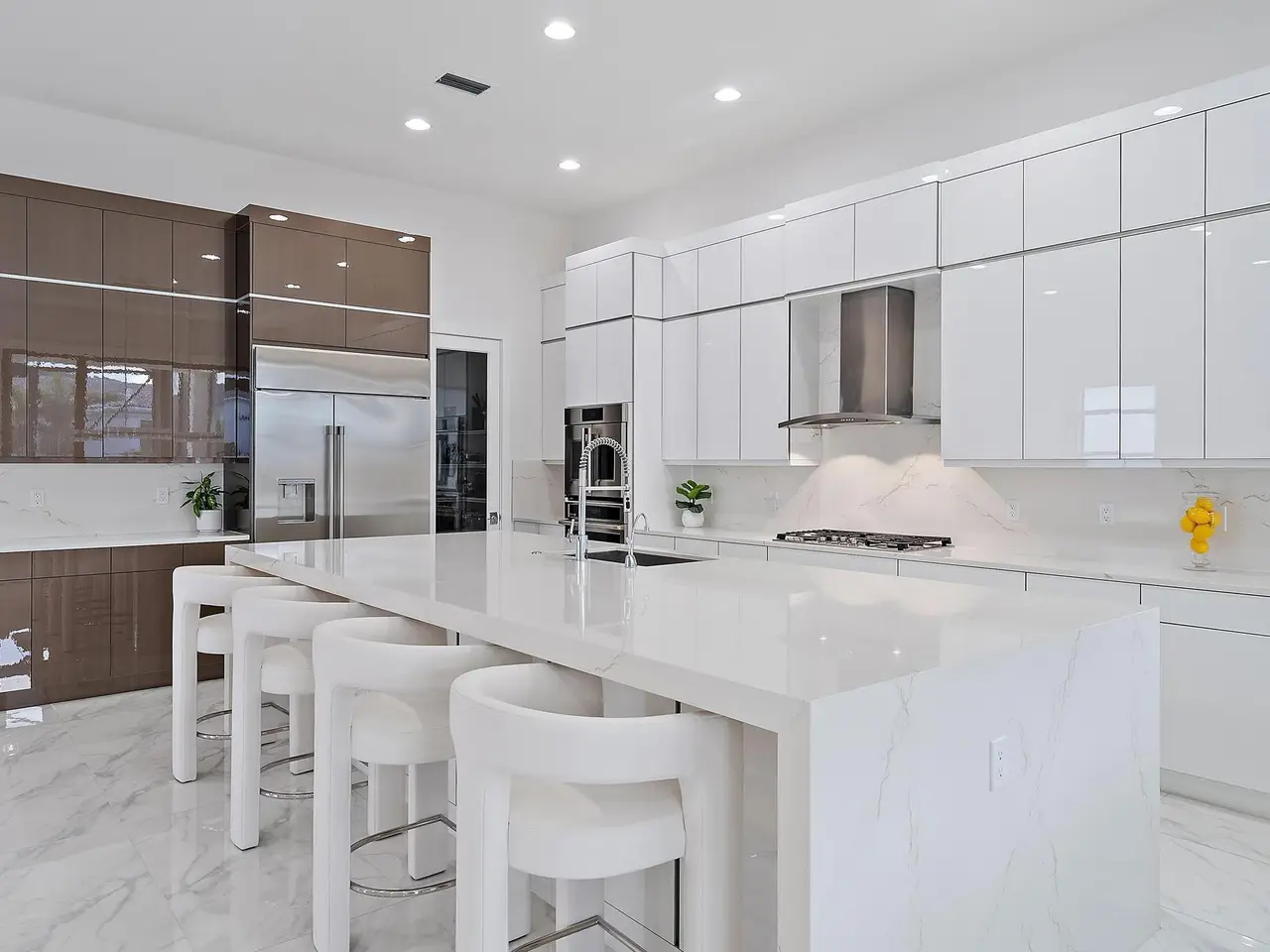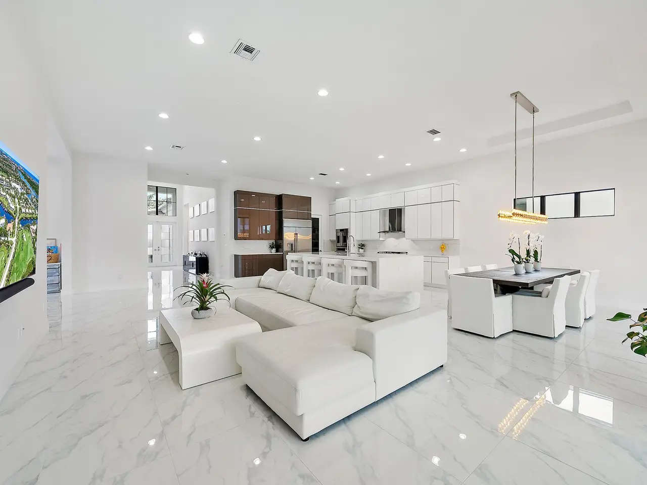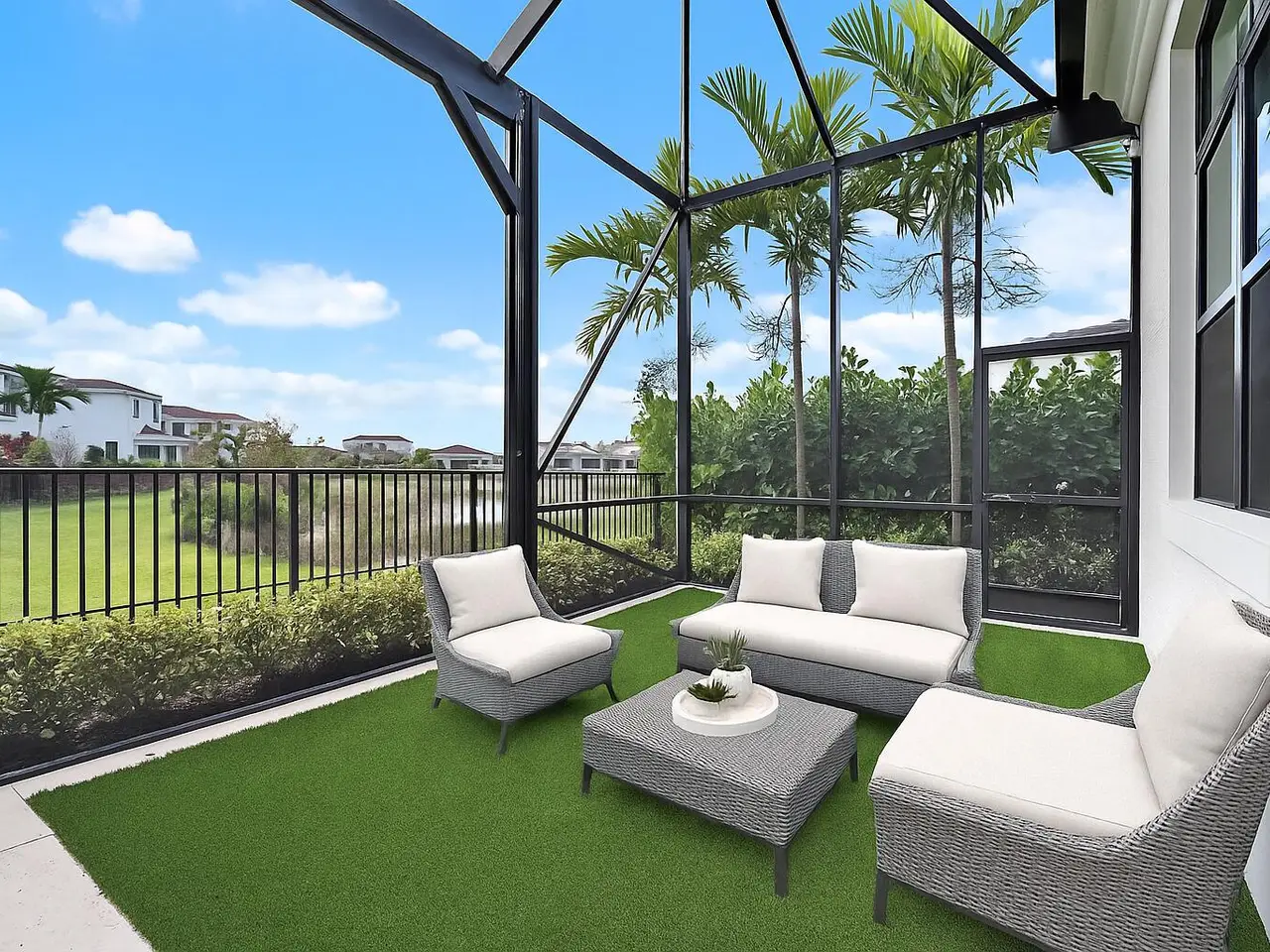 A sanctuary of balance and design, this one-level home spans over 3,000 SQ. FT. of living space with 3 bedrooms, 3.5 baths, and an oversized den or fourth bedroom. The grand foyer features 17-foot ceilings, and 12 feet throughout the home. Only one owner of this new construction home that closed in 2024. The kitchen's statement island anchors the space and the kitchen features a full quartz backsplash, sleek acrylic touch-latch cabinetry, and GE Monogram appliances complemented by Restoration Hardware lighting. The serene primary suite features wood floors, a floating double vanity, soaking tub, walk-in shower, automatic shades, and views of the saltwater pool. California Closets and roller shades in all rooms. Outdoors, relax on your travertine patio with large lanai, screened enclosure