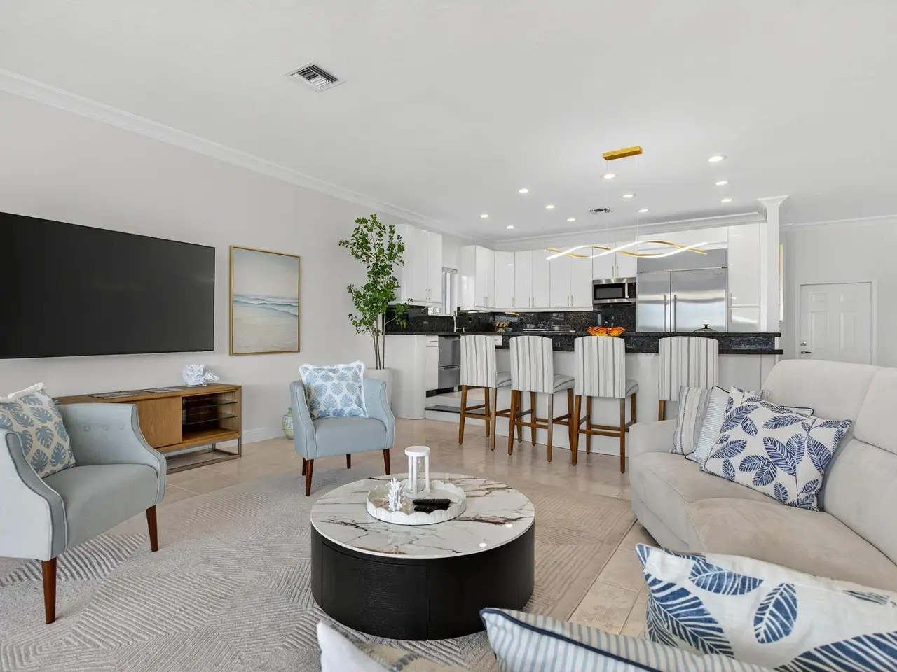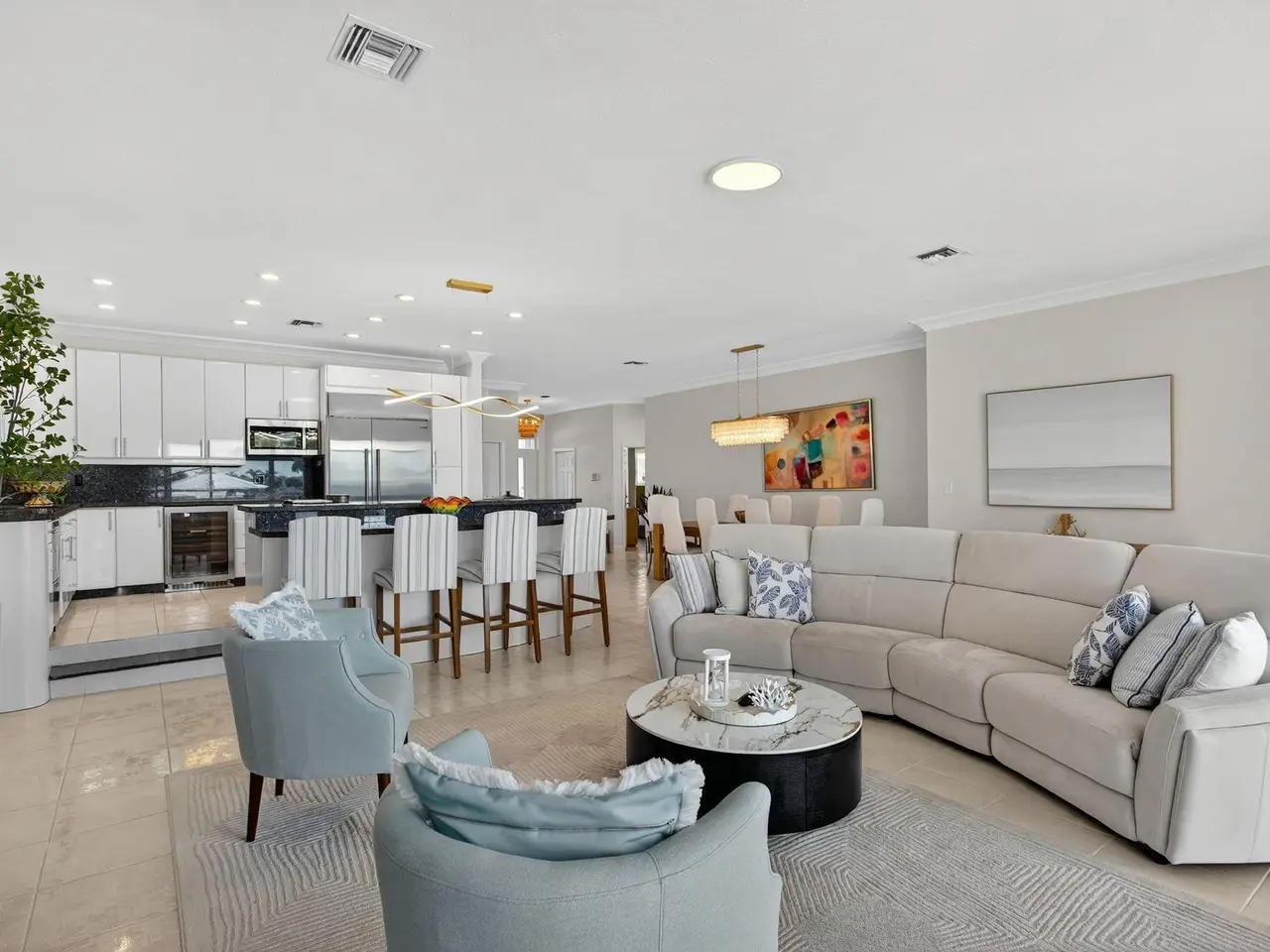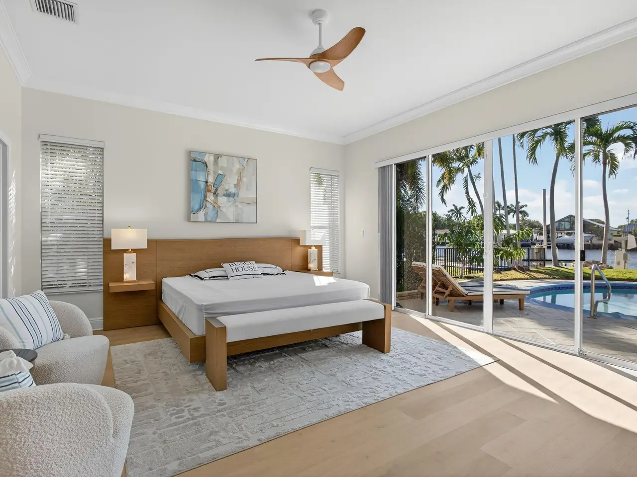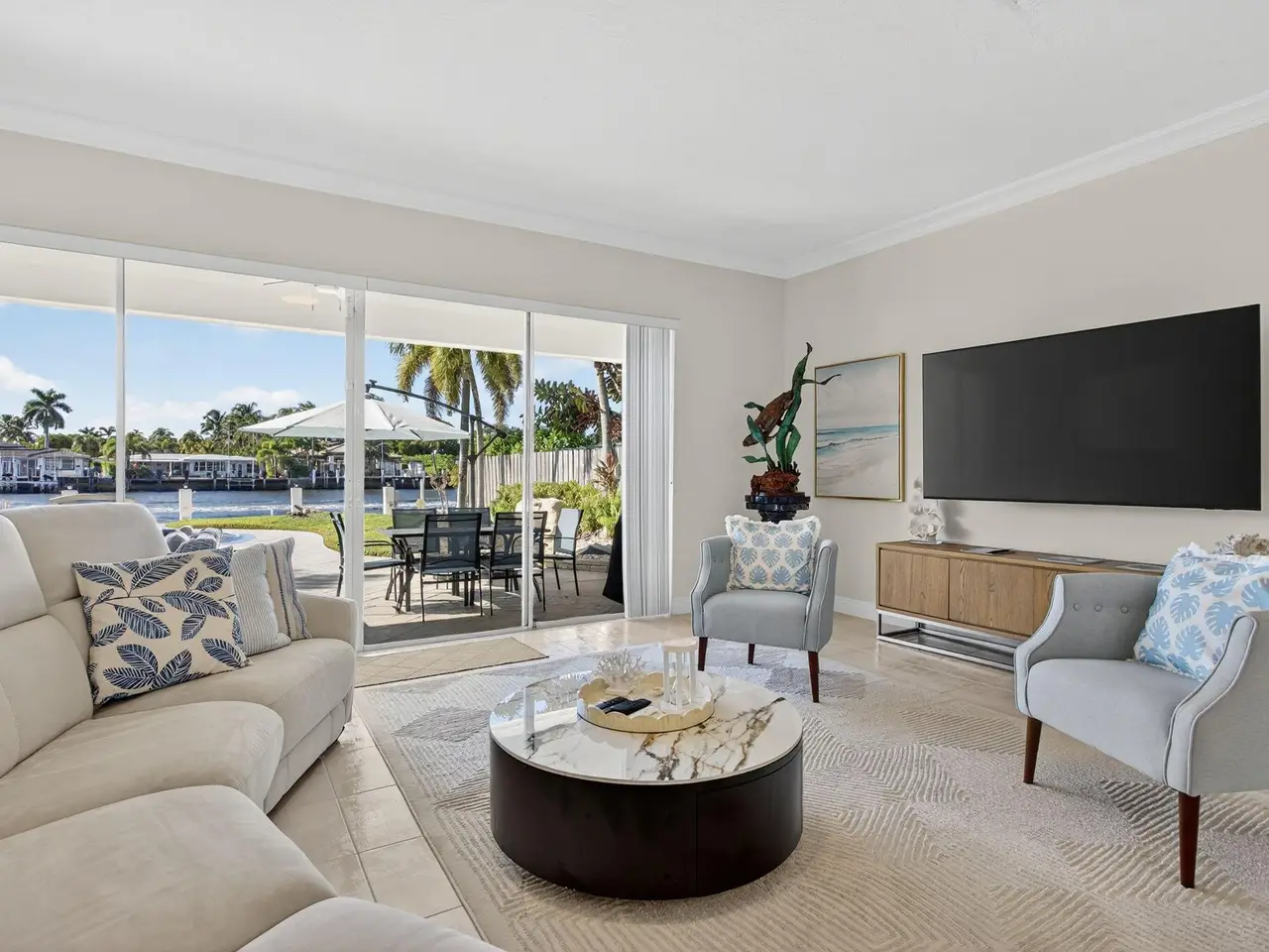 AIRBNB GOLD MINE. LUXE TURNKEY. Florida's sunshine living at it's very best! Stunning water views from inside. Gated house. Charming, fully renovated and furnished home directly on the Intracoastal. The dock has over 100ft of water frontage, with a lift to accommodate 4 jet skis. Open concept and airy coastal home with a high ceiling and high sliding doors. The master suite, living, and kitchen overlooks the intra-coastal. High-end appliances: Sub-Zero fridge wine cooler, and Gaggenau cooking station. Come to relax in a well-manicured waterfront backyard with a saltwater swimming pool and sitting areas to enjoy beautiful sunsets, passing boats, and tranquility of the Intracoastal. The house is a 5-minute walk to the beach and Pompano Beach Pier with all its entertainment & restaurants.