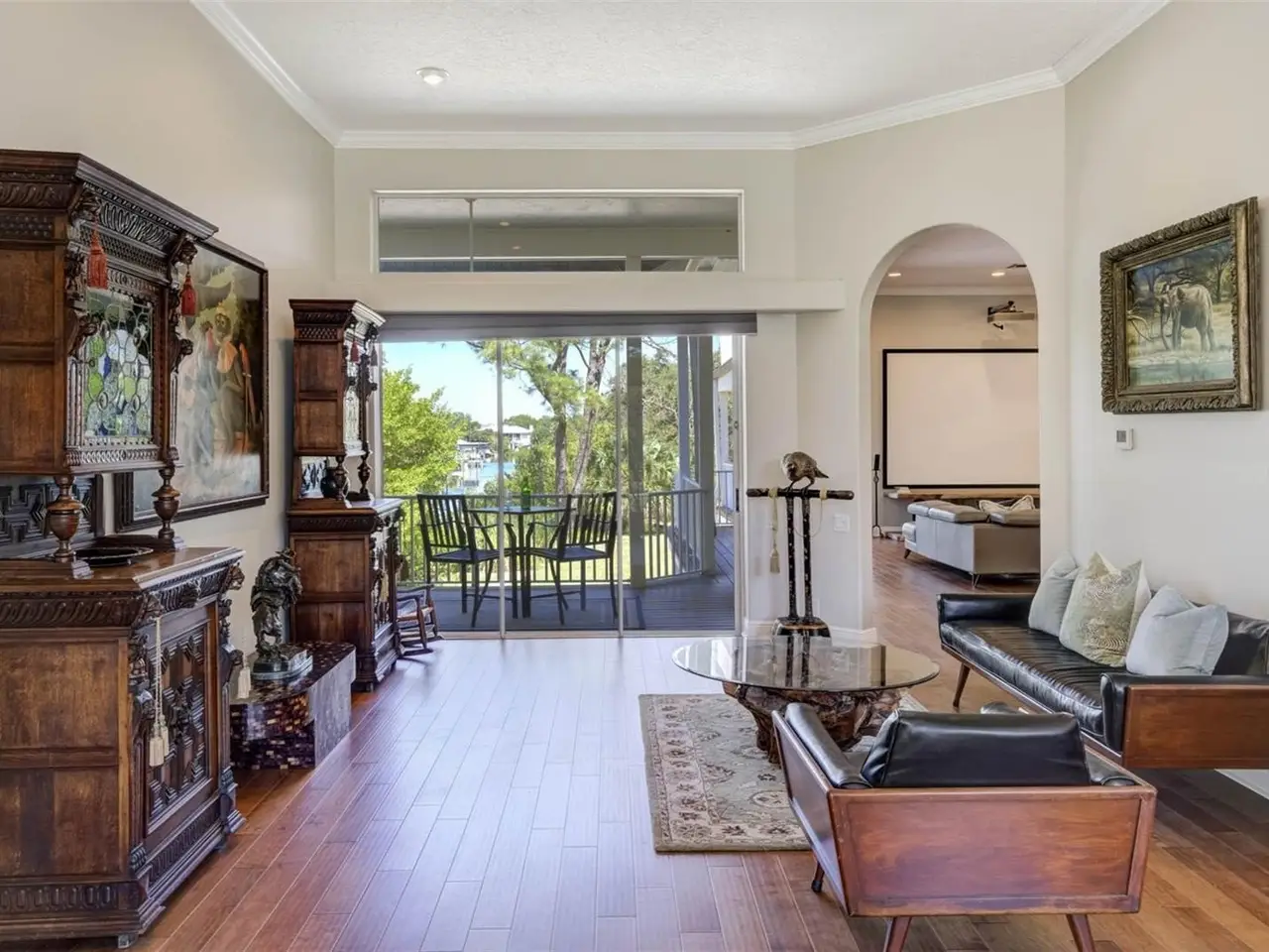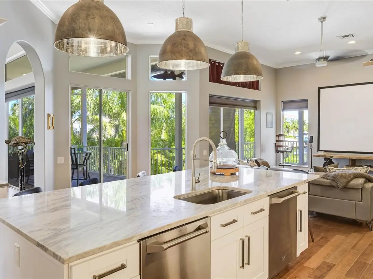 Experience the charm of this Crystal Beach PRIVATE, SPACIOUS HOME WITH DEEP WATER BOATING! This beautifully designed 4-bedroom, 3-bath waterfront home offering 2,924 square feet of living space. The home is set on boatable water and features a private dock with a 10,000 lb. lift, making it ideal for fishing, boating, or sunset cruises right from your backyard. The property is surrounded by immense privacy, with the backyard opening to a peaceful county preserve, while the lot next door is also available for purchase, creating an even greater opportunity for seclusion or future expansion. Outdoor living is elevated with a fabulous travertine pool deck surrounding the sparkling PebbleTec pool, perfect for enjoying long Florida days in style. Expansive second- and third-story verandas capture tranquil views and coastal breezes, making them the perfect spots to unwind with a morning coffee or evening glass of wine. Inside, soaring 12-foot ceilings flood the home with natural light and a sense of grandeur, while a fully renovated chef’s kitchen combines contemporary finishes with top-of-the-line appliances, ideal for both everyday living and entertaining. Additional highlights include a projector TV setup, creating the perfect space for movie nights or game-day gatherings, and an oversized four-car garage with plenty of room for vehicles, golf carts, water toys, and extra storage. Located in the heart of one of the most desirable and charming Crystal Beach communities, this home embodies the perfect blend of privacy, character, and waterfront living — offering both a timeless retreat and an entertainer’s dream.