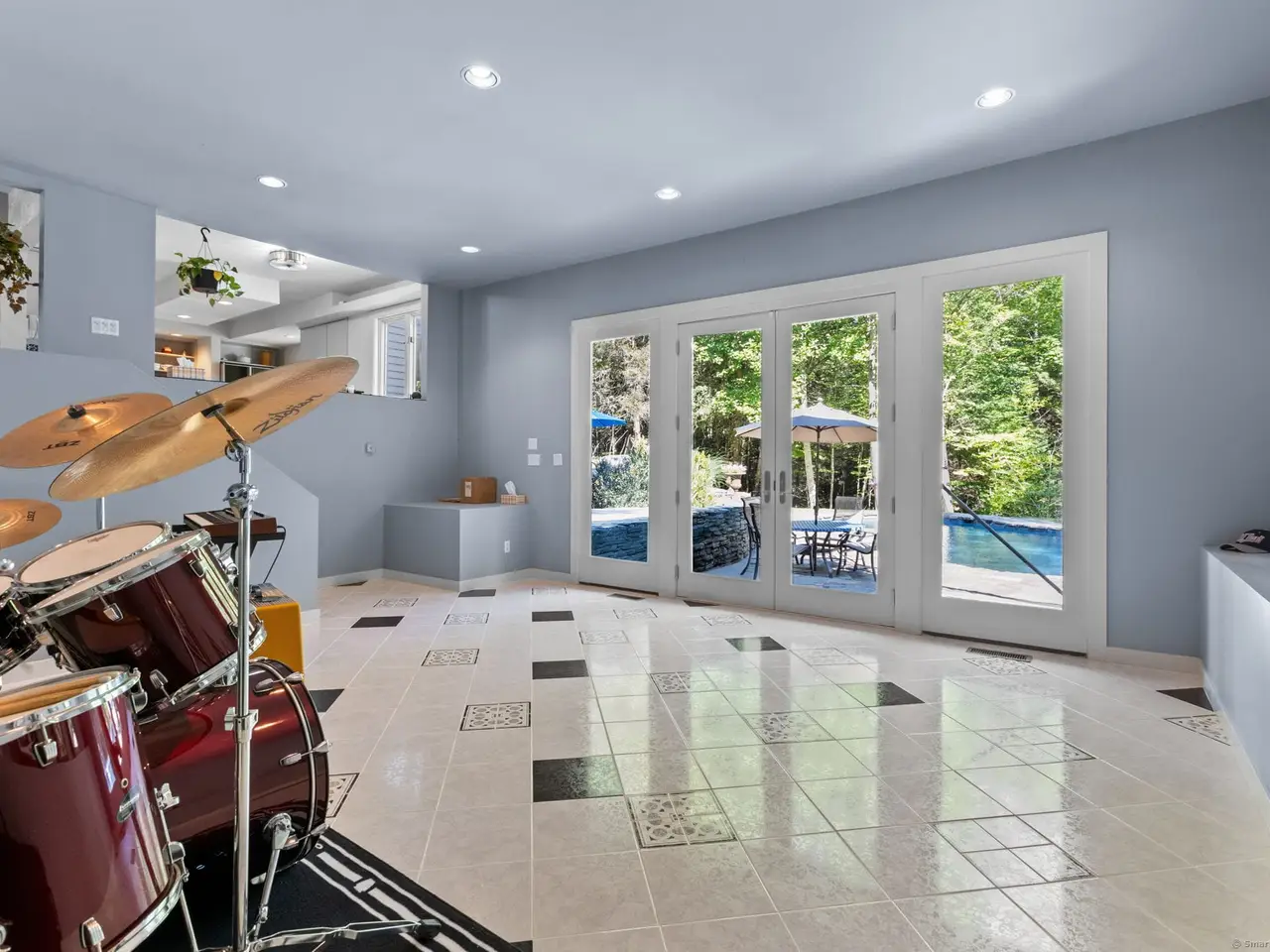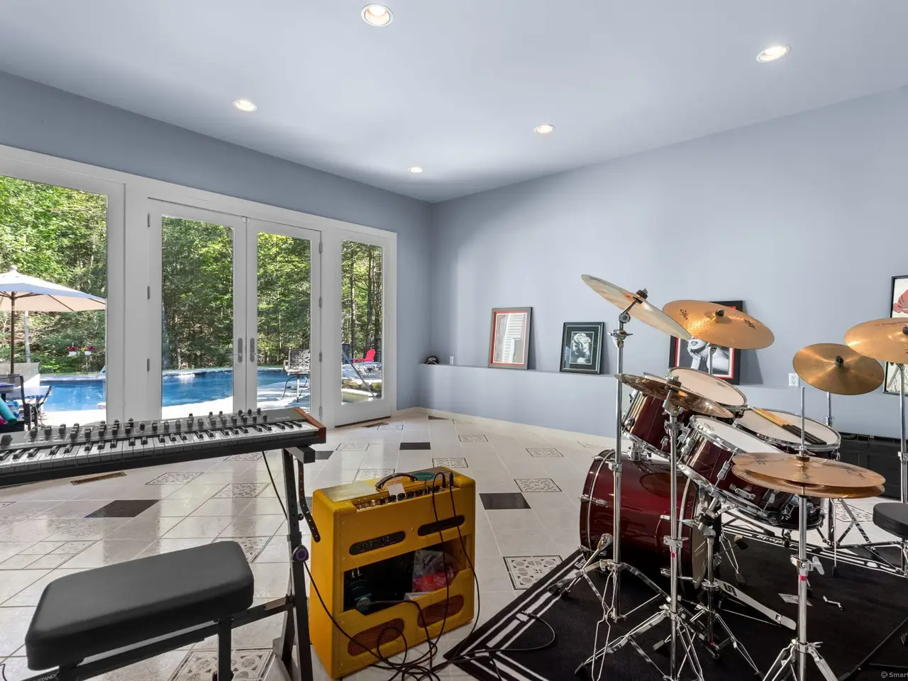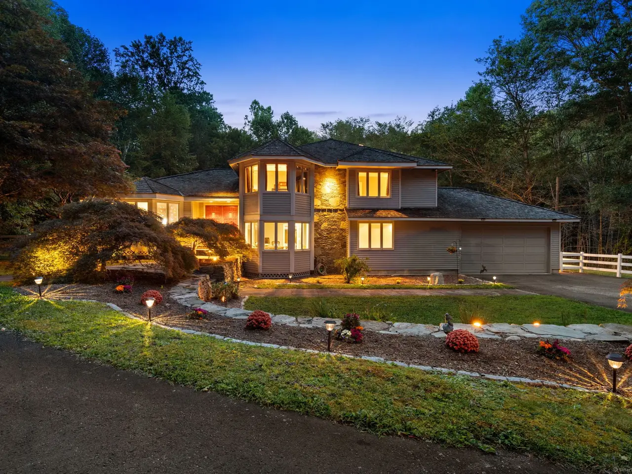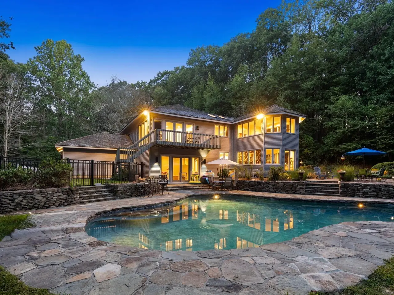 Tucked away in the picturesque hills of Litchfield County, right on the desirable Woodbury/Roxbury line, this stunning Colonial-Contemporary residence offers an unparalleled blend of privacy, natural beauty, and modern comfort on nearly 10 acres of pristine land. Surrounded by mature trees, vibrant plantings, and lush greenery, the property is enhanced by the gentle sounds of Transylvania Brook flowing just beyond the backyard, creating a truly tranquil and secluded setting. A long, paved, and beautifully lighted driveway welcomes you to this distinctive home, where a grand double-door entry opens to a spacious foyer complete with a unique indoor water feature. Inside, the home features three generously sized bedrooms, two and a half fully renovated bathrooms with luxurious Italian marble tile, and recessed lighting throughout. The thoughtfully designed layout includes a cozy lower-level family room with French doors that lead out to an expansive stone patio and a heated inground Gunite swimming pool, perfect for relaxing or entertaining. A bright four-season sunroom offers sweeping views of the surrounding landscape, while a dedicated office provides an ideal space for working from home. The impressive primary suite is a retreat in itself, featuring a walk-in closet, Jacuzzi tub, private balcony overlooking the pool, and a bonus room that can be customized to suit your needs, whether as a reading nook, home gym, or nursery. Additional highlights include a fenced-in yard,