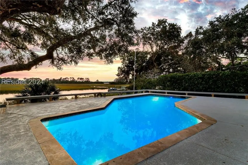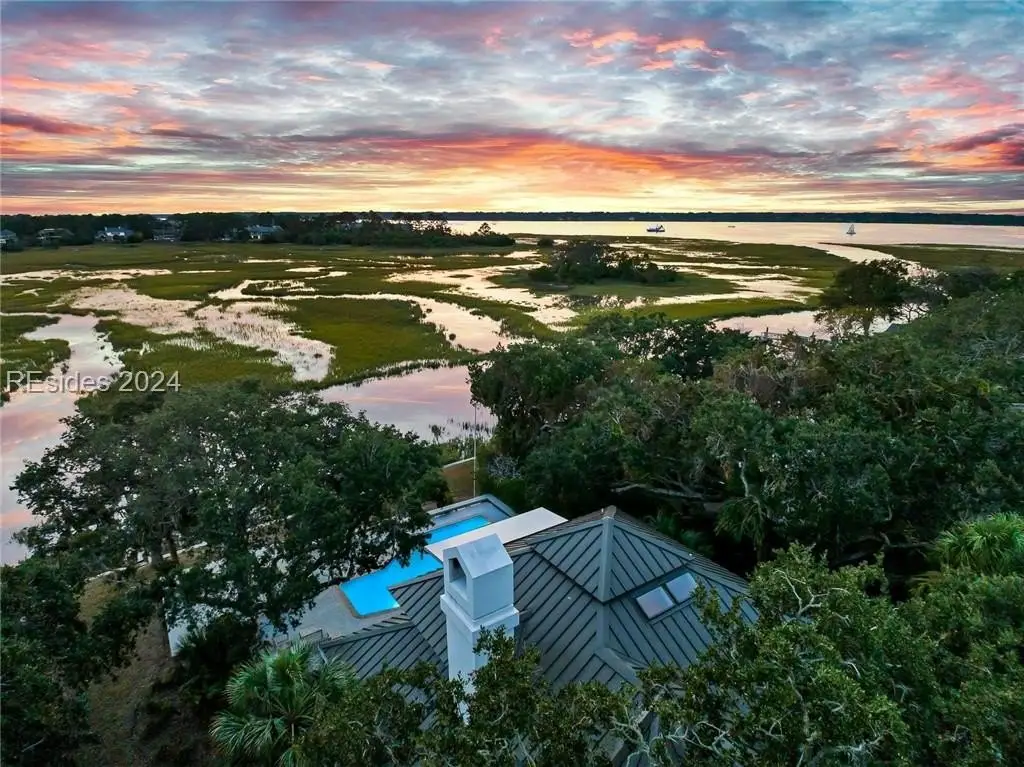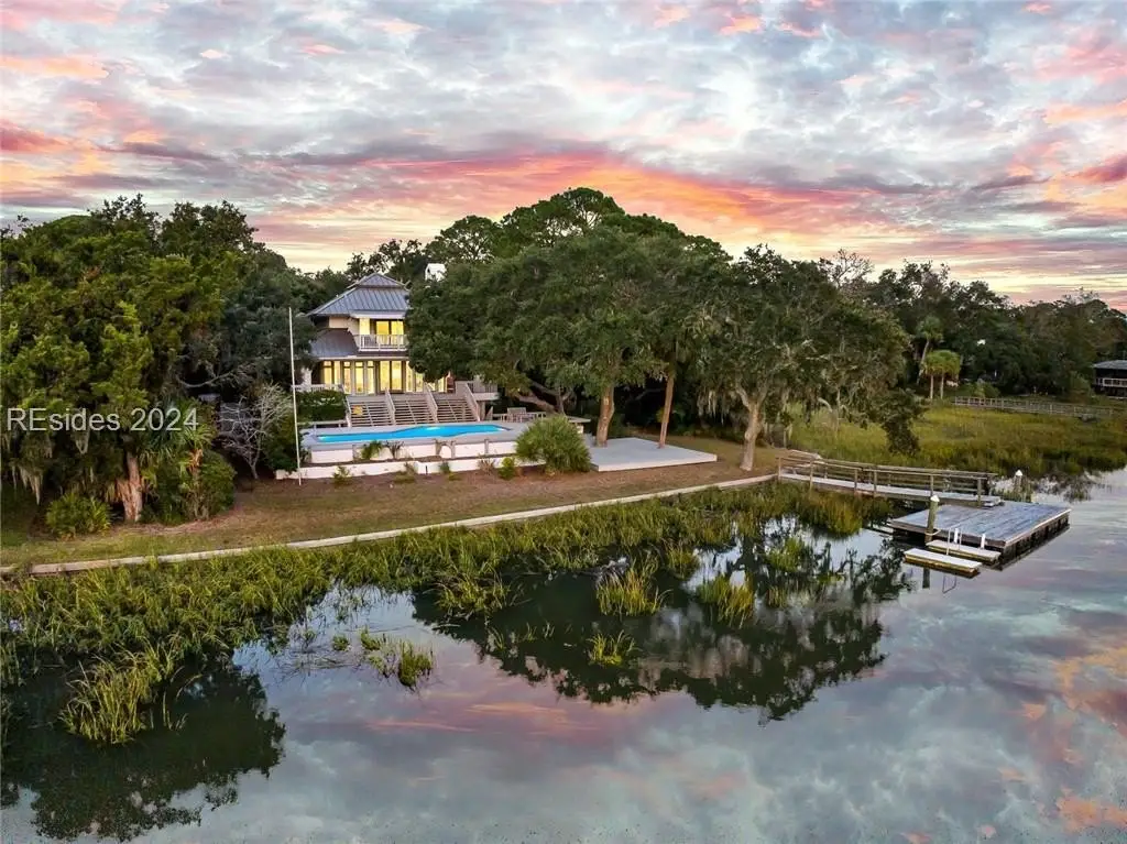 This one-of-a-kind property is privately sited on an almost acre lot with panoramic marsh and water views providing the perfect backdrop for spectacular sunsets. Kermit Huggins, a renowned architect, designed this property with 2 structures that harmoniously co-exist with their natural surroundings. Special features include a new metal roof, hardwood flooring, pella windows/doors, renovated kitchen, and interior paint. The main house boasts a luxurious upper-level owner's suite, and the guest house has 2 en-suite bedrooms plus a kitchenette. Incredible outdoor living with a heated/cooled saltwater pool, expansive deck, and private dock. Waterfront Perfection!