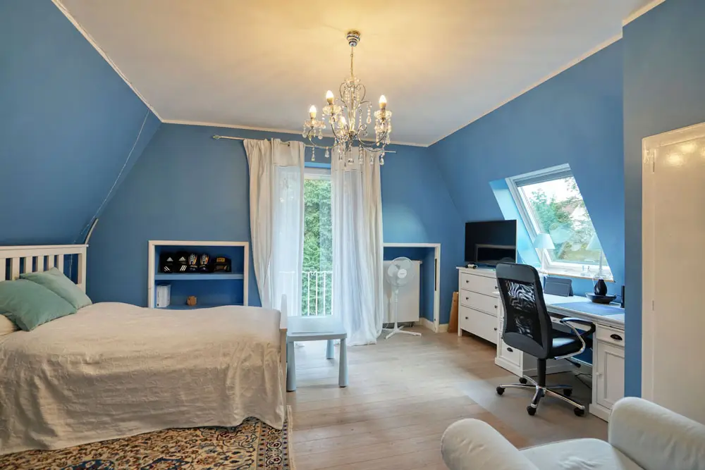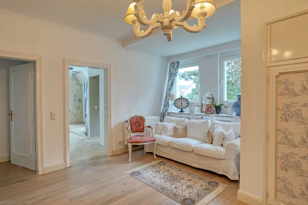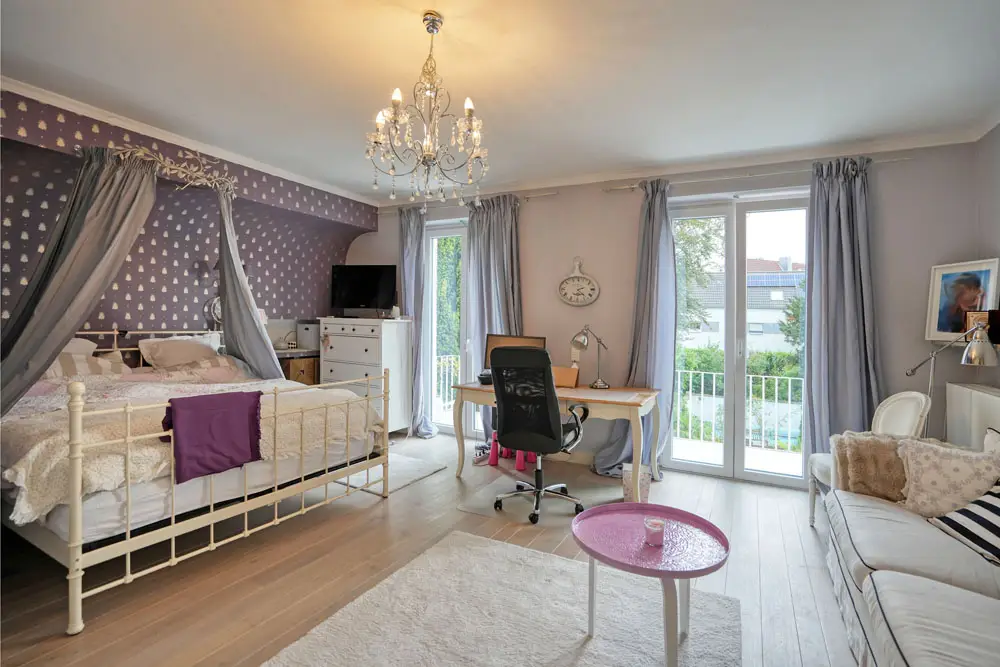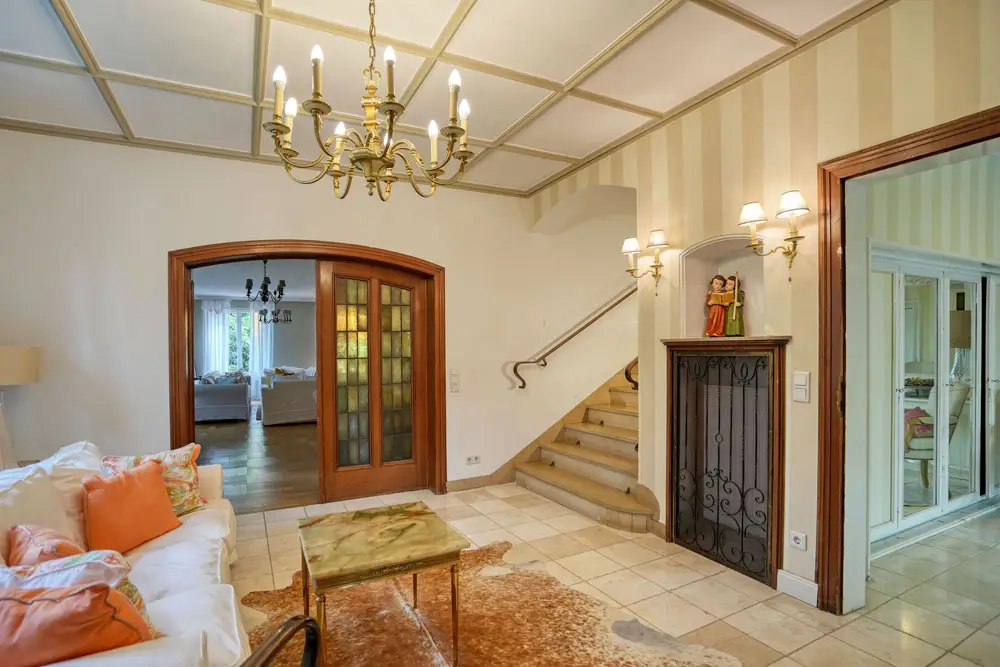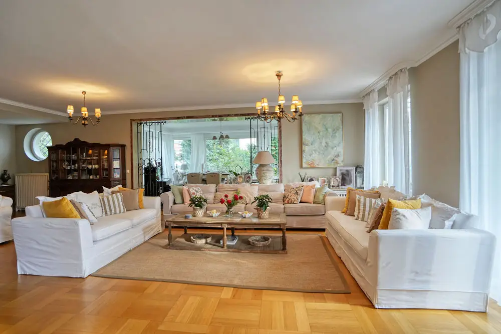 This exceptional property radiates great solidity. The generously proportioned detached house was built around 1951 in solid construction as a manufacturer's villa and furnished to a very high standard. It was extensively modernized in 2012-2015 and carefully maintained on an ongoing basis. It has a very bright and friendly design and is exceptionally well maintained. On the first floor, starting from the vestibule, there is a checkroom and guest WC on the right-hand side and a spacious hallway with the staircase to the upper floor and access to the spacious living area on the left-hand side. This is equipped with a fireplace and has a conservatory-like room attached to the side. From the living room and the adjoining dining room there is access to the very large terrace and from there to the park-like garden. The dining room is adjoined by the well-equipped kitchen, which offers space for a further dining table. On the upper floor, the central hallway provides access to the three children's or guest bedrooms, the children's bathroom and the parents' area. This consists of a dressing room in the transition to the large bedroom and the bathroom, which is equipped with a large shower area and free-standing bathtub, two washbasins, WC and bidet. All bedrooms have access to balconies of various sizes. The loft is completely converted into a living area and offers plenty of space for playing and/or working. There is also a shower room here. The full basement offers plenty of space for the utility rooms as well as for a living room-like room that is used as a home office. The garden has park-like dimensions and is attractively landscaped, with spacious lawns, shrubs and an outdoor pool, which is currently disused. A car garage and several parking spaces in front of the house round off the offer. Part of the plot could optionally be separated off for further development. An energy certificate is currently being prepared.