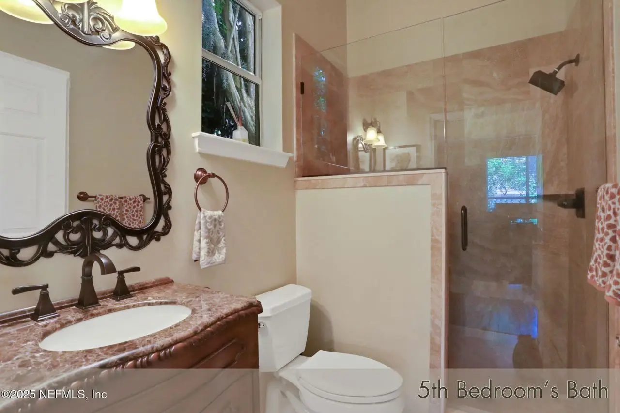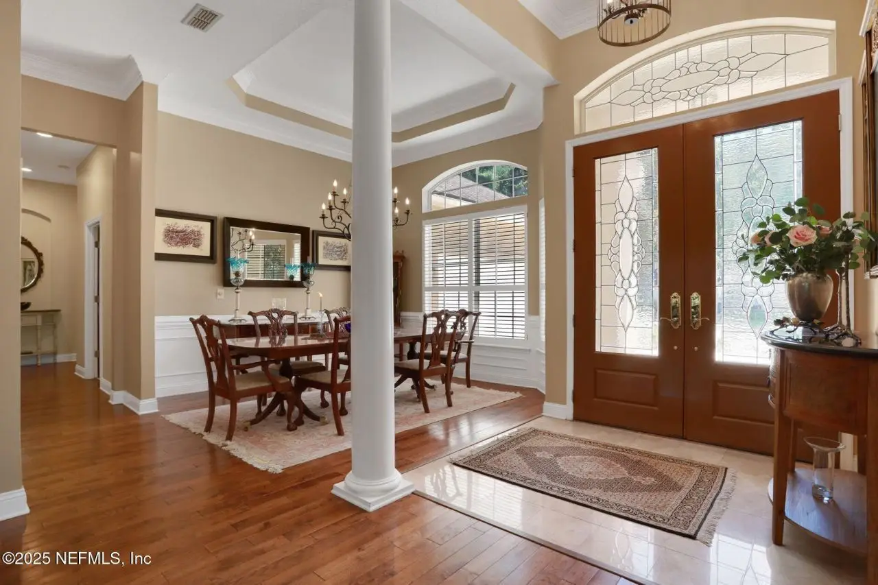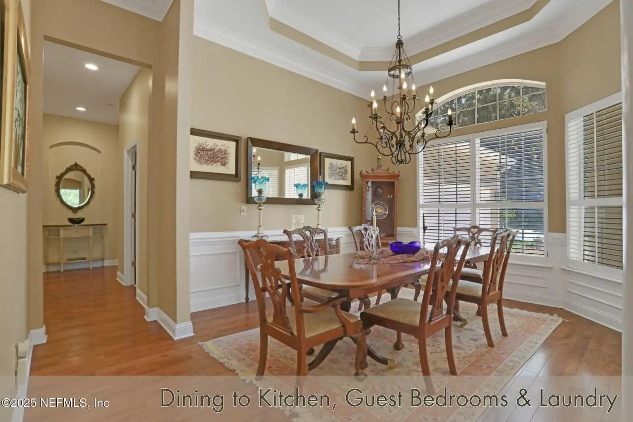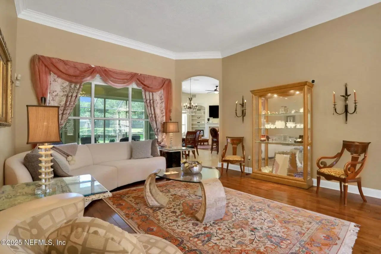 This gorgeous home sits pretty on a spacious lot overlooking the Mark McCumber designed championship golf course in the exclusive gated community of Queen's Harbour. It has five ensuite bedrooms and over 3,300 sq ft of indoor living space. An added bonus is the 860 sq ft of screened outdoor living complete with an inground pool and spa. This home has room for everyone. Pull up the expanded paver driveway and you'll immediately notice the charming courtyard entry garage. The magnificent eight-foot leaded glass double doors topped with an arched transom window create a grand entrance that floods the foyer, living room, and dining room with natural light. Step inside and prepare to be wowed by the incredible water-to-golf course views through the living room's wall of windows. The large-format travertine and gleaming engineered wood floors throughout the main level add an elegant touch that's both beautiful and practical. The spacious dining room can and has hosted dinner parties for twelve or more, making it perfect for entertaining. But the real showstopper is the Great Room, which truly serves as the heart of this home. This naturally-lit space features a wall of windows and glass doors with fabulous water-to-golf views from every angle. The luxuriously updated kitchen is a chef's paradise with a huge island that seats six for dining and gathering space for more. The breakfast nook and comfortable den with gas marble hearth fireplace paired with an arched floor-to-ceiling custom wood display cabinet complete this amazing space.The furniture-inspired Thomasville Custom Cabinetry with two-tier stacked upper cabinets features a glass display gallery to showcase all of for your attractive dishware and collectibles. Soft-close doors, custom inserts, and soft-glide drawers highlight the quality construction. The exotic and rare double straight-edge granite countertops with matching seamless backsplash create a cohesive, designer-inspired look.Two built-in tumbled travertine beverage stations add convenience and style. One serves as a coffee station while the other handles adult beverages, both feautue ambient lighting and custom glass shelving. The glass entry pantry closet with custom shelving keeps everything organized and clutter-free.The kitchen comes equipped with a top-of-the-line Thermador appliance package including a six-burner gas range topped with a limestone exhaust hood, seven-foot three-door French-style refrigerator, and Sapphire dishwasher.Off the great room, through the breakfast nook to the sun room featuring double sliders leading to the outdoor screened living space with sparkling pool and spa overlooking the park-like backyard and long views of the golf course. A huge open patio extends the outdoor entertainment options even further.The thoughtful three-way split bedroom floor plan works perfectly for multi-generational living. The primary bedroom, located just off the foyer, features a vestibuled entry with an oversized bedroom on one side and a resort-style bath on the other. This tremendous bathroom includes a soaker tub, oversized shower, two separate vanities, water closet, and two walk-in closets. The sleeping area has a generously sized sitting area with French doors to the sun room and pool.On the opposite side of the home, the guest bedroom wing includes bedrooms two and three sharing a Jack and Jill bath with double sinks and linen closet. Both bedrooms are generously sized, with one featuring a walk-in clos