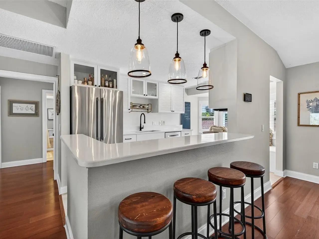 This is the home that delivers everything Florida living is meant to be. Perfectly situated on a corner lot just a three-minute walk to the beach, it embodies the sun-drenched, laid-back elegance of Belleair Beach. Styled in the soft, soothing hues of a modern coastal cottage, the home blends timeless design with contemporary comfort. Recent upgrades include hurricane-rated Pella impact windows and French doors, a new saltwater pool, and luxury finishes throughout—each choice reflecting thoughtful attention to safety, durability, and style. The spacious first level invites both quiet relaxation and lively gatherings. A custom wet bar with quartz countertops and soft-close cabinetry makes entertaining effortless, while the light-filled living area opens through impact-rated French doors to the pool deck. Outside, the saltwater pool and lounge area feature remote-controlled privacy and sun shades, creating an ideal retreat at any time of day. Upstairs, a smart split floor plan seamlessly connects open gathering spaces with private retreats. The chef’s kitchen showcases high-end appliances and refined details, and the front balcony fills the home with natural light while offering tranquil sky views and glimpses of the Gulf above the treetops—the perfect spot for morning coffee or sunset cocktails. (A complete list of updates and upgrades is available upon request.) Beyond the home, Belleair Beach elevates everyday living. You won’t find large crowds here—just cool, soft sand and the warm Gulf waters. Residents enjoy permit-only access to four resident beach parking lots, making spontaneous beach days a breeze. Morgan Park and multiple beach access points are within walking distance for those who love to put their toes in the sand. A short stroll away, Bayside Park features an active community center with tennis and basketball courts, a children’s playground, and bay access for boating, fishing, and more. Nearby fishing piers and neighborhood parks are only blocks away, perfect for evening strolls or a relaxing end to the day. Just pack your beach bag and wander to the shoreline—or return home to your private poolside haven. Don’t miss this rare opportunity to make this Belleair Beach treasure your everyday getaway, where ordinary days become extraordinary.